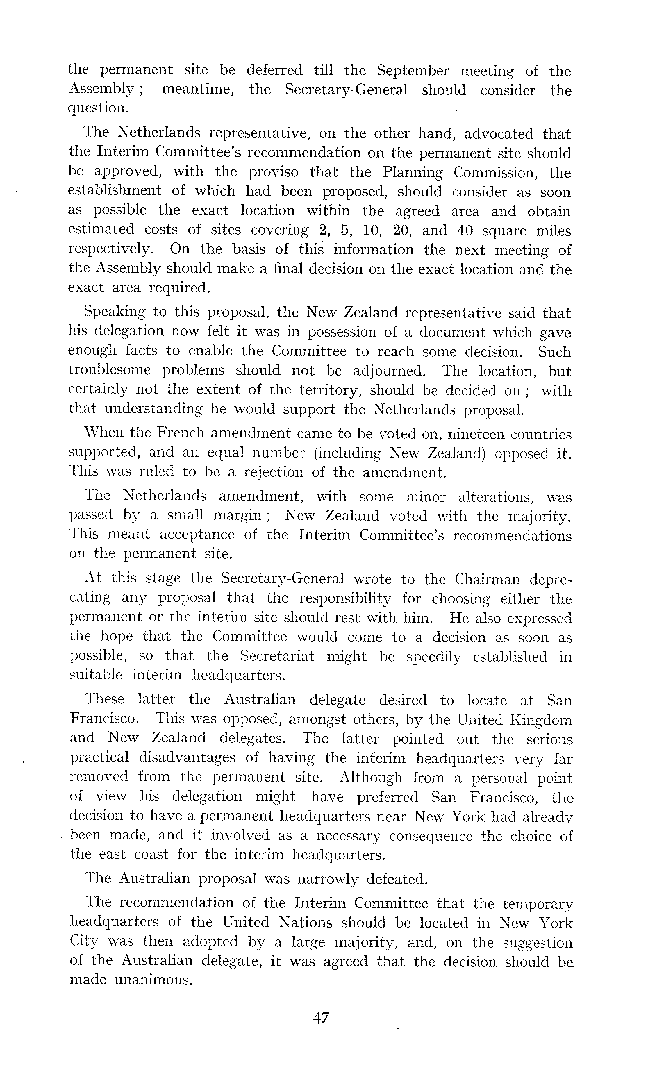 the permanent site be deferred till the September meeting of the Assembly; meantime, the Secretary-General should consider the question. The Netherlands representative, on the other hand, advocated that the Interim Committee's recommendation on the permanent site should be approved, with the proviso that the Planning Commission, the establishment of which had been proposed, should consider as soon as possible the exact location within the agreed area and obtain estimated costs of sites covering 2, 5, 10, 20, and 40 square miles respectively. On the basis of this information the next meeting of the Assembly should make a final decision on the exact location and the exact area required. Speaking to this proposal, the New Zealand representative said that his delegation now felt it was in possession of a document which gave enough facts to enable the Committee to reach some decision. Such troublesome problems should not be adjourned. The location, but certainly not the extent of the territory, should be decided on ; with that understanding he would support the Netherlands proposal. When the French amendment came to be voted on, nineteen countries supported, and an equal number (including New Zealand) opposed it. This was ruled to be a rejection of the amendment. The Netherlands amendment, with some minor alterations, was passed by a small margin ; New Zealand voted with the majority. This meant acceptance of the Interim Committee's recommendations on the permanent site. At this stage the Secretary-General wrote to the Chairman deprecating any proposal that the responsibility for choosing either the permanent or the interim site should rest with him. He also expressed the hope that the Committee would come to a decision as soon as possible, so that the Secretariat might be speedily established in suitable interim headquarters. These latter the Australian delegate desired to locate at San Francisco. This was opposed, amongst others, by the United Kingdom and New Zealand delegates. The latter pointed out the serious practical disadvantages of having the interim headquarters very far removed from the permanent site. Although from a personal point of view his delegation might have preferred -San Francisco, the decision to have a permanent headquarters near New York had already been made, and it involved as a necessary consequence the choice of the east coast for the interim headquarters. The Australian proposal was narrowly defeated. The recommendation of the Interim Committee that the temporary headquarters of the United Nations should be located in New York City was then adopted by a large majority, and, on the suggestion of the Australian delegate, it was agreed that the decision should be made unanimous.