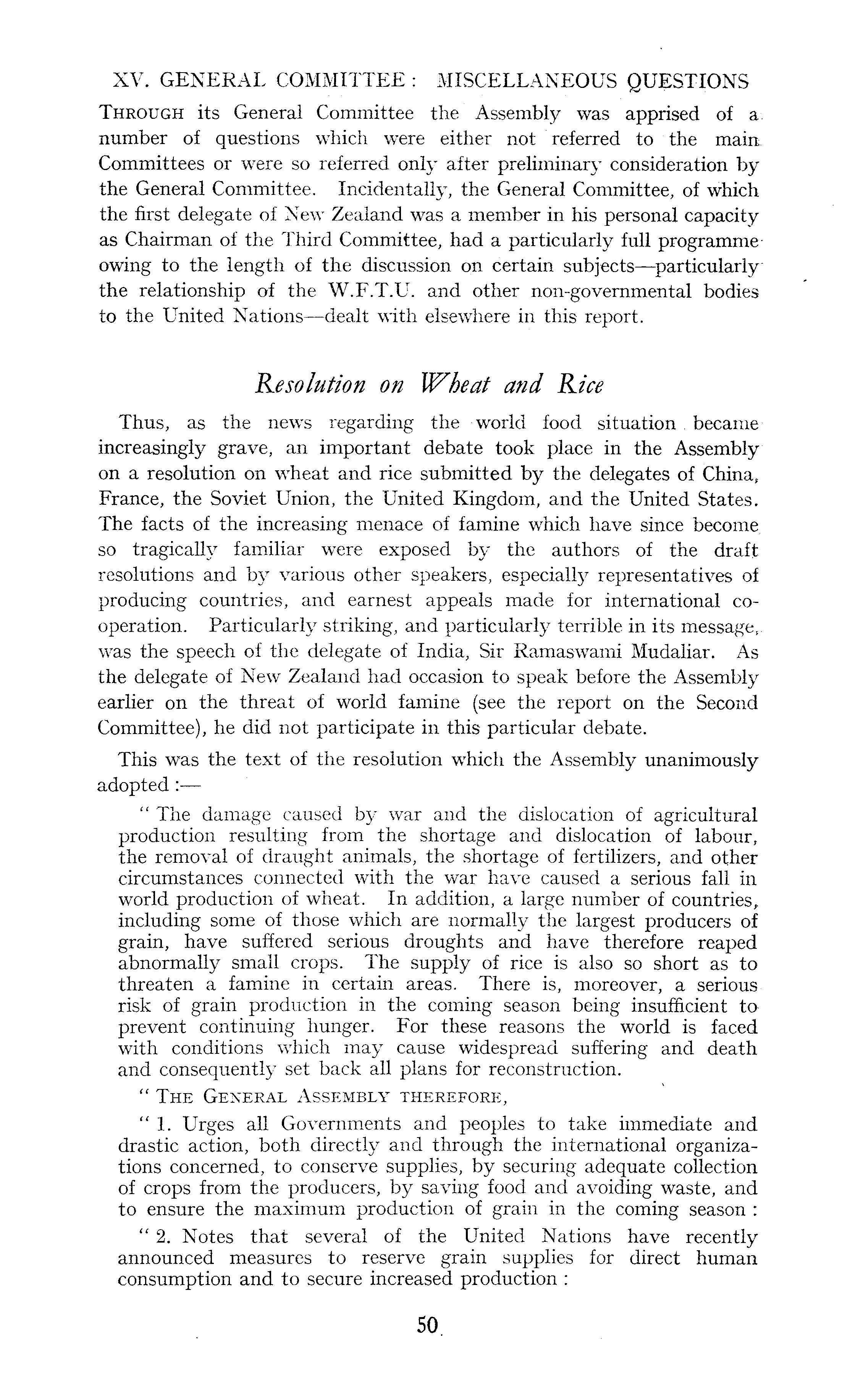 XV. GENERAL COMMITTEE: MISCELLANEOUS QUESTIONS Through its General Committee the Assembly was apprised of as number of questions which were either not referred to the main. Committees or were so referred only after preliminary consideration by the General Committee. Incidentally, the General Committee, of which the first delegate of New Zealand was a member in his personal capacity as Chairman of the Third Committee, had a particularly full programme owing to the length of the discussion on certain subjects—particularly the relationship of the W.F.T.U. and other non-governmental bodies to the United Nations —dealt with elsewhere in this report. Resolution on Wheat and Rice Thus, as the news regarding the world food situation becameincreasingly grave, an important debate took place in the Assembly on a resolution on wheat and rice submitted by the delegates of China,. France, the Soviet Union, the United Kingdom, and the United States. The facts of the increasing menace of famine which have since become so tragically familiar were exposed by the authors of the draft resolutions and by various other speakers, especially representatives of producing countries, and earnest appeals made for international cooperation. Particularly striking, and particularly terrible in its message,, was the speech of the delegate of India, Sir Ramaswami Mudaliar. As the delegate of New Zealand had occasion to speak before the Assembly earlier on the threat of world famine (see the report on the Second Committee), he did not participate in this particular debate. This was the text of the resolution which the Assembly unanimously adopted: — " The damage caused by war and the dislocation of agricultural production resulting from the shortage and dislocation of labour, the removal of draught animals, the shortage of fertilizers, and other circumstances connected with the war have caused a serious fall in world production of wheat. In addition, a large number of countries,, including some of those which are normally the largest producers of grain, have suffered serious droughts and have therefore reaped abnormally small crops. The supply of rice is also so short as to threaten a famine in certain areas. There is, moreover, a serious risk of grain production in the coming season being insufficient to prevent continuing hunger. For these reasons the world is faced with conditions which may cause widespread suffering and death and consequently set back all plans for reconstruction. "The General Assembly therefore, "I. Urges all Governments and peoples to take immediate and drastic action, both directly and through the international organizations concerned, to conserve supplies, by securing adequate collection of crops from the producers, by saving food and avoiding waste, and. to ensure the maximum production of grain in the coming season : "2. Notes that several of the United Nations have recently announced measures to reserve grain supplies for direct human, consumption and to secure increased production :