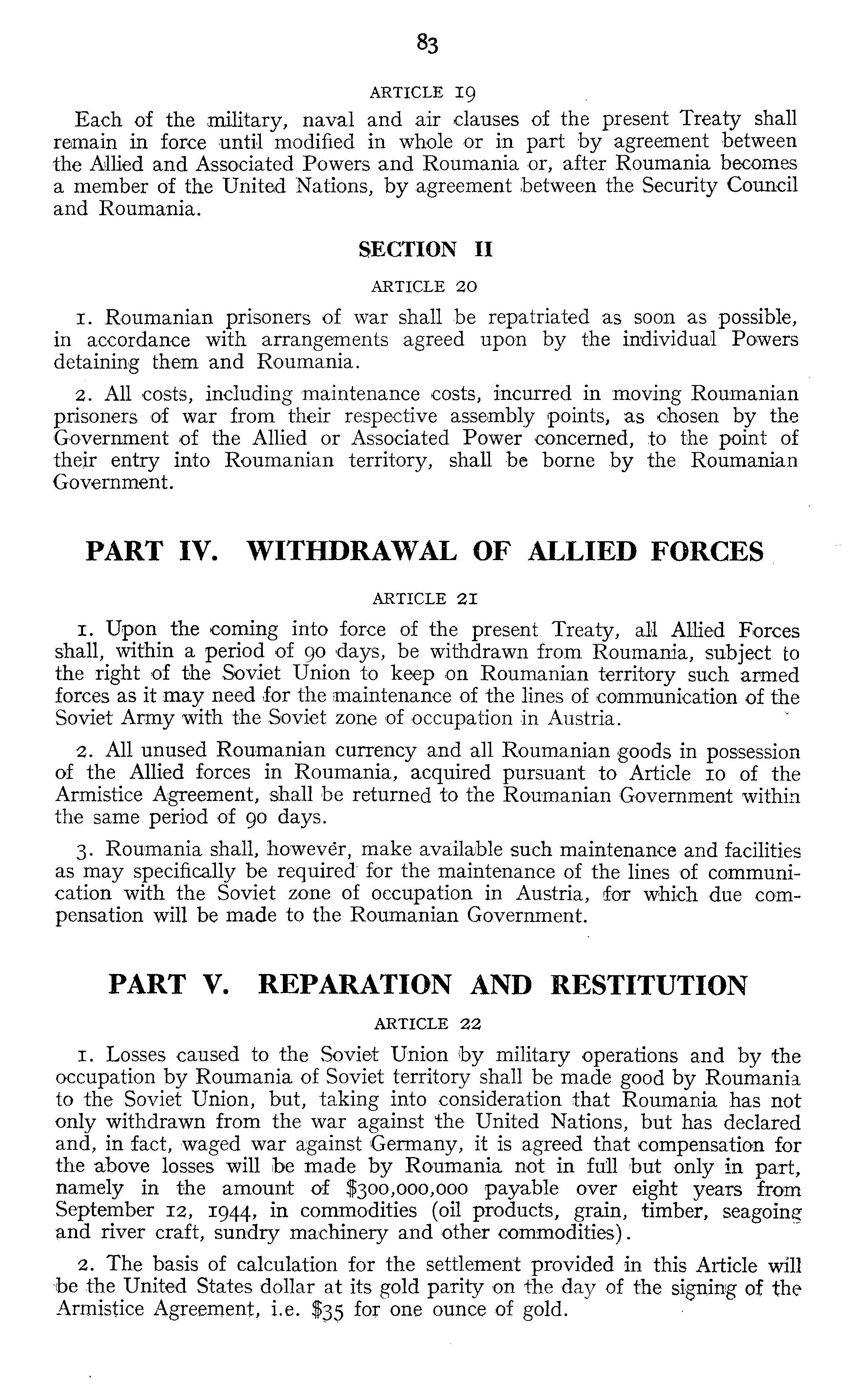 ARTICLE 19 Each of the military, naval and air clauses of the present Treaty shall remain in force until modified in whole or in part by agreement between the Allied and Associated Powers and Roumania or, after Roumania becomes a member of the United Nations, by agreement between the Security Council and Roumania. SECTION II ARTICLE 20 i. Roumanian prisoners of war shall be repatriated as soon as possible, in accordance with arrangements agreed upon by the individual Powers detaining them and Roumania. 2. All costs, including maintenance costs, incurred in moving Roumanian prisoners of war from their respective assembly points, as chosen by the Government of the Allied or Associated Power concerned, to the point of their entry into Roumanian territory, shall be borne by the Roumanian Government. PART IV. WITHDRAWAL OF ALLIED FORCES ARTICLE 21 i. Upon the coming into force of the present Treaty, all Allied Forces shall, within a period of 90 days, be withdrawn from Roumania, subject to the right of the Soviet Union to keep on Roumanian territory such armed forces as it may need for the maintenance of the lines of communication of the Soviet Army with the Soviet zone of occupation in Austria. 2. All unused Roumanian currency and all Roumanian goods in possession of the Allied forces in Roumania, acquired pursuant to Article 10 of the Armistice Agreement, shall be returned to the Roumanian Government within the same period of 90 days. 3. Roumania shall, however, make available such maintenance and facilities as may specifically be required for the maintenance of the lines of communication with the Soviet zone of occupation in Austria, for which due compensation will be made to the Roumanian Government. PART V. REPARATION AND RESTITUTION ARTICLE 22 1. Losses caused to the Soviet Union by military operations and by the occupation by Roumania of Soviet territory shall be made good by Roumania to the Soviet Union, but, taking into consideration that Roumania has not only withdrawn from the war against the United Nations, but has declared and, in fact, waged war against Germany, it is agreed that compensation for the above losses will be made by Roumania not in full but only in part, namely in the amount of $300,000,000 payable over eight years from September 12, 1944, in commodities (oil products, grain, timber, seagoing and river craft, sundry machinery and other commodities). 2. The basis of calculation for the settlement provided in this Article will •be the United States dollar at its gold parity on the day of the signing of the Armistice Agreement, i.e, $35 for one ounce of gold.