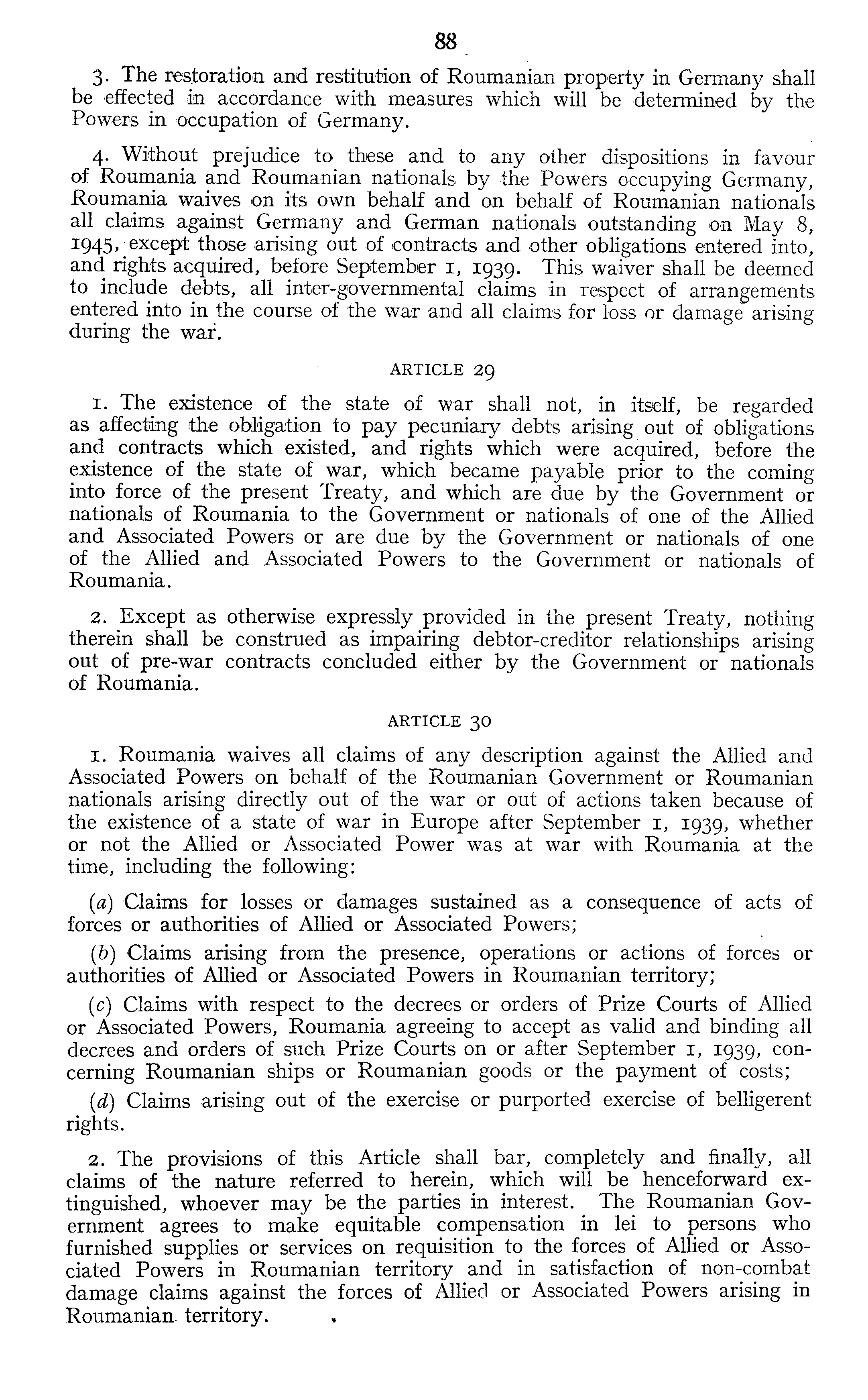 3< The restoration and restitution of Roumanian property in Germany shall be effected in accordance with measures which will be determined by the Powers in occupation of Germany. 4. Without prejudice to these and to any other dispositions in favour of Roumania and Roumanian nationals by the Powers occupying Germany, Roumania waives on its own behalf and on behalf of Roumanian nationals all claims against Germany and German nationals outstanding on May 8, 1945, except those arising out of contracts and other obligations entered into, and rights acquired, before September 1, 1939. This waiver shall be deemed to include debts, all inter-governmental claims in respect of arrangements entered into in the course of the war 'and all claims for loss or damage arising during the war. article 29 1. The existence of the state of war shall not, in itself, be regarded as affecting the obligation to pay pecuniary debts arising out of obligations and contracts which existed, and rights which were acquired, before the existence of the state of war, which became payable prior to the coming into force of the present Treaty, and which are due by the Government or nationals of Roumania to the Government or nationals of one of the Allied and Associated Powers or are due by the Government or nationals of one of the Allied and Associated Powers to the Government or nationals of Roumania. 2. Except as otherwise expressly provided in the present Treaty, nothing therein shall be construed as impairing debtor-creditor relationships arising out of pre-war contracts concluded either by the Government or nationals of Roumania. article 30 1. Roumania waives all claims of any description against the Allied and Associated Powers on behalf of the Roumanian Government or Roumanian nationals arising directly out of the war or out of actions taken because of the existence of a state of war in Europe after September 1, 1939, whether or not the Allied or Associated Power was at war with Roumania at the time, including the following: (a) Claims for losses or damages sustained as a consequence of acts of forces or authorities of Allied or Associated Powers; (b) Claims arising from the presence, operations or actions of forces or authorities of Allied or Associated Powers in Roumanian territory; (c) Claims with respect to the decrees or orders of Prize Courts of Allied or Associated Powers, Roumania agreeing to accept as valid and binding all decrees and orders of such Prize Courts on or after September 1, 1939, concerning Roumanian ships or Roumanian goods or the payment of costs; (d) Claims arising out of the exercise or purported exercise of belligerent rights. 2. The provisions of this Article shall bar, completely and finally, all claims of the nature referred to herein, which will be henceforward extinguished, whoever may be the parties in interest. The Roumanian Government agrees to make equitable compensation in lei to persons who furnished supplies or services on requisition to the forces of Allied or Associated Powers in Roumanian territory and in satisfaction of non-combat damage claims against the forces of Allied or Associated Powers arising in Roumanian, territory.