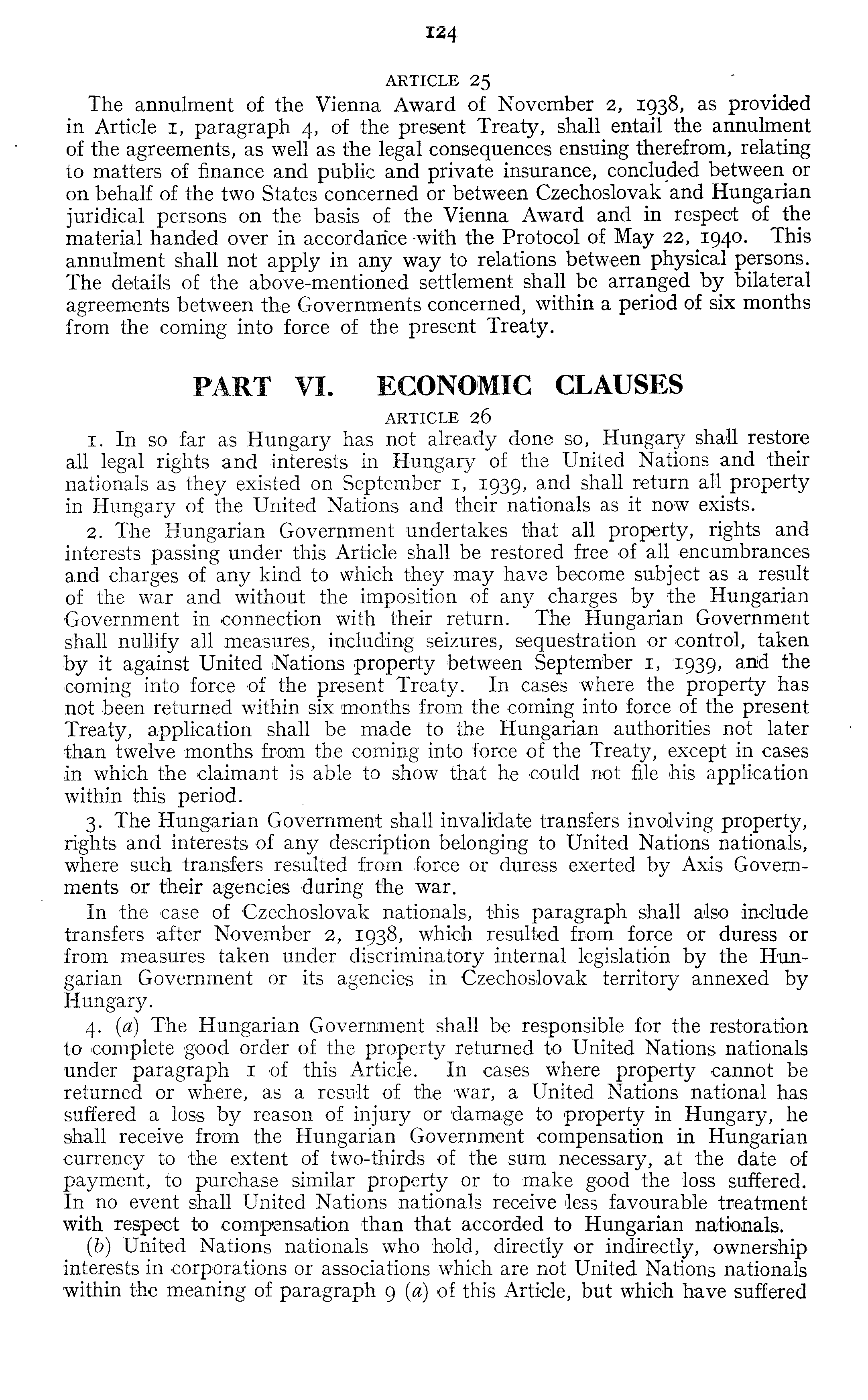ARTICLE 25 The annulment of the Vienna Award of November 2, 1938, as provided in Article 1, paragraph 4, of the present Treaty, shall entail the annulment of the agreements, as well as the legal consequences ensuing therefrom, relating to matters of finance and public and private insurance, concluded between or on behalf of the two States concerned or between Czechoslovak and Hungarian juridical persons on the basis of the Vienna Award and in respect of the material handed over in accordance with the Protocol of May 22, 1940. This annulment shall not apply in any way to relations between physical persons. The details of the above-mentioned settlement shall be arranged by bilateral agreements between the Governments concerned, within a period of six months from the coming into force of the present Treaty. PART VI. ECONOMIC CLAUSES ARTICLE 26 i. In so far as Hungary has. not already done so, Hungary shall restore all legal rights and interests in Hungary of the United Nations and their nationals as they existed on September 1, 1939, and shall return all property in Hungary of the United Nations and their nationals as it now exists. 2. The Hungarian Government undertakes that all property, rights and interests passing under this Article shall be restored free of all encumbrances and charges of any kind to which they may have become subject as a result of the war and without the imposition of any charges by the Hungarian Government in connection with their return. The Hungarian Government shall nullify all measures, including seizures, sequestration or control, taken by it against United Nations property between September 1, 1939, and the coming into force of the present Treaty. In cases where the property has not been returned within six months from the coming into force of the present Treaty, application shall be made to the Hungarian authorities not later than twelve months from the coming into force of the Treaty, except in cases in which the claimant is able to show that he could not file his application within this period. 3. The Hungarian Government shall invalidate transfers involving property, rights and interests of any description belonging to United Nations nationals, where such transfers resulted from force or duress exerted by Axis Governments or their agencies during the war. In the case of Czechoslovak nationals, this paragraph shall also include transfers after November 2, 1938, which resulted from force or duress or from measures taken under discriminatory internal legislation by the Hungarian Government or its agencies in Czechoslovak territory annexed by Hungary. 4. (a) The Hungarian Government shall be responsible for the restoration to complete good order of the property returned to United Nations nationals under paragraph 1 of this Article. In cases where property cannot be returned or where, as a result of the war, a United Nations national has suffered a loss by reason of injury or damage to property in Hungary, he shall receive from the Hungarian Government compensation in Hungarian currency to the extent of two-thirds of the sum necessary, at the date of payment, to purchase similar property or to make good the loss suffered. In no event shall United Nations nationals receive less favourable treatment with respect to compensation than that accorded to Hungarian nationals. (b) United Nations nationals who hold, directly or indirectly, ownership interests in corporations or associations which are not United Nations nationals within the meaning of paragraph 9 (a) of this Article, but which have suffered