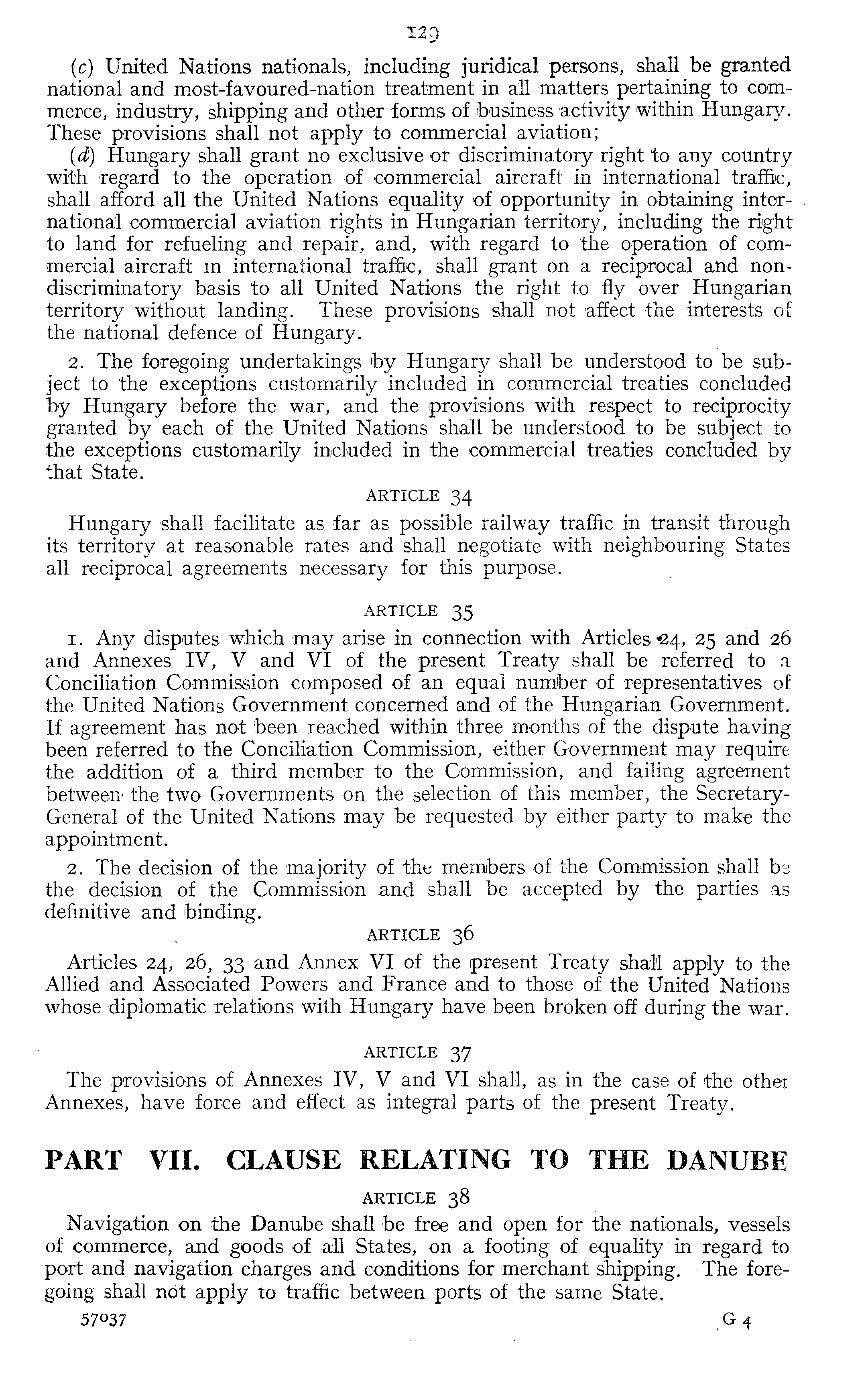 (c) United Nations nationals, including juridical persons, shall be granted national and most-favoured-nation treatment in all matters pertaining to commerce, industry, shipping and other forms of business activity within Hungary. These provisions shall not apply to commercial aviation; (d) Hungary shall grant no exclusive or discriminatory right to any country with regard to the operation of commercial aircraft in international traffic, shall afford all the United Nations equality of opportunity in obtaining international commercial aviation rights in Hungarian territory, including the right to land for refueling and repair, and, with regard to the operation of commercial aircraft in international traffic, shall grant on a reciprocal and nondiscriminatory basis to all United Nations the right to fly over Hungarian territory without landing. These provisions shall not affect the interests of the national defence of Hungary. 2. The foregoing undertakings by Hungary shall be understood to be subject to the exceptions customarily included in commercial treaties concluded by Hungary before the war, and the provisions with respect to reciprocity granted by each of the United Nations shall be understood to be subject to fiie exceptions customarily included in the commercial treaties concluded by that State. article 34 Hungary shall facilitate as far as possible railway traffic in transit through its territory at reasonable rates and shall negotiate with neighbouring States all reciprocal agreements necessary for this purpose. ARTICLE 35 i. Any disputes which may arise in connection with Articles 25 and 26 and Annexes IV, V and VI of the present Treaty shall be referred to a Conciliation Commission composed of an equal number of representatives of the United Nations Government concerned and of the Hungarian Government. If agreement has not been reached within three months of the dispute having been referred to the Conciliation Commission, either Government may require the addition of a third member to the Commission, and failing agreement between' the two Governments on the selection of this member, the SecretaryGeneral of the United Nations may be requested by either party to make the appointment. 2. The decision of the majority of the members of the Commission shall by the decision of the Commission and shall be accepted by the parties as definitive and binding. ARTICLE 36 Articles 24, 26, 33 and Annex VI of the present Treaty shall apply to the Allied and Associated Powers and France and to those of the United Nations whose diplomatic relations with Hungary have been broken off during the war. ARTICLE 37 The provisions of Annexes IV, V and VI shall, as in the case of the other Annexes, have force and effect as integral parts of the present Treaty. PART VII. CLAUSE RELATING TO THE DANUBE ARTICLE 38 Navigation on the Danube shall be free and open for the nationals, vessels of commerce, and goods of all States, on a footing of equality in regard to port and navigation charges and conditions for merchant shipping. The foregoing shall not apply to traffic between ports of the same State. ' 57°37 G4