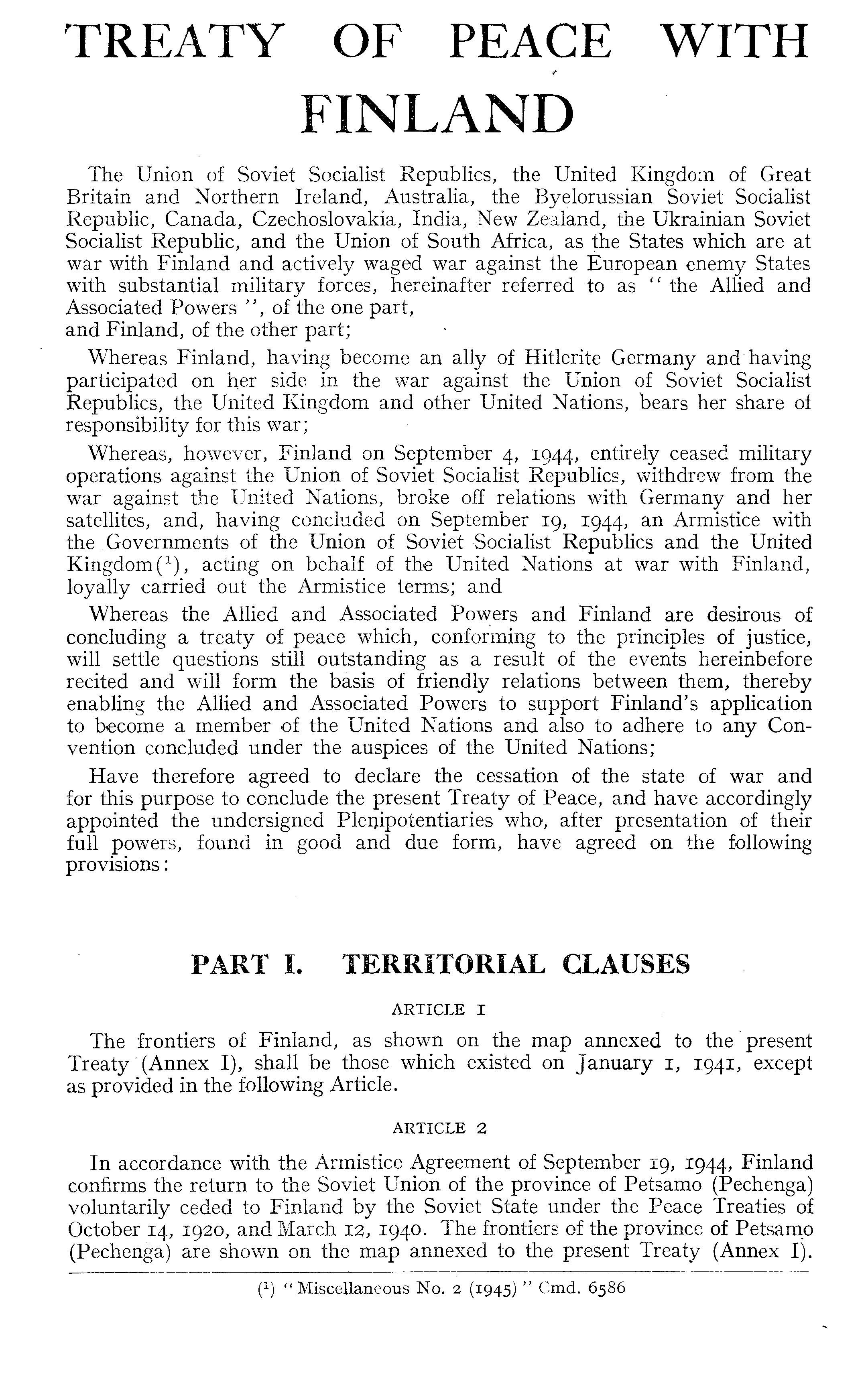 TREATY OF PEACE WITH FINLAND The Union of Soviet Socialist Republics, the United Kingdom of Great Britain and Northern Ireland, Australia, the Byelorussian Soviet Socialist Republic, Canada, Czechoslovakia, India, New Zealand, the Ukrainian Soviet Socialist Republic, and the Union of South Africa, as the States which are at war with Finland and actively waged war against the European enemy States with substantial military forces, hereinafter referred to as " the Allied and Associated Powers ", of the one part, and Finland, of the other part; Whereas Finland, having become an ally of Hitlerite Germany and having participated on her side in the war against the Union of Soviet Socialist Republics, the United Kingdom and other United Nations, bears her share oi responsibility for this war; Whereas, however, Finland on September 4, 1944, entirely ceased military operations against the Union of Soviet Socialist Republics, withdrew from the war against the United Nations, broke off relations with Germany and her satellites, and, having concluded on September 19, 1944, an Armistice with the Governments of the Union of Soviet Socialist Republics and the United Kingdom ( 1 ), acting on behalf of the United Nations at war with Finland, loyally carried out the Armistice terms; and Whereas the Allied and Associated Powers and Finland are desirous of concluding a treaty of peace which, conforming to the principles of justice, will settle questions still outstanding as a result of the events hereinbefore recited and will form the basis of friendly relations between them, thereby enabling the Allied and Associated Powers to support Finland's application to become a member of the United Nations and also to adhere to any Convention concluded under the auspices of the United Nations; Have therefore agreed to declare the cessation of the state of war and for this purpose to conclude the present Treaty of Peace, and have accordingly appointed the undersigned Plenipotentiaries who, after presentation of their full powers, found in good and due form, have agreed on the following provisions: PART I. TERRITORIAL CLAUSES ARTICLE I The frontiers of Finland, as shown on the map annexed to the "present Treaty' (Annex I), shall be those which existed on January 1, 1941, except as provided in the following Article. article 2 In accordance with the Armistice Agreement of September 19, 1944, Finland confirms the return to the Soviet Union of the province of Petsamo (Pechenga) voluntarily ceded to Finland by the Soviet State under the Peace Treaties of October 14, 1920, and March 12, 1940. The frontiers of the province of Petsamo (Pechenga) are shown on the map annexed to the present Treaty (Annex I).