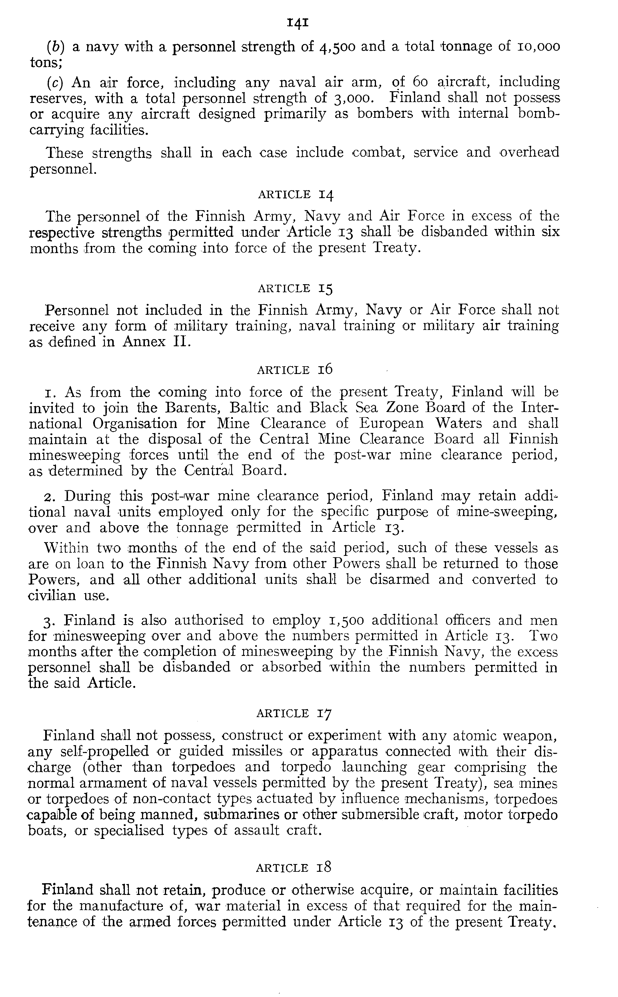 (b) a navy with a personnel strength of 4,500 and a total tonnage of 10,000 tons; (c) An air force, including any naval air arm, of 60 aircraft, including reserves, with a total personnel strength of 3,000. Finland shall not possess or acquire any aircraft designed primarily as bombers with internal bombcarrying facilities. These strengths shall in each case include combat, service and overhead personnel. ARTICLE 14 The personnel of the Finnish Army, Navy and Air Force in excess of the respective strengths permitted under Article 13 shall be disbanded within six months from the coming into force of the present Treaty. ARTICLE 15 Personnel not included in the Finnish Army, Navy or Air Force shall not receive any form of military training, naval training or military air training as defined in Annex 11. article 16 1. As from the coming into force of the present Treaty, Finland will be invited to join the Barents, Baltic and Black Sea Zone Board of the International Organisation for Mine Clearance of European Waters and shall maintain at the disposal of the Central Mine Clearance Board all Finnish minesweeping forces until the end of the post-war mine clearance period, as determined by the Central Board. 2. During this post-war mine clearance period, Finland may retain additional naval units employed only for the specific purpose of mine-sweeping, over and above the tonnage permitted in Article 13. Within two months of the end of the said period, such of these vessels as are on loan to the Finnish Navy from other Powers shall be returned to those Powers, and all other additional units shall be disarmed and converted to civilian use. 3. Finland is also authorised to employ 1,500 additional officers and men for minesweeping over and above the numbers permitted in Article 13. Two months after the completion of minesweeping by the Finnish Navy, the excess personnel shall be disbanded or absorbed within the numbers permitted in the said Article. ARTICLE 17 Finland shall not possess, construct or experiment with any atomic weapon, any self-propelled or guided missiles or apparatus connected with their discharge (other than torpedoes and torpedo launching gear comprising the normal armament of naval vessels permitted by the present Treaty), sea mines or torpedoes of non-contact types actuated by influence mechanisms, torpedoes capable of being manned, submarines or other submersible craft, motor torpedo boats, or specialised types of assault craft. ARTICLE l 8 Finland shall not retain, produce or otherwise acquire, or maintain facilities for the manufacture of, war material in excess of that required for the maintenance of the armed forces permitted under Article 13 of the present Treaty,