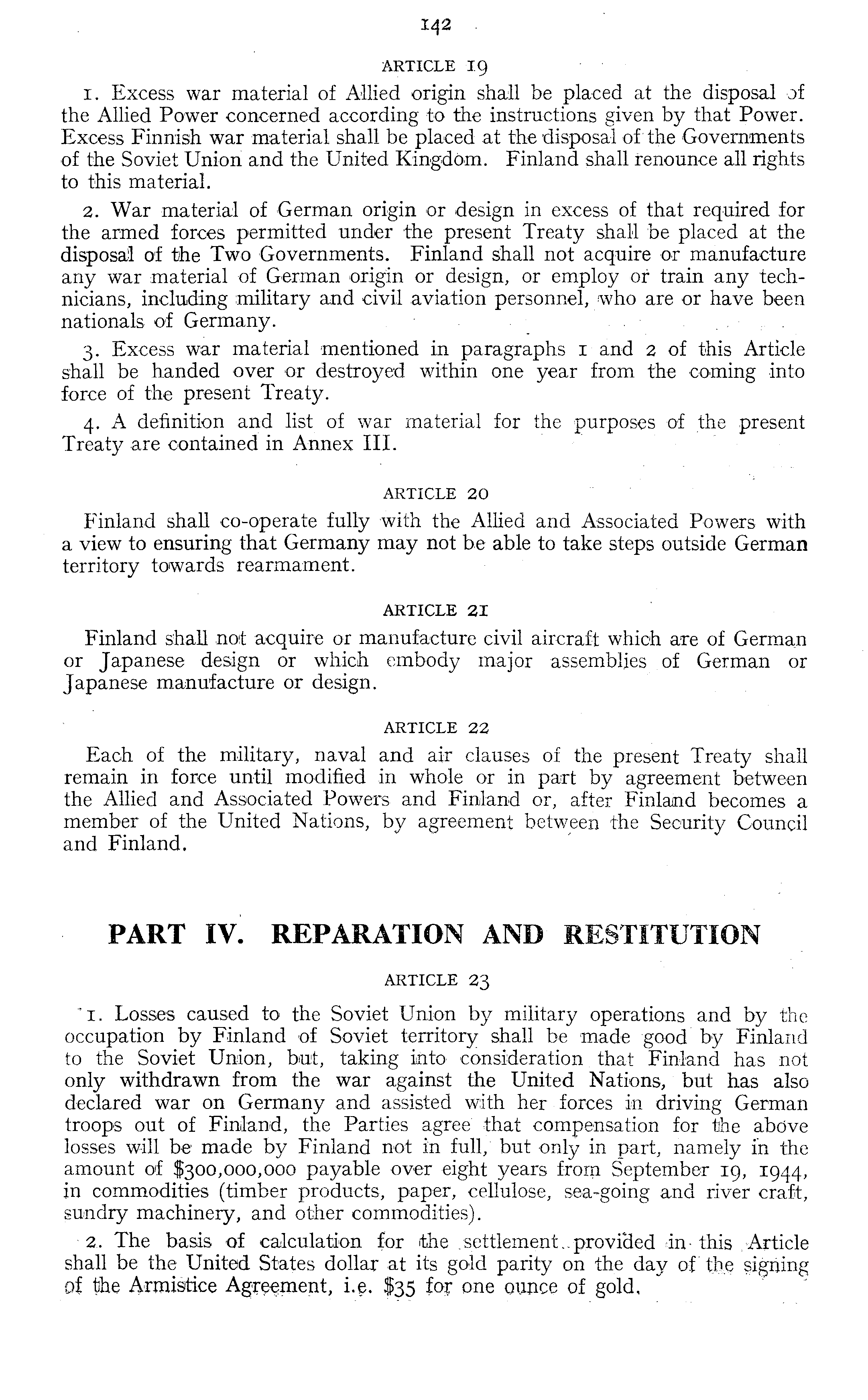 ARTICLE 19 1. Excess war material of Allied origin shall be placed at the disposal of the Allied Power concerned according to the instructions given by that Power. Excess Finnish war material shall be placed at the disposal of the Governments of the Soviet Union and the United Kingdom. Finland shall renounce all rights to this material. 2. War material of German origin or design in excess of that required for the armed forces permitted under the present Treaty shall be placed at the disposal of the Two Governments. Finland Shall not acquire or manufacture any war material of German origin or design, or employ or train any technicians, including military and.civil aviation personnel, who are or have been nationals of Germany. . : < - 3. Excess war material mentioned in paragraphs 1 and 2 of this Article shall be handed over or destroyed within one year from the coming into force of the present Treaty. 4. A definition and list of war material for the purposes of the present Treaty are contained in Annex 111. article 20 Finland shall co-operate fully with the Allied and Associated Powers with a view to ensuring that Germany may not be able to take steps outside German territory towards rearmament. ARTICLE 21 Finland shall not acquire or manufacture civil aircraft which are of German or Japanese design or which embody major' assemblies .of German or Japanese manufacture or design. ARTICLE 22 Each of the military, naval and air clauses of the present Treaty shall remain in force until modified in whole or in part by agreement between the Allied and Associated Pow 7 ers and Finland or, after Finland becomes a member of the United Nations, by agreement between the Security Council and Finland. PART IV. REPARATION AND RESTITUTION ARTICLE 23 *i. Losses caused to the Soviet Union by military operations and by the occupation by Finland of Soviet territory shall be made good by Finland to the Soviet Union, but, taking into consideration. that Finland has not only withdrawn from the war against the United Nations, but has also declared war on Germany and assisted with her forces in driving German troops out of Finland, the Parties agree that compensation for the above losses will be made by Finland not in full, but only in part, namely in the amount of $300,000,000 payable over eight years from September 19, 1944, in commodities (timber products, paper, cellulose, sea-going and river craft, sundry machinery, and other commodities). 2. The basis of calculation for the settlement ..provided in-this. Article shall be the United States dollar at its gold parity on the day of the sighing of the Armistice Agreement, i.e. $35 for one ounce of gold.