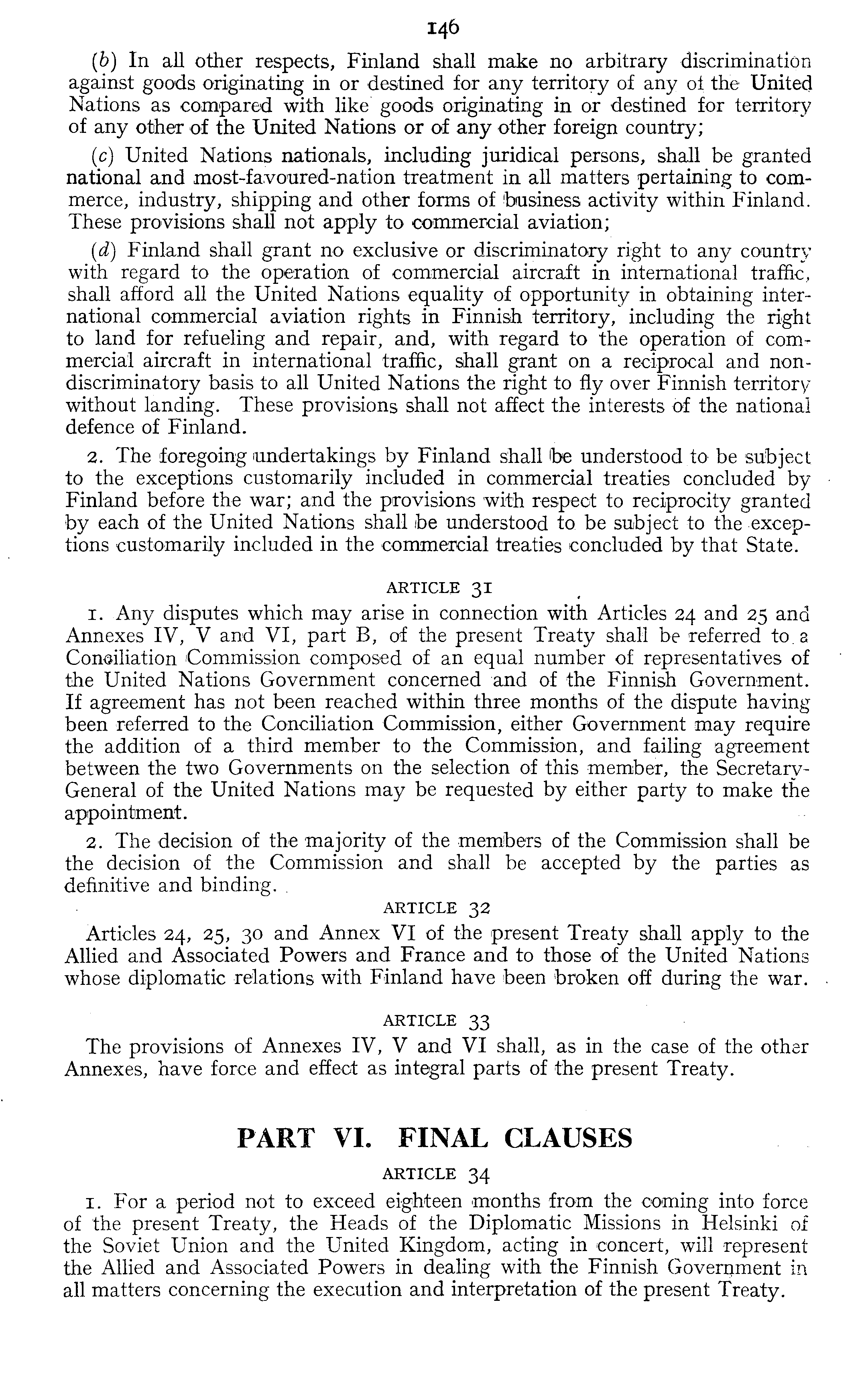(6) In all other respects, Finland shall make no arbitrary discrimination against goods originating in or destined for any territory of any of the United Nations as compared with like goods originating in or destined for territory of any other of the United Nations or of any other foreign country; (c) United Nations nationals, including juridical persons, shall be granted national and rnost-favoured-nation treatment in all matters pertaining to commerce, industry, shipping and other forms of 'business activity within Finland. These provisions shall not apply to commercial aviation; (d) Finland shall grant no exclusive or discriminatory right to any country with regard to the operation of commercial aircraft in international traffic, shall afford all the United Nations equality of opportunity in obtaining international commercial aviation rights in Finnish territory, including the right to land for refueling and repair, and, with regard to the operation of commercial aircraft in international traffic, shall grant on a reciprocal and nondiscriminatory basis to all United Nations the right to fly over Finnish territory without landing. These provisions shall not affect the interests of the national defence of Finland. 2. The foregoing undertakings by Finland shall be understood to be subject to the exceptions customarily included in commercial treaties concluded by Finland before the war; and the provisions with respect to reciprocity granted by each of the United Nations shall be understood to be subject to the exceptions customarily included in the commercial treaties concluded by that State. ARTICLE 31 i. Any disputes which may arise in connection with Articles 24 and 25 and Annexes IV, V and VI, part B, of the present Treaty shall be referred to. a Conciliation Commission composed of an equal number of representatives of the United Nations Government concerned and of the Finnish Government. If agreement has not been reached within three months of the dispute having been referred to the Conciliation Commission, either Government may require the addition of a third member to the Commission, and failing agreement between the two Governments on the selection of this member, the SecretaryGeneral of the United Nations may be requested by either party to make the appointment. 2. The decision of the majority of the members of the Commission shall be the decision of the Commission and shall be accepted by the parties as definitive and binding. . article 32 Articles 24, 25, 30 and Annex VI of the present Treaty shall apply to the Allied and Associated Powers and France and to those of the United Nations whose diplomatic relations with Finland have been broken off during the war. ARTICLE 33 The provisions of Annexes IV, V and VI shall, as in the case of the other Annexes, have force and effect as integral parts of the present Treaty. PART VI. FINAL CLAUSES ARTICLE 34 i. For a period not to exceed eighteen months from the coming into force of the present Treaty, the Heads of the Diplomatic Missions in Helsinki of the Soviet Union and the United Kingdom, acting in concert, will represent the Allied and Associated Powers in dealing with the Finnish Government in all matters concerning the execution and interpretation of the present Treaty.