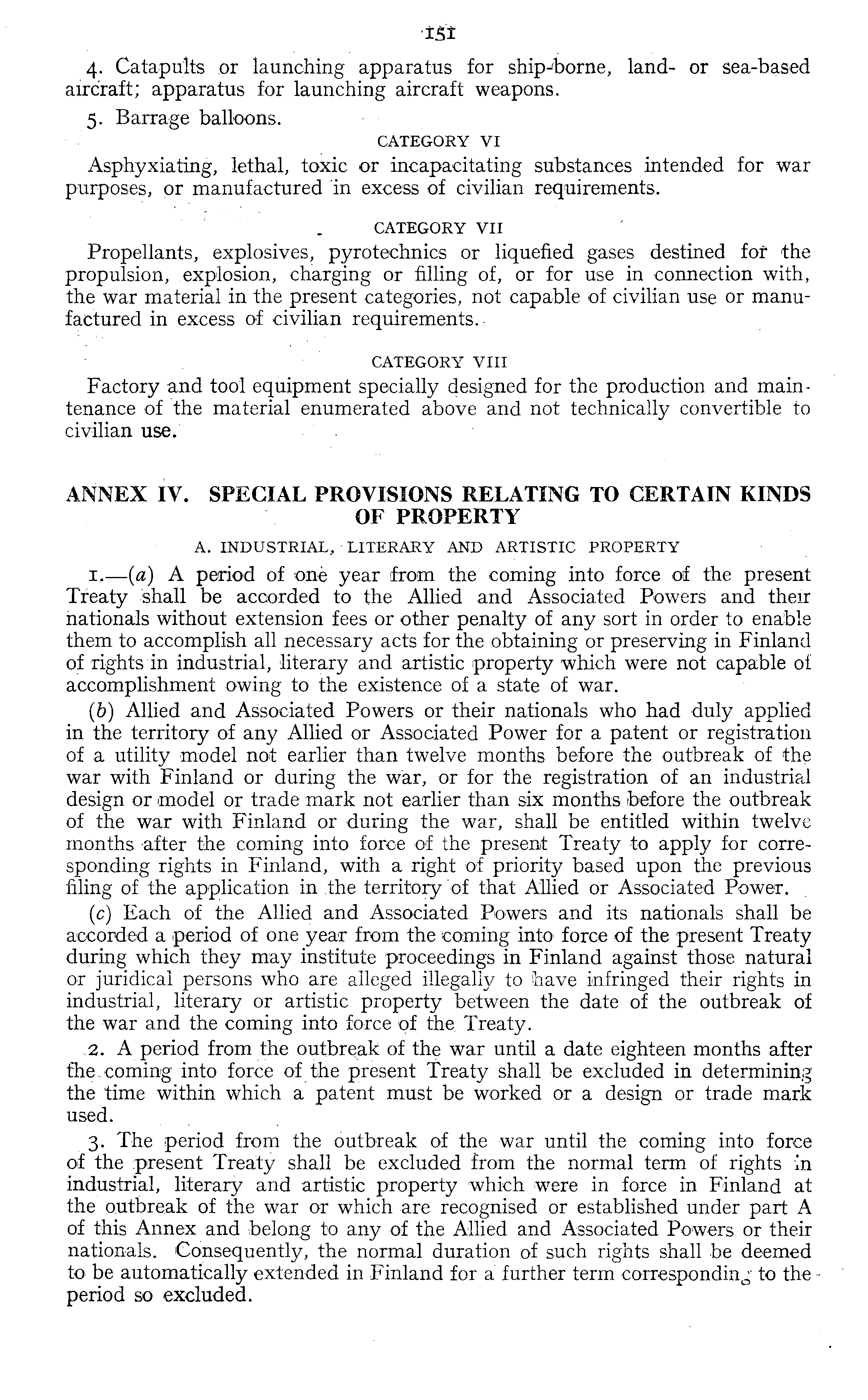 4- Catapults or launching apparatus for ship-borne, land- or sea-based aircraft; apparatus for launching aircraft weapons. 5, Barrage balloons. CATEGORY VI Asphyxiating, lethal, toxic or incapacitating substances intended for war purposes, or manufactured in excess of civilian requirements. CATEGORY VII Propellants, explosives, pyrotechnics or liquefied gases destined for the propulsion, explosion, charging or filling of, or for use in connection with, the war material in the present categories, not capable of civilian use or manufactured in excess of civilian requirements.CATEGORY VIII Factory and tool equipment specially designed for the production and maintenance of the material enumerated above and not technically convertible to civilian use. . ANNEX IV. SPECIAL PROVISIONS RELATING TO CERTAIN KINDS OF PROPERTY A. INDUSTRIAL, LITERARY AND ARTISTIC PROPERTY i,— (a) A period of one year from the coming into force of the present Treaty shall be accorded to the Allied and Associated Powers and their nationals without extension fees or other penalty of any sort in order to enable them to accomplish all necessary acts for the obtaining or preserving in Finland of rights in industrial, literary and artistic property which were not capable of accomplishment owing to the existence of a state of war. (b) Allied and Associated Powers or their nationals who had duly applied in the territory of any Allied or Associated Power for a patent or registration of a utility model not earlier than twelve months before the outbreak of the war with Finland or during the war, or for the registration of an industrial design or model or trade mark not earlier than six months before the outbreak of the war with Finland or during the war, shall be entitled within twelve months after the coming into force of the present Treaty to apply for corresponding rights in Finland, with a right of priority based upon the previous filing of the application in the territory of that Allied or Associated Power. (c) Each of the Allied and Associated Powers and its nationals shall be accorded a period of one year from the coming into force of the present Treaty during which they may institute proceedings in Finland against those natural or juridical persons who are alleged illegally to have infringed their rights in industrial, literary or artistic property between the date of the outbreak of the war and the coming into force of the. Treaty. ,2. A period from the outbreak of the war until a date eighteen months after the.coming into force of the present Treaty shall be excluded in determining the time within which a patent must be worked or a design or trade mark used. 3. The period from the outbreak of the war until the coming into force of the present Treaty shall be excluded from the normal term of rights in industrial, literary and artistic property which were in force in Finland at the outbreak of the war or which are recognised or established under part A of this Annex and belong to any of the Allied and Associated Powers or their nationals. Consequently, the normal duration of such rights shall be deemed to be automatically extended in Finland for a further term corresponding to the period so excluded.