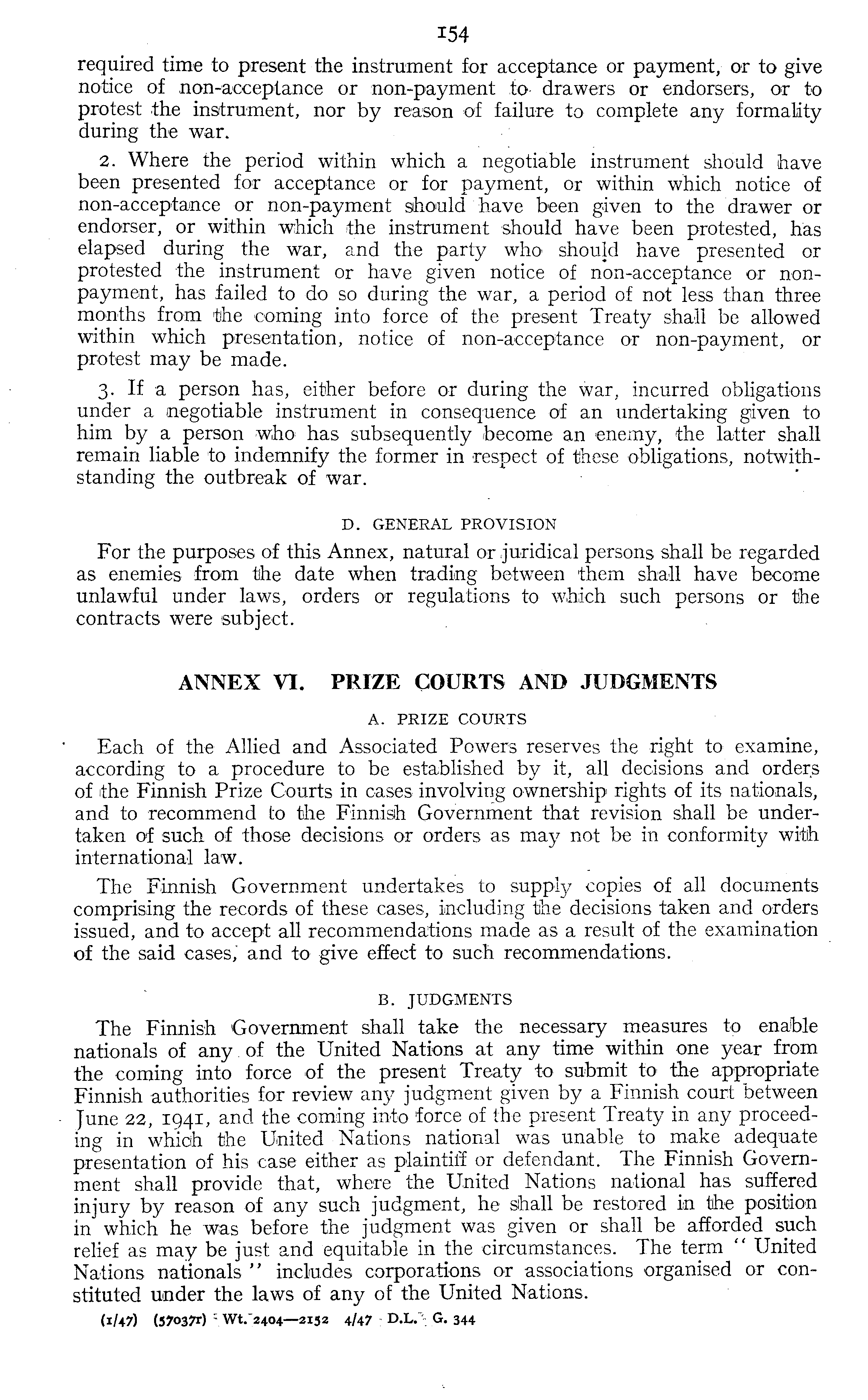 required time to present the instrument for acceptance or payment, or to give notice of non-acceptance or non-payment to- drawers or endorsers, or to protest the instrument, nor by reason of failure to complete any formality during the war. 2. Where the period within which a negotiable instrument should have been presented for acceptance or for payment, or within which notice of non-acceptance or non-payment should have been given to the drawer or endorser, or within which the instrument should have been protested, has elapsed during the war, and the party who should have presented or protested the instrument or have given notice of non-acceptance or nonpayment, has failed to do so during the war, a period of not less than three months from the coming into force of the present Treaty shall be allowed within which presentation, notice of non-acceptance or non-payment, or protest may be made. 3. If a person has, either before or during the war, incurred obligations under a negotiable instrument in consequence of an undertaking given to him by a person who has subsequently become an enemy, the latter shall remain liable to indemnify the former in respect of these obligations, notwithstanding the outbreak of war. D. GENERAL PROVISION For the purposes of this Annex, natural or .juridical persons shall be regarded as enemies from the date when trading between them shall have become unlawful under laws, orders or regulations to which such persons or the contracts were subject. ANNEX VI. PRIZE COURTS AND JUDGMENTS A. PRIZE COURTS Each of the Allied and Associated Powers reserves the right to examine, according to a procedure to be established by it, all decisions and orders of the Finnish Prize Courts in cases involving ownership rights of its nationals, and to recommend to the Finnish Government that revision shall be undertaken of such of those decisions or orders as may not be in conformity with international law. The Finnish Government undertakes to supply copies of all documents comprising the records of these cases, including the decisions taken and orders issued, and to accept all recommendations made as a result of the examination of the said cases,* and to give effect to such recommendations. B. JUDGMENTS The Finnish Government shall take the necessary measures to enable nationals of any. of the United Nations at any time within one year from the coming into force of the present Treaty to submit to the appropriate Finnish authorities for review any judgment given by a Finnish court between June 22, 1941, and the coming into force of the present Treaty in any proceeding in which the United Nations national was unable to make adequate presentation of his case either as plaintiff or defendant. The Finnish Government shall provide that, where the United Nations national has suffered injury by reason of any such judgment, he shall be restored in the position in which he was before the judgment was given or shall be afforded such relief as may be just and equitable in the circumstances. The term '' United Nations nationals " includes corporations or associations organised or constituted under the laws of any of the United Nations. d/ 47) (5703?r) -Wt.-2404—2132 4/47 : DX." : G. 344