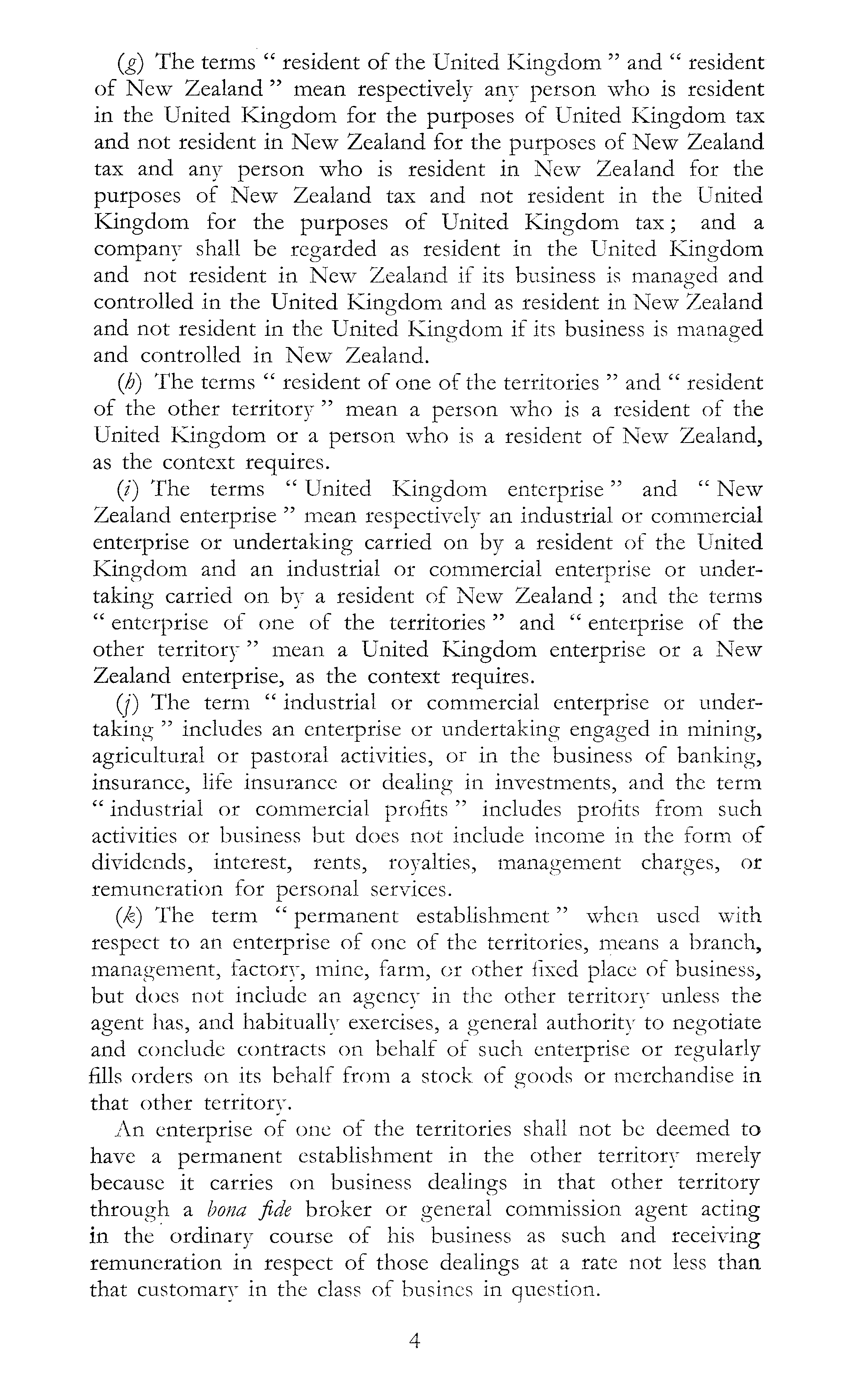 (g) The terms " resident of the United Kingdom " and " resident of New Zealand " mean respectively any person who is resident in the United Kingdom for the purposes of United Kingdom tax and not resident in New Zealand for the purposes of New Zealand tax and any person who is resident in New Zealand for the purposes of New Zealand tax and not resident in the United Kingdom for the purposes of United Kingdom tax; and a company shall be regarded as resident in the United Kingdom and not resident in New Zealand if its business is managed and controlled in the United Kingdom and as resident in New Zealand and not resident in the United Kingdom if its business is managed and controlled in New Zealand. (h) The terms " resident of one of the territories " and " resident of the other territory " mean a person who is a resident of the United Kingdom or a person who is a resident of New Zealand, as the context requires. (/) The terms " United Kingdom enterprise" and " New Zealand enterprise " mean respectively an industrial or commercial enterprise or undertaking carried on by a resident of the United Kingdom and an industrial or commercial enterprise or undertaking carried on by a resident of New Zealand ; and the terms " enterprise of one of the territories " and " enterprise of the other territory " mean a United Kingdom enterprise or a New Zealand enterprise, as the context requires. (j) The term " industrial or commercial enterprise or undertaking " includes an enterprise or undertaking engaged in mining, agricultural or pastoral activities, or in the business of banking, insurance, life insurance or dealing in investments, and the term " industrial or commercial profits " includes profits from such activities or business but does not include income in the form of dividends, interest, rents, royalties, management charges, or remuneration for personal services. (k) The term " permanent establishment" when used with respect to an enterprise of one of the territories, means a branch, management, factory, mine, farm, or other fixed place of business, but does not include an agency in the other territory unless the agent has, and habitually exercises, a general authority to negotiate and conclude contracts on behalf of such enterprise or regularly fills orders on its behalf from a stock of goods or merchandise in that other territory. An enterprise of one of the territories shall not be deemed to have a permanent establishment in the other territory merely because it carries on business dealings in that other territory through a bona fide broker or general commission agent acting in the ordinary course of his business as such and receiving remuneration in respect of those dealings at a rate not less than that customary in the class of busines in question.