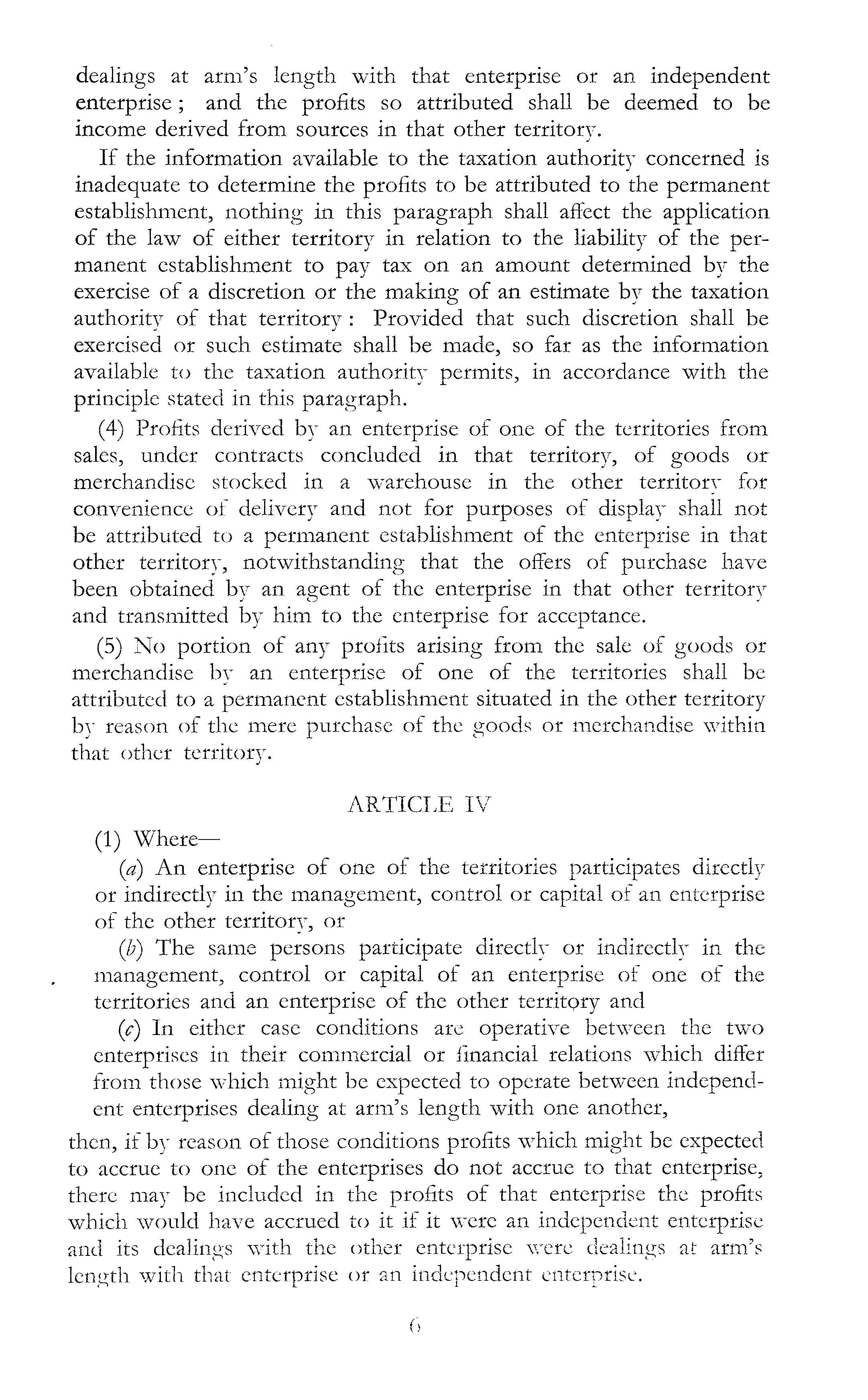 dealings at arm's length with that enterprise or an independent enterprise; and the profits so attributed shall be deemed to be income derived from sources in that other territory. If the information available to the taxation authority concerned is inadequate to determine the profits to be attributed to the permanent establishment, nothing in this paragraph shall affect the application of the law of either territory in relation to the liability of the permanent establishment to pay tax on an amount determined by the exercise of a discretion or the making of an estimate by the taxation authority of that territory : Provided that such discretion shall be exercised or such estimate shall be made, so far as the information available to the taxation authority permits, in accordance with the principle stated in this paragraph. (4) Profits derived by an enterprise of one of the territories from sales, under contracts concluded in that territory, of goods or merchandise stocked in a warehouse in the other territory for convenience of delivery and not for purposes of display shall not be attributed to a permanent establishment of the enterprise in that other territory, notwithstanding that the offers of purchase have been obtained by an agent of the enterprise in that other territory and transmitted by him to the enterprise for acceptance. (5) No portion of any profits arising from the sale of goods or merchandise by an enterprise of one of the territories shall be attributed to a permanent establishment situated in the other territory by reason of the mere purchase of the goods or merchandise within that other territory. ARTICLE IV (1) Where—{a) An enterprise of one of the territories participates directly or indirectly in the management, control or capital of an enterprise of the other territory, or (b) The same persons participate directly or indirectly in the management, control or capital of an enterprise of one of the territories and an enterprise of the other territory and (V) In either case conditions are operative between the two enterprises in their commercial or financial relations which differ from those which might be expected to operate between independent enterprises dealing at arm's length with one another, then, if by reason of those conditions profits which might be expected to accrue to one of the enterprises do not accrue to that enterprise, there may be included in the profits of that enterprise the profits which would have accrued to it if it were an independent enterprise and its dealings with the other enterprise were dealings at arm's length with that enterprise or an independent enterprise.