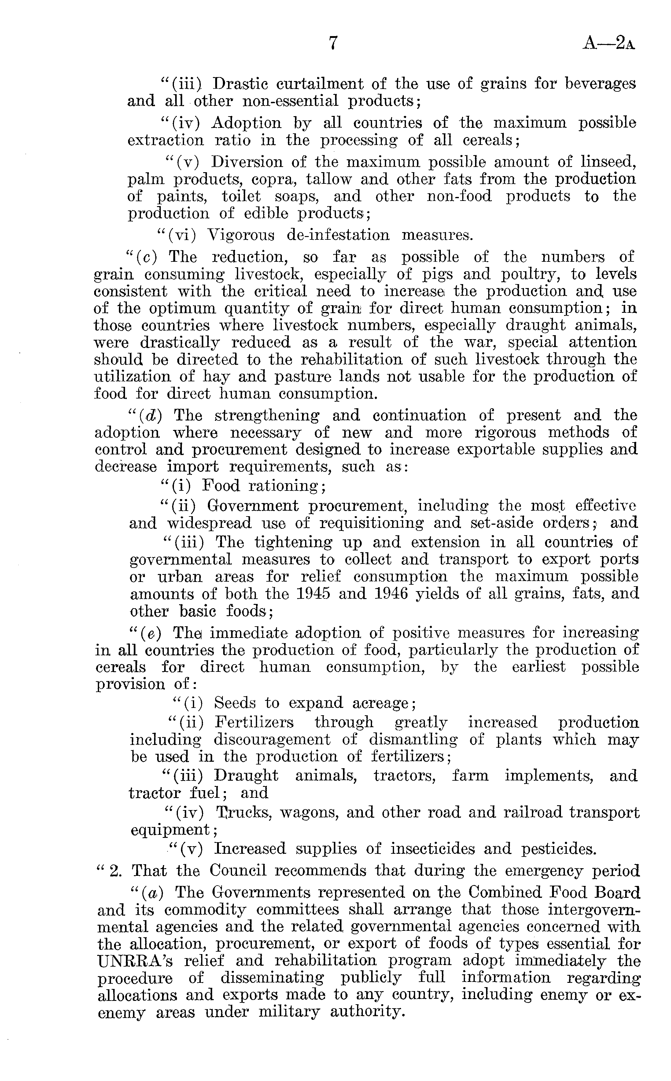 "(iii) Drastic curtailment of the use of grains for beverages and all other non-essential products; "(iv) Adoption by all countries of the maximum possible extraction ratio in the processing of all cereals; "(v) Diversion of the maximum possible amount of linseed, palm products, copra, tallow and other fats from the production of paints, toilet soaps, and other non-food products to the production of edible products; "(vi) Vigorous de-infestation measures. "(c) The reduction, so far as possible of the numbers of grain consuming livestock, especially of pigs and poultry, to levels consistent with the critical need to increase the production and use of the optimum quantity of grain for direct human consumption; in those countries where livestock numbers, especially draught animals, were drastically reduced as a result of the war, special attention should be directed to the rehabilitation of such livestock through the utilization of hay and pasture lands not usable for the production of food for direct human consumption. (d) The strengthening and continuation of present and the adoption where necessary of new and more rigorous methods of control and procurement designed to increase exportable supplies and decrease import requirements, such as: "(i) Food rationing; "(ii) Government procurement, including the most effective and widespread use of requisitioning and set-aside orders; and "(iii) The tightening up and extension in all countries of governmental measures to collect and transport to export ports or urban areas for relief consumption the maximum possible amounts of both the 1945 and 1946 yields of all grains, fats, and other basic foods; "(e) Thel immediate adoption of positive measures for increasing in all countries the production of food, particularly the production of cereals for direct human consumption, by the earliest possible provision of: "(i) Seeds to expand acreage; "(ii) Fertilizers through greatly increased production including discouragement of dismantling of plants which may be used in the production of fertilizers; "(iii) Draught animals, tractors, farm implements, and tractor fuel; and " (iv) Trucks, wagons, and other road and railroad transport equipment; "(v) Increased supplies of insecticides and pesticides. " 2. That the Council recommends that during the emergency period " (a) The Governments represented on the Combined Food Board and its commodity committees shall arrange that those intergovernmental agencies and the related governmental agencies concerned with the allocation, procurement, or export of foods of types essential for UNRRA's relief and rehabilitation program adopt immediately the procedure of disseminating publicly full information regarding allocations and exports made to any country, including enemy or exenemy areas under military authority.
