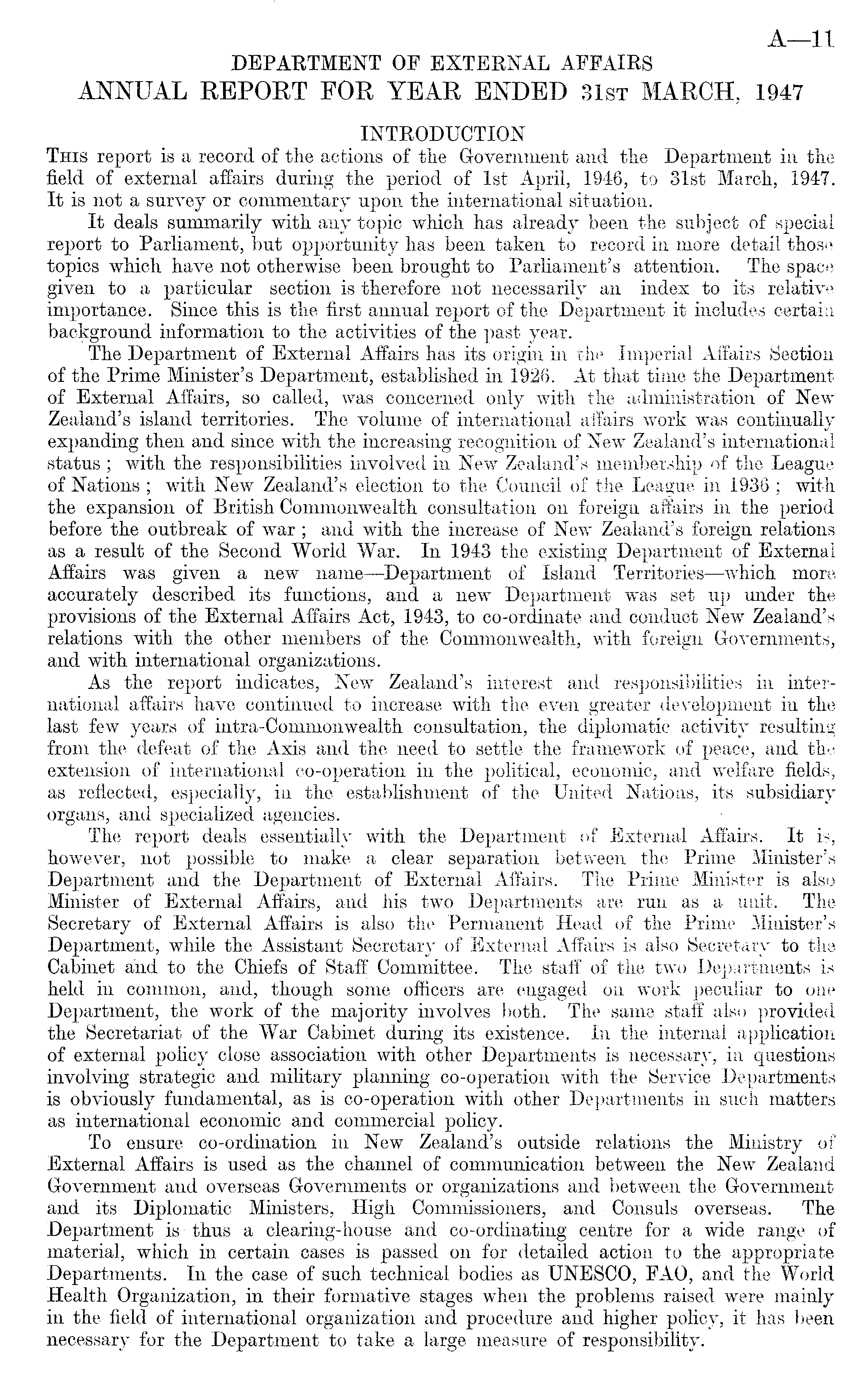 DEPARTMENT OF EXTERNAL AFFAIRS ANNUAL REPORT FOR YEAR ENDED 31st MARCH, 1947 INTRODUCTION This report is a record of the actions of the Government and the Department in the field of external affairs during the period of Ist April, 1946, to 31st March, 1947. It is not a survey or commentary upon the international situation. It deals summarily with any topic which has already been the subject of special report to Parliament, but opportunity has been taken to record in more detail those topics which have not otherwise been brought to Parliament's attention. The space given to a particular section is therefore not necessarily an index to its relative importance. Since this is the first annual report of the Department it includes certain background information to the activities of the past year. The Department of External Affairs has its origin in the Imperial Affairs Section of the Prime Minister's Department, established in 1926. At that time the Department of External Affairs, so called, was concerned only with the administration of New Zealand's island territories. The volume of international affairs work was continually expanding then and since with the increasing recognition of New Zealand's international status ; with the responsibilities involved in New Zealand's membership of the League of Nations ; with New Zealand's election to the Council of the League in 1936 ; with the expansion of British Commonwealth consultation on foreign affairs in the period before the outbreak of war ; and with the increase of New Zealand's foreign relations as a result of the Second World War. In 1943 the existing Department of External Affairs was given a new name —Department of Island Territories—which more accurately described its functions, and a new Department was set up under the provisions of the External Affairs Act, 1943, to co-ordinate and conduct New Zealand's relations with the other members of the Commonwealth, with foreign Governments, and with international organizations. As the report indicates, New Zealand's interest and responsibilities in international affairs have continued to increase with the even greater development in the last few years of intra-Commonwealth consultation, the diplomatic activity resulting from the defeat of the Axis and the need to settle the framework of peace, and the extension of international co-operation in the political, economic, and welfare fields, as reflected, especially, in the establishment of the United Nations, its subsidiary organs, and specialized agencies. The report deals essentially with the Department of External Affairs. It is, however, not possible to make a clear separation between the Prime Minister's Department and the Department of External Affairs. The Prime Minister is also Minister of External Affairs, and his two Departments are run as a unit. The Secretary of External Affairs is also the Permanent Head of the Prime Minister's Department, while the Assistant Secretary of External Affairs is also Secretary to the Cabinet and to the Chiefs of Staff Committee. The staff of the two Departments is held in common, and, though some officers are engaged on work peculiar to one Department, the work of the majority involves both. The same staff also provided the Secretariat of the War Cabinet during its existence. In the internal application of external policy close association with other Departments is necessary, in questions involving strategic and military planning co-operation with the Service Departments is obviously fundamental, as is co-operation with other Departments in such matters as international economic and commercial policy. To ensure co-ordination in New Zealand's outside relations the Ministry of External Affairs is used as the channel of communication between the New Zealand Government and overseas Governments or organizations and between the Government and its Diplomatic Ministers, High Commissioners, and • Consuls overseas. The Department is ■ thus a clearing-house and co-ordinating centre for a wide range of material, which in certain cases is passed on for detailed action to the appropriate Departments. In the case of such technical bodies as UNESCO, FAO, and the World Health Organization, in their formative stages when the problems raised were mainly in the field of international organization and procedure and higher policy, it has been necessary for the Department to take a large measure of responsibility.