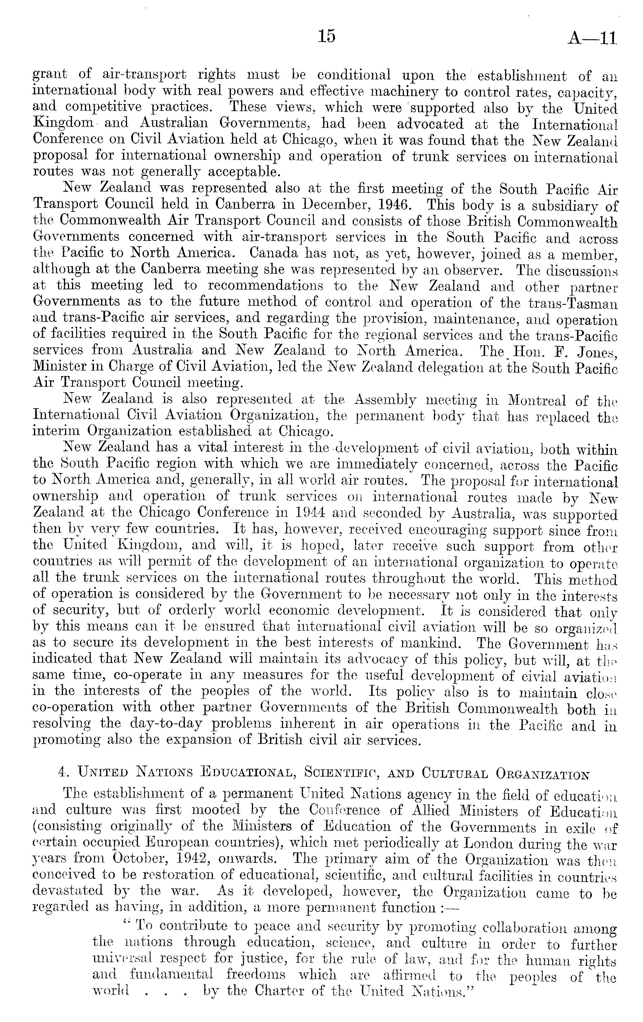 grant of air-transport rights must be conditional upon the' establishment of an international body with real powers and effective machinery to control rates, capacity, and competitive practices.- These views, which were 'supported also by the United Kingdom and Australian Governments, had been advocated at the International Conference on Civil Aviation held at Chicago, when it was found that the New Zealand proposal for international ownership and operation of trunk services on international routes was not generally acceptable. New Zealand was represented also at the first meeting of the South Pacific Air Transport Council held in Canberra in December, 1946. This body is a subsidiary of the Commonwealth Air Transport Council and consists of those British Commonwealth Governments concerned with air-transport services in the South Pacific and across the Pacific to North America. Canada has not, as yet, however, joined as a member, although at the Canberra meeting she was represented by an observer. The discussions at this meeting led to recommendations to the New Zealand and other partner Governments as to the future method of control and operation of the trans-Tasman and trans-Pacific air services, and regarding the provision, maintenance, and operation of facilities required in the South Pacific for the regional services and the trans-Pacific services from Australia and New Zealand to North America. The, Hon. F. Jones, Minister in Charge of Civil Aviation, led the New Zealand delegation at the South Pacific Air Transport Council meeting. New Zealand is also represented at the Assembly meeting in Montreal of the International Civil Aviation Organization, the permanent body that has replaced the interim Organization established at Chicago. New Zealand has a vital interest in the development of civil aviation, both within the South Pacific region with which we are immediately concerned, across the Pacific to North America and, generally, in all world air routes. The proposal for international ownership and operation of trunk services on international routes made by New Zealand at the Chicago Conference in 1944 and seconded by Australia, was supported then by very few countries. It has, however, received encouraging support since from the United Kingdom, and will, it is hoped, later receive such support from other countries as will permit of the development of an international organization to operate all the trunk services on the international routes throughout the world. This method of operation is considered by the Government to be necessary not only in the interests of security, but of orderly world economic development. It is considered that only by this means can it be ensured that international civil aviation will be so organized as to secure its development in the best interests of mankind. The Government has indicated that New Zealand will maintain its advocacy of this policy, but will, at the same time, co-operate in any measures for the useful development of civial aviation in the interests of the peoples of the world. Its policy also is to maintain close co-operation with other partner Governments of the British Commonwealth both in resolving the day-to-day problems inherent in air operations in the Pacific and in promoting also the expansion of British civil air services. 4. United Nations Educational, Scientific, and Cultural Organization The establishment of a permanent United Nations agency in the field of education and culture was first mooted by the Conference' of Allied Ministers of Education (consisting originally of the Ministers of Education of the Governments in exile of certain occupied European countries), which met periodically at London during the war years from October, 1942, onwards. The primary aim of the Organization was then conceived to be restoration of educational, scientific, and cultural facilities in countries devastated by the war. As it developed, however, the Organization came to be regarded as having, in addition, a more permanent function : "To contribute to peace and security by promoting collaboration among the nations through education, science, and culture in order to further universal respect for justice, for the rule of law, and for the human rights and . fundamental freedoms which are affirmed to the peoples of the world ... by the Charter of the United Nations."