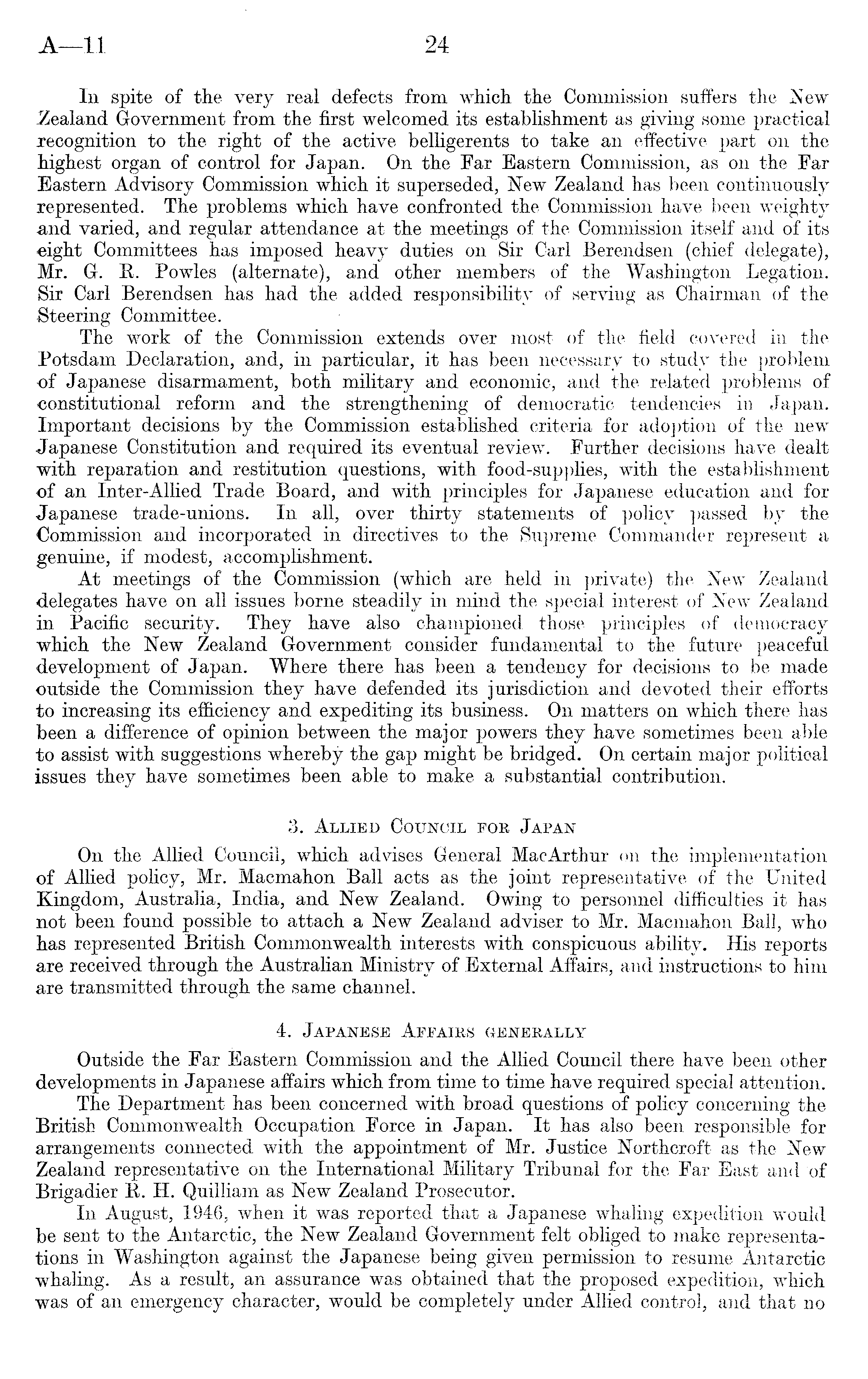 In spite of the very real defects from which the Commission suffers the New Zealand Government from the first welcomed its establishment as giving some practical recognition to the right of the active belligerents to take an effective part on the highest organ of control for Japan. On the Far Eastern Commission, as on the Far Eastern Advisory Commission which it superseded, New Zealand has been continuously represented. The problems which have confronted the Commission have been weighty and varied, and regular attendance at the meetings of the Commission itself and of its eight Committees has imposed heavy duties on Sir Carl Berendsen (chief delegate), Mr. G. R. Powles (alternate), and other members of the Washington Legation. Sir Carl Berendsen has had the added responsibility of serving as Chairman of the Steering Committee. The work of the Commission extends over most of the field covered in the Potsdam Declaration, and, in particular, it has been necessary to study the problem of Japanese disarmament, both military and economic, and the related problems of constitutional reform and the strengthening of democratic tendencies in Japan. Important decisions by the Commission established criteria for adoption of the new Japanese Constitution and required its eventual review. Further decisions have dealt with reparation and restitution questions, with food-supplies, with the establishment of an Inter-Allied Trade Board, and with principles for Japanese education and for Japanese trade-unions. In all, over thirty statements of policy passed by the Commission and incorporated in directives to the Supreme Commander represent a genuine, if modest, accomplishment. At meetings of the Commission (which are held in private) the New Zealand delegates have on all issues borne steadily in mind the special interest of New Zealand in Pacific security. They have also championed those principles of democracy which the New Zealand Government consider fundamental to the future peaceful development of Japan. Where there has been a tendency for decisions to be made outside the Commission they have defended its jurisdiction and devoted their efforts to increasing its efficiency and expediting its business. On matters on which there has been a difference of opinion between the major powers they have sometimes been able to assist with suggestions whereby the gap might be bridged. On certain major politioal issues they have sometimes been able to make a substantial contribution. 3. Allied Council for Japan On the Allied Council, which advises General Mac Arthur on the implementation of Allied policy, Mr. Macmahon Ball acts as the joint representative of the United Kingdom, Australia, India, and New Zealand. Owing to personnel difficulties it has not been found possible to attach a New Zealand adviser to Mr. Macmahon Ball, who has represented British Commonwealth interests with conspicuous ability. His reports are received through the Australian Ministry of External Affairs, and instructions to him are transmitted through the same channel. 4. Japanese Affairs generally Outside the Far Eastern Commission and the Allied Council there have been other developments in Japanese affairs which from time to time have required special attention. The Department has been concerned with broad questions of policy concerning the British Commonwealth Occupation Force in Japan. It has also been responsible for arrangements connected with the appointment of Mr. Justice Northcroft as the New Zealand representative on the International Military Tribunal for the Far East and of Brigadier R. H. Quilliam as New Zealand Prosecutor. In August, 1946, when it was reported that a Japanese whaling expedition would be sent to the Antarctic, the New Zealand Government felt obliged to make representations in Washington against the Japanese being given permission to resume Antarctic whaling. As a result, an assurance was obtained that the proposed expedition, which was of an emergency character, would be completely under Allied control, and that no
