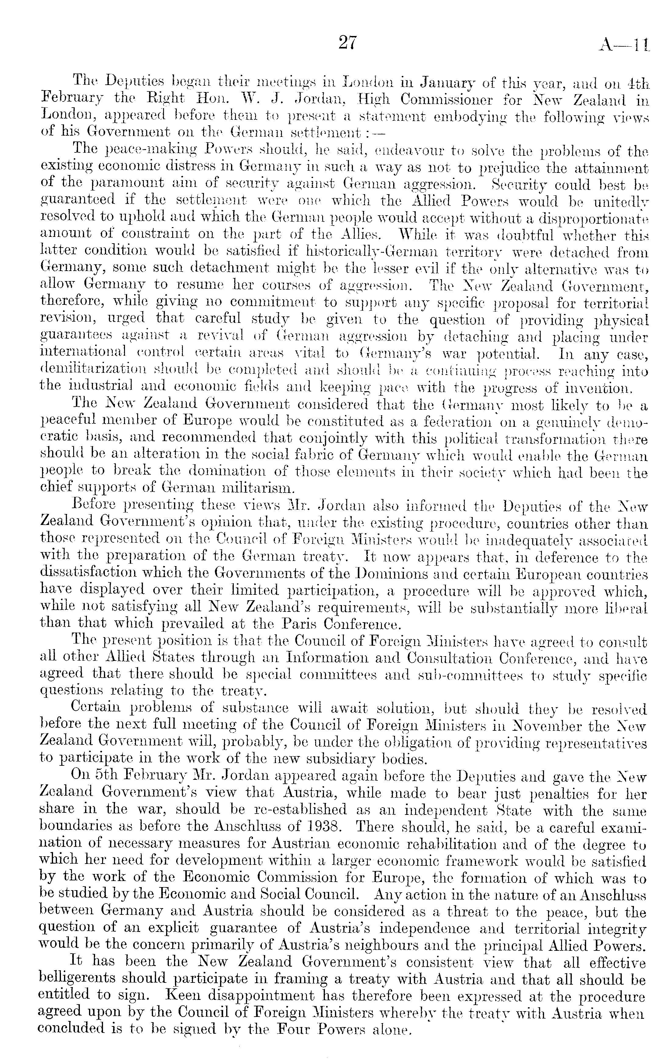 The Deputies began their 1 meetings in London in January of this year, and on 4th February the Right Hon. W. J. Jordan, High Commissioner for New Zealand in London, appeared before them to present a statement embodying the following views of his Government on the German settlement: — The peace-making Powers should, he said, endeavour to solve the problems of the existing economic distress in Germany in such a way as not to prejudice the attainment of the paramount aim of security against German aggression. Security could best be guaranteed if the settlement were one which the Allied Powers would be unitedly resolved to uphold and which the German people would accept without a disproportionate amount of constraint on the part of the Allies. While it was doubtful whether this latter condition would be satisfied if historically-German territory were detached from Germany, some such detachment might be the lesser evil if the only alternative was to allow Germany to resume her courses of aggression. The New Zealand Government, therefore, while giving no commitment to support any specific proposal for territorial revision, urged that careful study be given to the question of providing physical guarantees against a revival of German aggression by detaching and placixig under international control certain areas vital to Germany's war potential. In any case, demilitarization should be completed and should be a continuing process reaching into the industrial and economic fields and keeping pace with the progress of invention. The New Zealand Government considered that the Germany most likely to be a peaceful member of Europe would be constituted as a federation on a genuinely democratic basis, and recommended that conjointly with this political transformation there should be an alteration in the social fabric of Germany which would enable the German people to break the domination of those elements in their society which had been the chief supports of German militarism. Before presenting these views Mr. Jordan also informed the Deputies of the New Zealand Government's opinion that, under the existing procedure, countries other than those represented on the Council of Foreign Ministers would be inadequately associated with the preparation of the German treaty. It now appears that, in deference to the dissatisfaction which the Governments of the Dominions and certain European countries have displayed over their limited participation, a procedure will be approved which, while not satisfying all New Zealand's requirements, will be substantially more liberal than that which prevailed at the Paris Conference. The present position is that the Council of Foreign Ministers have agreed to consult all other Allied States through an Information and Consultation Conference, and have agreed that there should be special committees and sub-committees to study specific questions relating to the treaty. Certain problems of substance will await solution, but should they be resolved before the next full meeting of the Council of Foreign Ministers in November the New Zealand Government will, probably, be under the obligation of providing representatives to participate in the work of the new subsidiary bodies. On sth February Mr. Jordan appeared again before the Deputies and gave the New Zealand Government's view that Austria, while made to bear just penalties for her share in the war, should be re-established as an independent State with the same boundaries as before the Anschluss of 1938. There should, he said, be a careful examination of necessary measures for Austrian economic rehabilitation and of the degree to which her need for development within a larger-economic framework would be satisfied by the work of the Economic Commission for Europe, the formation of which was to be studied by the Economic and Social Council. Any action in the nature of an Anschluss between Germany and Austria should be considered as a threat to the peace, but the question of an explicit guarantee of Austria's independence and territorial integrity would be the concern primarily of Austria's neighbours and the principal Allied Powers. It has been the New Zealand Government's consistent view that all effective belligerents should participate in framing a treaty with Austria and that all should be entitled to sign. Keen disappointment has therefore been expressed at the procedure agreed upon by the Council of Foreign Ministers whereby the treaty with Austria when concluded is to be signed by the Four Powers alone.