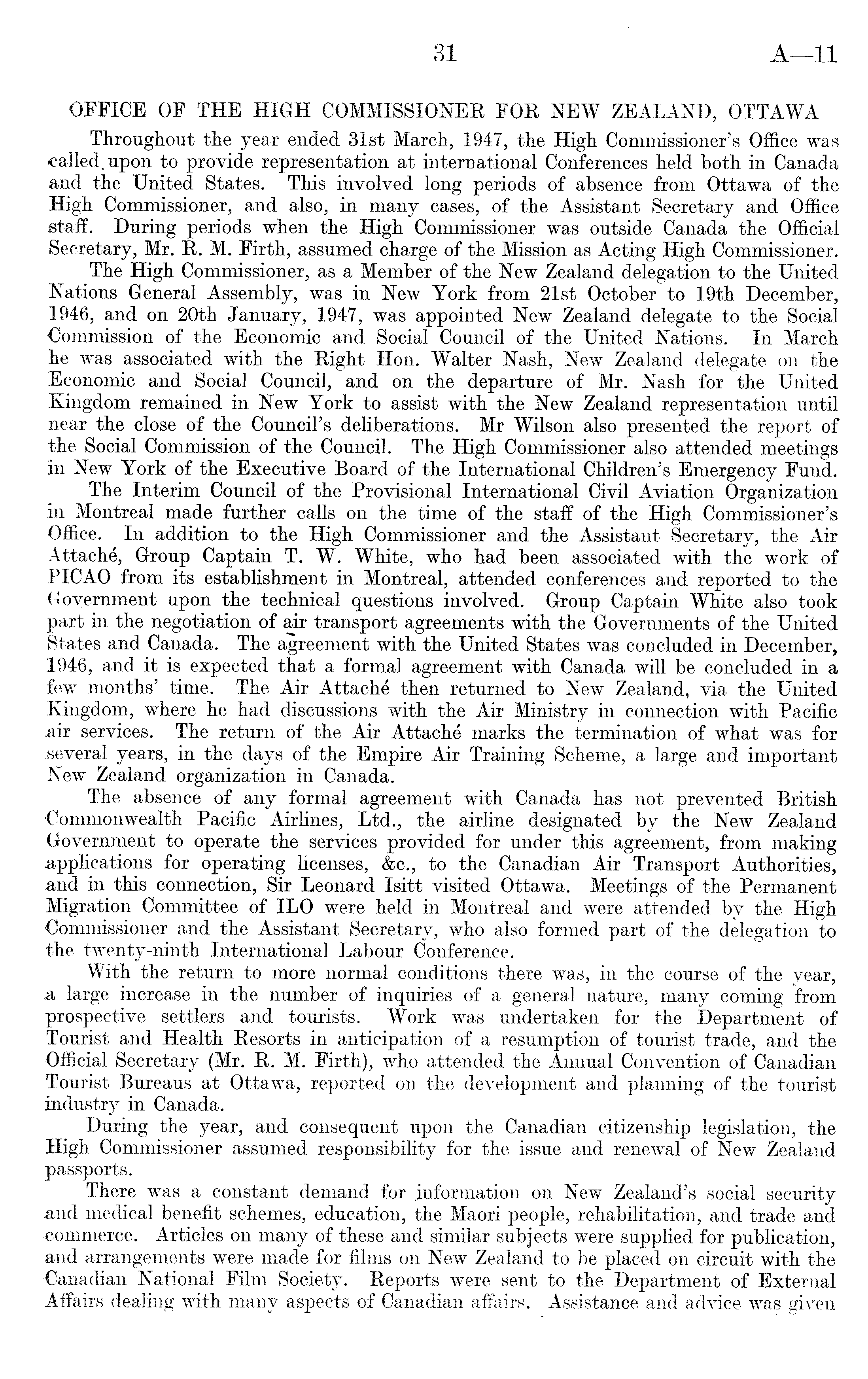 OFFICE OF THE HIGH COMMISSIONER FOR NEW ZEALAND, OTTAWA Throughout the year ended 31st March, 1947, the High Commissioner's Office was called, upon to provide representation at international Conferences held both in Canada and the United States. This involved long periods of absence from Ottawa of the High Commissioner, and also, in many cases, of the Assistant Secretary and Office staff. During periods when the High Commissioner was outside Canada the Official Secretary, Mr. R. M. Firth, assumed charge of the Mission as Acting 'High Commissioner. The High Commissioner, as a Member of the New Zealand delegation to the United Nations General Assembly, was in New York from 21st October to 19th December, 1946, and on 20th January, 1947, was appointed New Zealand delegate to the Social Commission of the Economic and Social Council of the United Nations. In March he was associated with the Right Hon. Walter Nash, New Zealand delegate on the Economic and Social Council, and on the departure of Mr. Nash for the United Kingdom remained in New York to assist with the New Zealand representation until near the close of the Council's deliberations. Mr Wilson also presented the report of the Social Commission of the Council. The High Commissioner also attended meetings in New York of the Executive Board of the International Children's Emergency Fund. The Interim Council of the Provisional International Civil Aviation Organization in Montreal made further calls on the time of the staff of the High Commissioner's Office. In addition to the High Commissioner and the Assistant Secretary, the Air Attache, Group Captain T. W. White, who had been associated with the work of PIC AO from its establishment in Montreal, attended conferences and reported to the Government upon the technical questions involved. Group Captain White also took part in the negotiation of air transport agreements with the Governments of the United States and Canada. The agreement with the United States was concluded in December, 1946, and it is expected that a formal agreement with Canada will be concluded in a few months' time. The Air Attache then returned to New Zealand, via the United Kingdom, where he had discussions with the Air Ministry in connection with Pacific air services. The return of the Air Attache marks the termination of what was for several years, in the days of the Empire Air Training Scheme, a large and important New Zealand organization in Canada. The absence of any formal agreement with Canada has not prevented British Commonwealth Pacific Airlines, Ltd., the airline designated by the. New Zealand Government to operate the services provided for under this agreement, from making applications for operating licenses, &c., to the Canadian Air Transport Authorities, and in this connection, Sir Leonard Isitt visited Ottawa. Meetings of the Permanent Migration Committee of ILO were held in Montreal and were attended by the High Commissioner and the Assistant Secretary, who also formed part of the delegation to the twenty-ninth International Labour Conference. With the return to more normal conditions there was, in the course of the year, a large increase in the number of inquiries of a general nature, many coming from prospective settlers and tourists. Work was undertaken for the Department of Tourist and Health Resorts in anticipation of a resumption of tourist trade, and the Official Secretary (Mr. R. M. Firth), who attended the Annual Convention of Canadian Tourist Bureaus at Ottawa, reported on the development and planning of the tourist industry in Canada. During the year, and consequent upon the Canadian citizenship legislation,. the High Commissioner assumed responsibility for the issue and renewal of New Zealand passports. There was a constant demand for information on New Zealand's social security and medical benefit schemes, education, the Maori people, rehabilitation, and trade and ■commerce. Articles on many of these-and similar subjects were supplied for publication, and arrangements were made for films on New Zealand to be placed on circuit with the Canadian National Film Society. Reports were sent to the Department of External Affairs dealing with many aspects of Canadian affairs. Assistance and advice was given