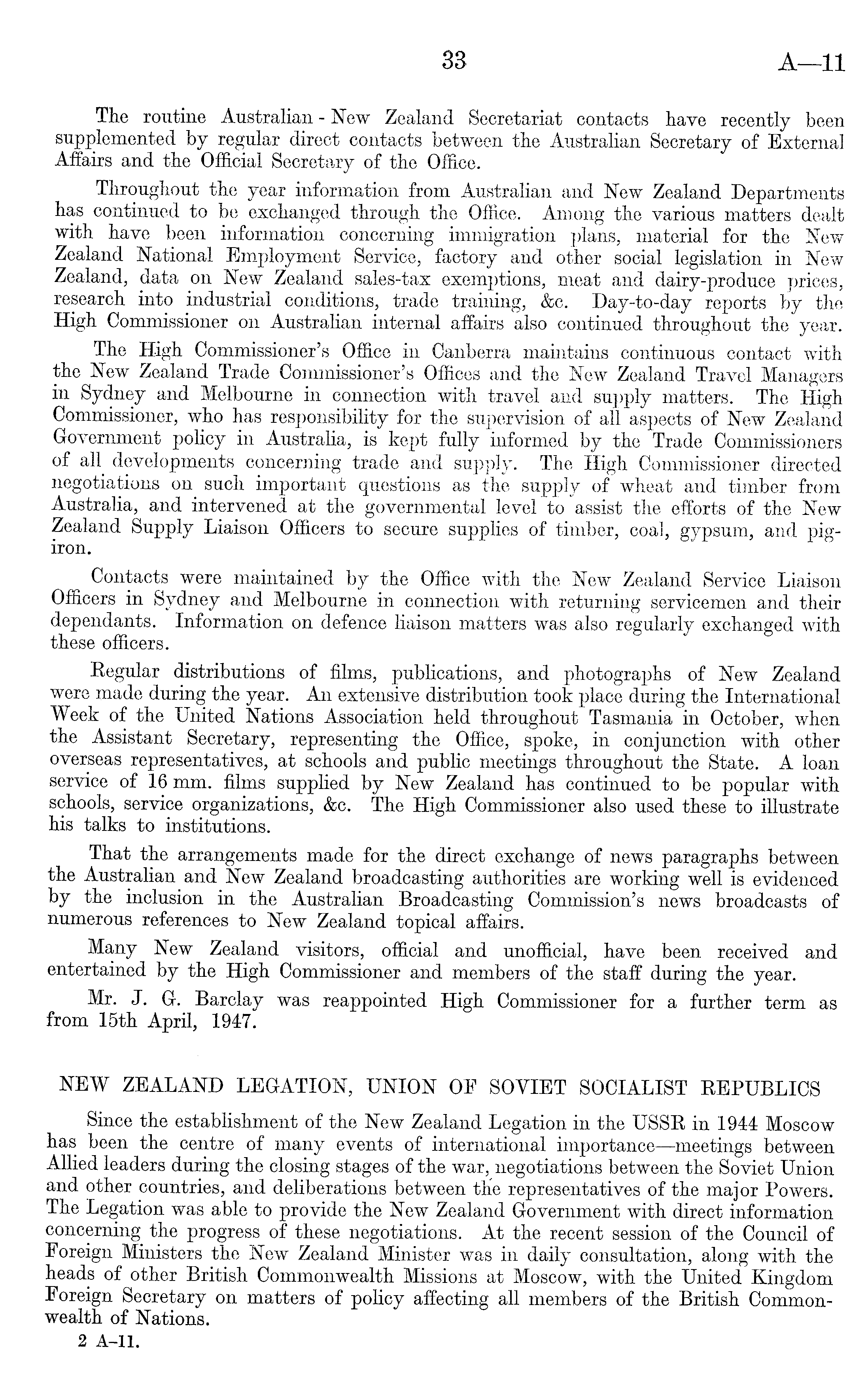 The routine Australian - New Zealand Secretariat contacts have recently been supplemented by regular direct contacts between the Australian Secretary of External Affairs and the Official Secretary of the Office. Throughout the year information from Australian and New Zealand Departments has continued to be exchanged through the Office. Among the various matters dealt with have been information concerning immigration plans, material for the New Zealand National Employment Service, factory and other social legislation in New Zealand, data on New Zealand sales-tax exemptions, meat and dairy-produce prices, research into industrial conditions, trade training, &c. Day-to-day reports by the High Commissioner on Australian internal affairs also continued throughout the year. The High Commissioner's Office in Canberra maintains continuous contact with the New Zealand Trade Commissioner's Offices and the New Zealand Travel Managers in Sydney and Melbourne in connection with travel and supply matters. The High Commissioner, who has responsibility for the supervision of all aspects of New Zealand Government policy in Australia, is kept fully informed by the Trade Commissioners of all developments concerning trade and supply. The High Commissioner directed negotiations on such important questions as the supply of wheat and timber from Australia, and intervened at the governmental level to assist the efforts of the New Zealand Supply Liaison Officers to secure supplies of timber, coal, gypsum, and pigiron. Contacts were maintained by the Office with the New Zealand Service Liaison Officers in Sydney and Melbourne in connection with returning servicemen and their dependants. Information on defence liaison matters was also regularly exchanged with these officers. Regular distributions of films, publications, and photographs of New Zealand were made during the year. An extensive distribution took place during the International Week of the United Nations Association held throughout Tasmania in October, when the Assistant Secretary, representing the Office, spoke, in conjunction with other overseas representatives, at schools and public meetings throughout the State. A loan service of 16 mm. films supplied by New Zealand has continued to be popular with schools, service organizations, &c. The High Commissioner also used these to illustrate his talks to institutions. That the arrangements made for the direct exchange of news paragraphs between the Australian and New Zealand broadcasting authorities are working well is'evidenced by the inclusion in the Australian Broadcasting Commission's news broadcasts of numerous references to New Zealand topical affairs. Many New Zealand visitors, official and unofficial, have been received and entertained by the High Commissioner and members of the staff during the year. Mr. J. Gr. Barclay was reappointed High Commissioner for a further term as from 15th April, 1947. NEW ZEALAND LEGATION, UNION OF SOVIET SOCIALIST REPUBLICS Since the establishment of the New Zealand Legation in the USSR in 19M Moscow has been the centre of many events of international importance—meetings between Allied leaders during the closing stages of the war, negotiations between the Soviet Union and other countries, and deliberations between the representatives of the major Powers. The Legation was able to provide the New Zealand Government with direct information concerning the progress of these negotiations. At the recent session of the Council of Foreign Ministers the New Zealand Minister was in daily consultation, along with the heads of other British Commonwealth Missions at Moscow, with the United Kingdom Foreign Secretary on matters of policy affecting all members of the British Commonwealth of Nations.