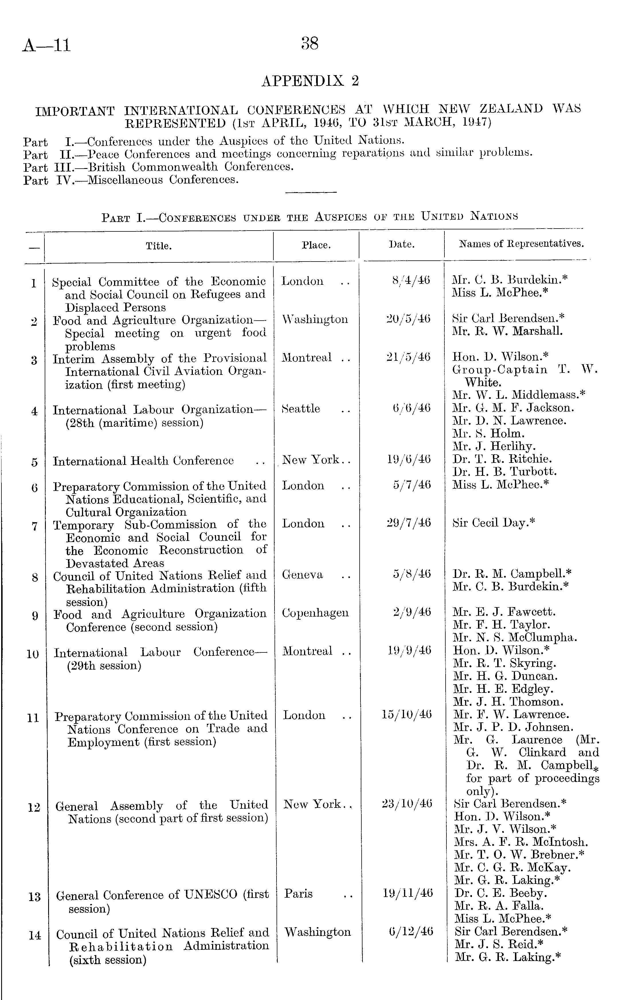 - Title. Place. Date. Names of Representatives. 1 2 Special Committee of the Economic and Social Council on Refugees and Displaced Persons Food and Agriculture Organization— Special meeting on urgent food problems Interim Assembly of the Provisional International Civil Aviation Organization (first meeting) International Labour Organization— (28th (maritime) session) International Health Conference Preparatory Commission of the United Nations Educational, Scientific, and Cultural Organization Temporary Sub-Commission of the Economic and Social Council for the Economic Reconstruction of Devastated Areas Council of United Nations Relief and Rehabilitation Administration (fifth London Washington 8/4/46 20/5/46 Mr. C. B. Burdekin.* Miss L. McPhee.* Sir Carl Berendsen.* Mr. R. W. Marshall. 3 4 5 6 7 8 Montreal .. Seattle .New York.. London London Geneva 21/5/46 6/6/46 19/6/46 5/7/46 29/7/46 5/8/46 Hon. D. Wilson.* Group-Captain T. W. White. Mr. W. L. Middlemass.* Mr. G. M. F. Jackson. Mr. D. N. Lawrence. Mr. S. Holm. Mr. J. Herlihy. Dr. T. R. Ritchie. Dr. H. B. Turbott. Miss L. McPhee.* Sir Cecil Day.* Dr. R. M. Campbell.* Mr. C. B. Burdekin.* 9 10 11 12 13 14 session) Food and Agriculture Organization Conference (second session) International Labour Conference — (29th session) Preparatory Commission of the United Nations Conference on Trade and Employment (first session) General Assembly of the United Nations (second part of first session) General Conference of UNESCO (first session) Council of United Nations Relief and Rehabilitation Administration (sixth session) Copenhagen Montreal .. London New York., Paris Washington 2/9/46 19/9/46 15/10/46 23/10/46 19/11/46 6/12/46 Mr. E. J. Fawcett. Mr. F. H. Taylor. Mr. N. S. McClumpha. Hon. D. Wilson* Mr. R. T. Skyring. Mr. H. G. Duncan. Mr. H. E. Edgley. Mr. J. H. Thomson. Mr. F. W. Lawrence. Mr. J. P. D. Johnsen. Mr. G. Laurence (Mr. G. W. Clinkard and Dr. R. M. Campbell* for part of proceedings only). -Sir Carl Berendsen.* Hon. D. Wilson.* Mr. J. V. Wilson.* Mrs. A. F. R. Mcintosh. Mr. T. 0. W. Brebner.* Mr. C. G. R. McKay. Mr. G. R. Laking.* Dr. C. E. Beeby. Mr. R. A. Falla. Miss L. McPhee.* Sir Carl Berendsen.* Mr. J. S. Reid.* Mr. G. R. Laking.*