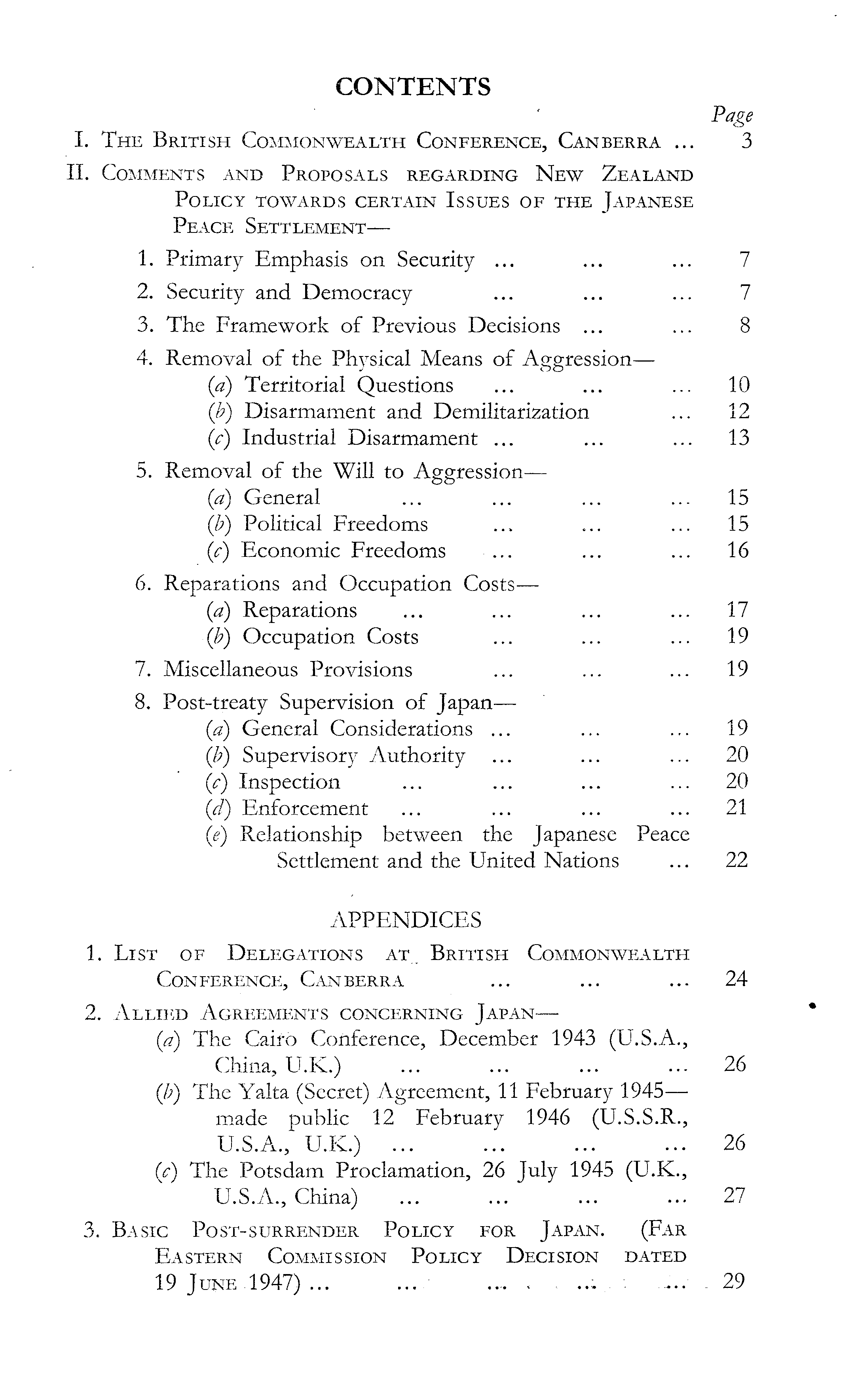 CONTENTS Page I. The British Commonwealth Conference, Canberra ... 3 11. Comments and Proposals regarding New Zealand Policy towards certain Issues of the Japanese Peace Settlement—1. Primary Emphasis on Security ... ... ... 7 2. Security and Democracy ... ... ... 7 3. The Framework of Previous Decisions ... ... 8 4. Removal of the Physical Means of Aggression—(a) Territorial Questions ... ... ... 10 ([b) Disarmament and Demilitarization ... 12 (c) Industrial Disarmament ... ... ... 13 5. Removal of the Will to Aggression—(a) General ... ... ... ... 15 (b) Political Freedoms ... ... ... 15 (V) Economic Freedoms ... ... ... 16 6. Reparations and Occupation Costs—{a) Reparations ... ... ... ... 17 (ib) Occupation Costs ... ... ... 19 7. Miscellaneous Provisions ... ... ... 19 8. Post-treaty Supervision of Japan—(a) General Considerations ... ... ... 19 (b) Supervisory Authority ... ... ... 20 (>) Inspection ... ... ... ... 20 (d) Enforcement ... ... ... ... 21 (e) Relationship between the Japanese Peace Settlement and the United Nations ... 22 APPENDICES 1. List of Delegations at , British Commonwealth Conference, Canberra ... ... ... 24 2. Allied Agreements concerning Japan—(a) The Cairo" Conference, December 1943 (U.S.A., China, U.K.) 26 (b) The Yalta (Secret) Agreement, 11 February 1945 made public 12 February 1946 (U.S.S.R., U.S.A., U.K.) 26 (c) The Potsdam Proclamation, 26 July 1945 (U.K., U.S.A., China) 27 3. Basic Post-surrender Policy for Japan. (Far Eastern Commission Policy Decision dated 19 June 1947) ... . w- 29