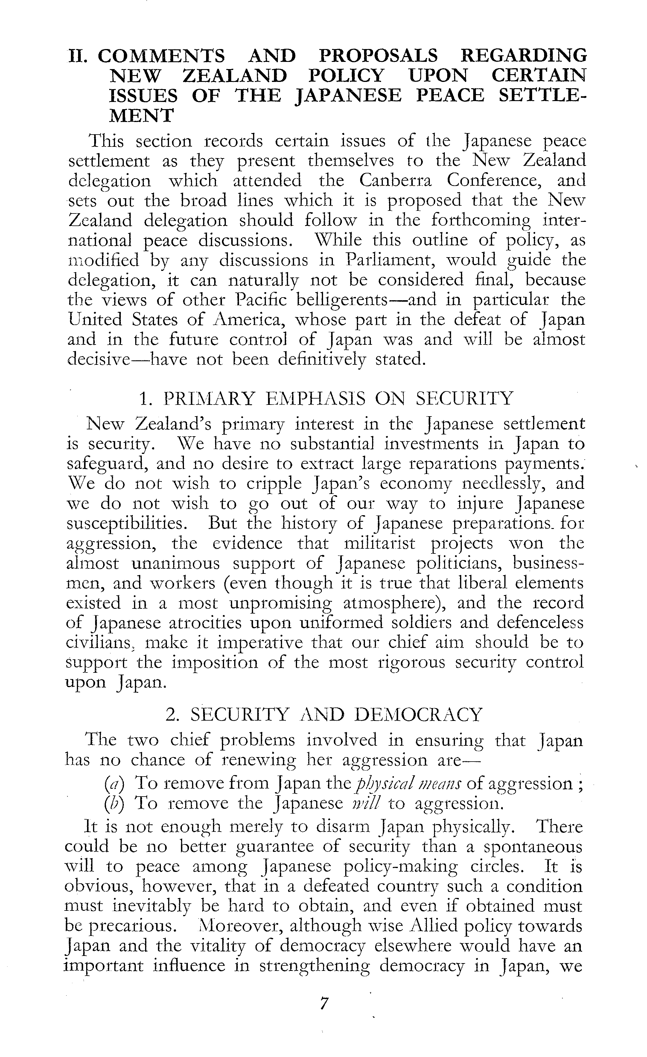 11. COMMENTS AND PROPOSALS REGARDING NEW ZEALAND POLICY UPON CERTAIN ISSUES OF THE JAPANESE PEACE SETTLEMENT This section records certain issues of the Japanese peace settlement as they present themselves to the New Zealand delegation which attended the Canberra Conference, and ■sets out the broad lines which it is proposed that the New Zealand delegation should follow in the forthcoming international peace discussions. While this outline of policy, as modified by any discussions in Parliament, would guide the delegation, it can naturally not be considered final, because tht views of other Pacific belligerents—and in particular the United States of America, whose part in the defeat of Japan and in the future control of Japan was and will be almost decisive—have not been definitively stated. 1. PRIMARY EMPHASIS ON SECURITY New Zealand's primary interest in the Japanese settlement is security. We have no substantial investments in Japan to safeguard, and no desire to extract large reparations payments. We do not wish to cripple Japan's economy needlessly, and we do not wish to go out of our way to injure Japanese susceptibilities. But the history of Japanese preparations, for aggression, the evidence that militarist projects won the almost unanimous support of Japanese politicians, businessmen, and workers (even though it is true that liberal elements existed in a most unpromising atmosphere), and the record of Japanese atrocities upon uniformed soldiers and defenceless civilians, make it imperative that our chief aim should be to support the imposition of the most rigorous security control upon Japan. 2. SECURITY AND DEMOCRACY The two chief problems involved in ensuring that Japan has no chance of renewing her aggression are — (a) To remove from Japan the physical means of aggression ; (b) To remove the Japanese will to aggression. It is not enough merely to disarm Japan physically. There could be no better guarantee of security than a spontaneous will to peace among Japanese policy-making circles. It is obvious, however, that in a defeated country such a condition must inevitably be hard to obtain, and even if obtained must be precarious. Moreover, although wise Allied policy towards Japan and the vitality of democracy elsewhere would have an important influence in strengthening democracy in Japan, we