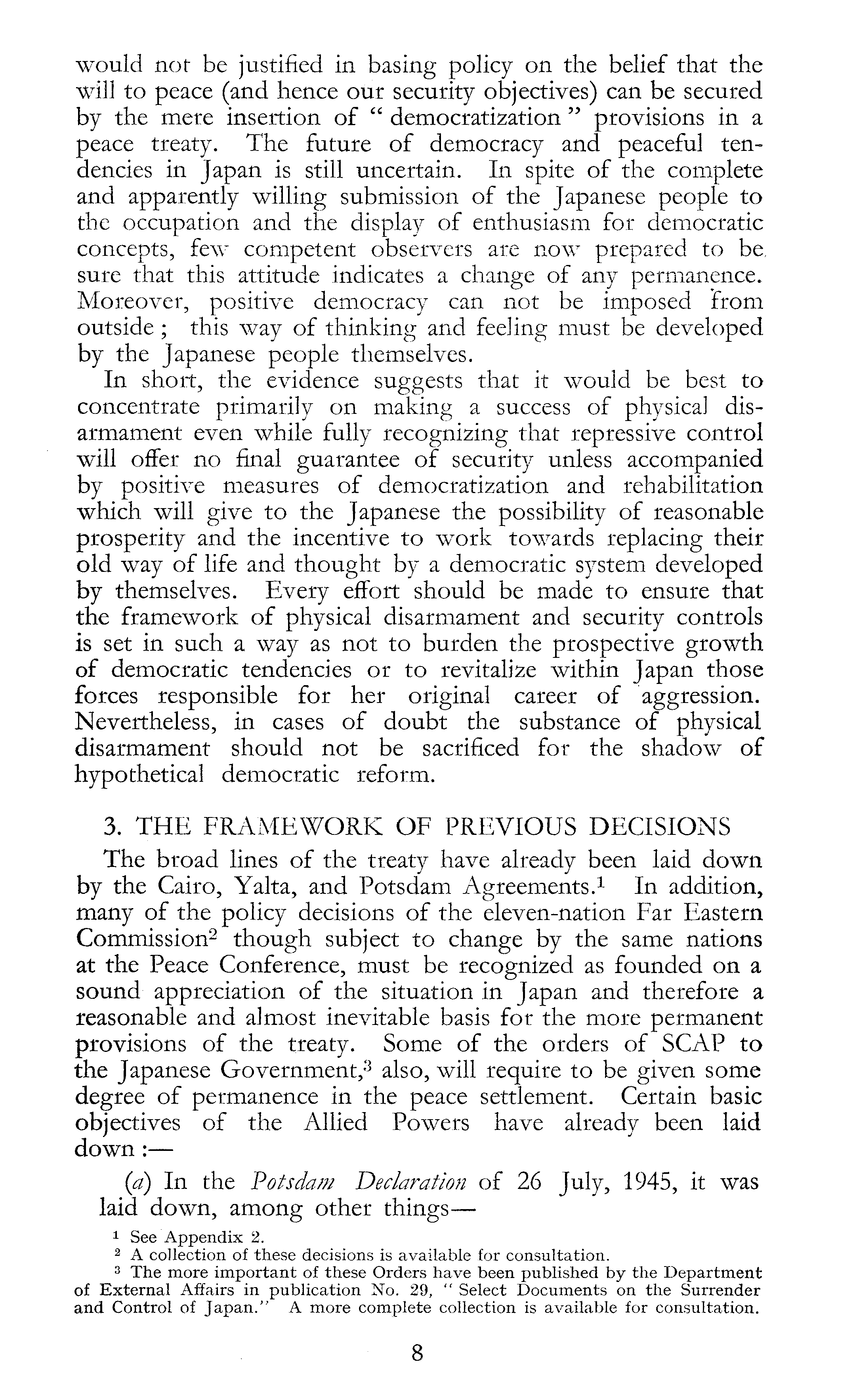 would not be justified in basing policy on the belief that the Will to peace (and hence our security objectives) can be secured by the mere insertion of " democratization " provisions in a peace treaty. The future of democracy and peaceful tendencies in Japan is still uncertain. In spite of the complete and apparently willing submission of the Japanese people to the occupation and the display of enthusiasm for democratic concepts, few competent observers are now prepared to be, sure that this attitude indicates a change of any permanence. Moreover, positive democracy can not be imposed from outside; this way of thinking and feeling must be developed by the Japanese people themselves. In short, the evidence suggests that it would be best to concentrate primarily on making a success of physical disarmament even while fully recognizing that repressive control will offer no final guarantee of security unless accompanied by positive measures of democratization and rehabilitation which will give to the Japanese the possibility of reasonable prosperity and the incentive to work towards replacing their old way of life and thought by a democratic system developed by themselves. Every effort should be made to ensure that the framework of physical disarmament and security controls is set in such a way as not to burden the prospective growth of democratic tendencies or to revitalize within Japan those forces responsible for her original career of aggression. Nevertheless, in cases of doubt the substance of physical disarmament should not be sacrificed for the shadow of hypothetical democratic reform. 3. THE FRAMEWORK OF PREVIOUS DECISIONS The broad lines of the treaty have already been laid down by the Cairo, Yalta, and Potsdam Agreements. 1 In addition, many of the policy decisions of the eleven-nation Far Eastern Commission 2 though subject to change by the same nations at the Peace Conference, must be recognized as founded on a sound appreciation of the situation in Japan and therefore a reasonable and almost inevitable basis for the more permanent provisions of the treaty. Some of the orders of SCAP to the Japanese Government, 3 also, will require to be given some degree of permanence in the peace settlement. Certain basic objectives of the Allied Powers have already been laid down: — (a) In the Potsdam Declaration of 26 July, 1945, it was laid down, among other things—--1 See Appendix 2. 2 A collection of these decisions is available for consultation. 3 The more important of these Orders have been published by the Department of External Affairs in publication No. 29, " Select Documents on the Surrender and Control of Japan." A more complete collection is available for consultation.