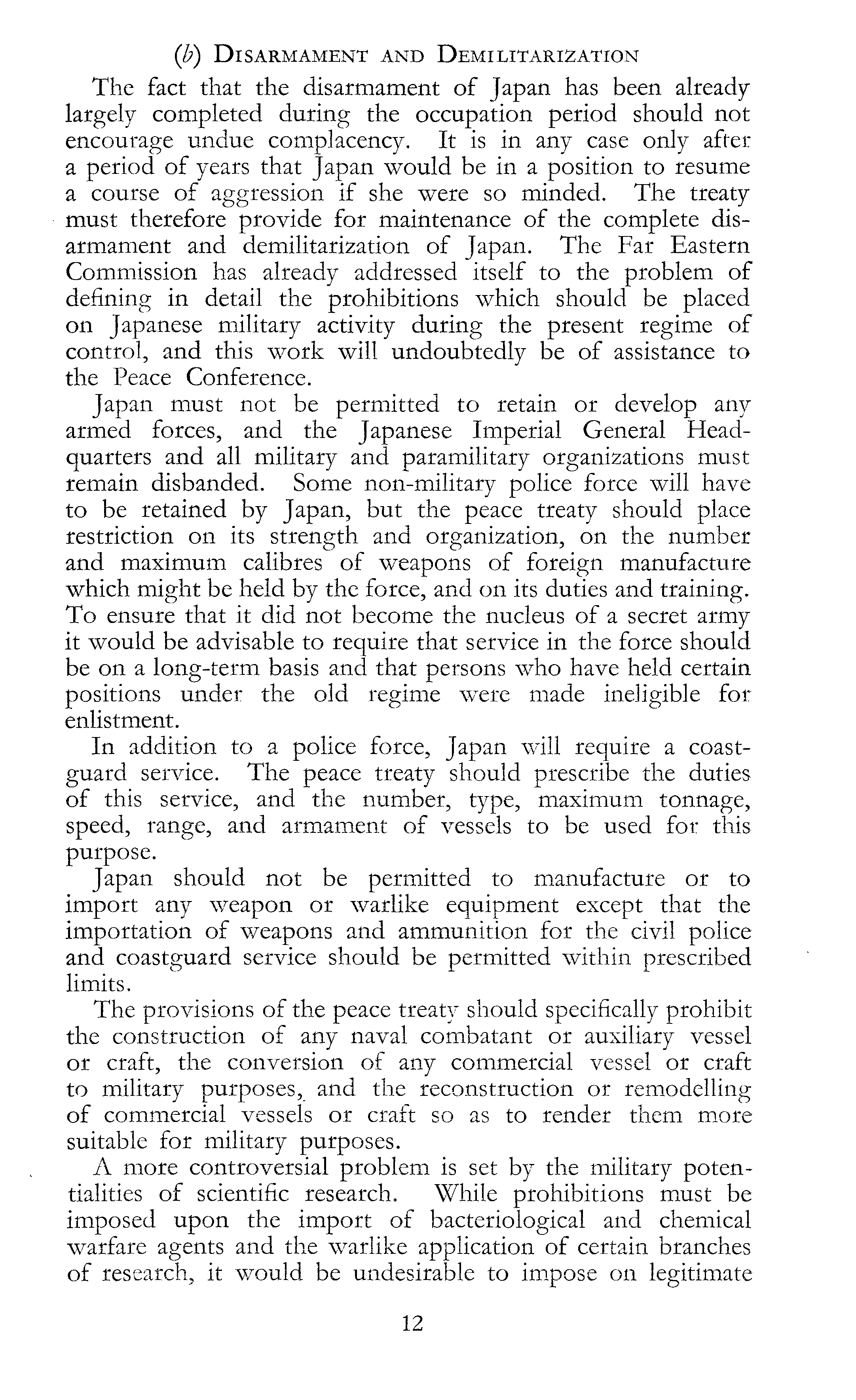 (b) Disarmament and Demilitarization The fact that the disarmament of Japan has been already largely completed during the occupation period should not encourage undue complacency. It is in any case only after a period of years that Japan would be in a position to resume a course of aggression if she were so minded. The treaty must therefore provide for maintenance of the complete disarmament and demilitarization of Japan. The Far Eastern Commission has already addressed itself to the problem of defining in detail the prohibitions which should be placed on Japanese military activity during the present regime of control, and this work will undoubtedly be of assistance to the Peace Conference. Japan must not be permitted to retain or develop any armed forces, and the Japanese Imperial General Headquarters and all military and paramilitary organizations must remain disbanded. Some non-military police force will have to be retained by Japan, but the peace treaty should place restriction on its strength and organization, on the number and maximum calibres of weapons of foreign manufacture which might be held by the force, and on its duties and training. To ensure that it did not become the nucleus of a secret army it would be advisable to require that service in the force should be on a long-term basis and that persons who have held certain positions under the old regime were made ineligible for enlistment. In addition to a police force, Japan will require a coastguard service. The peace treaty should prescribe the duties of this service, and the number, type, maximum tonnage, speed, range, and armament of vessels to be used for this purpose. Japan should not be permitted to manufacture or to import any weapon or warlike equipment except that the importation of weapons and ammunition for the civil police and coastguard service should be permitted within prescribed limits. The provisions of the peace treaty should specifically prohibit the construction of any naval combatant or auxiliary vessel or craft, the conversion of any commercial vessel or craft to military purposes, and the reconstruction or remodelling of commercial vessels or craft so as to render them more suitable for military purposes. A more controversial problem is set by the military potentialities of scientific research. While prohibitions must be imposed upon the import of bacteriological and chemical warfare agents and the warlike application of certain branches of research, it would be undesirable to impose on legitimate