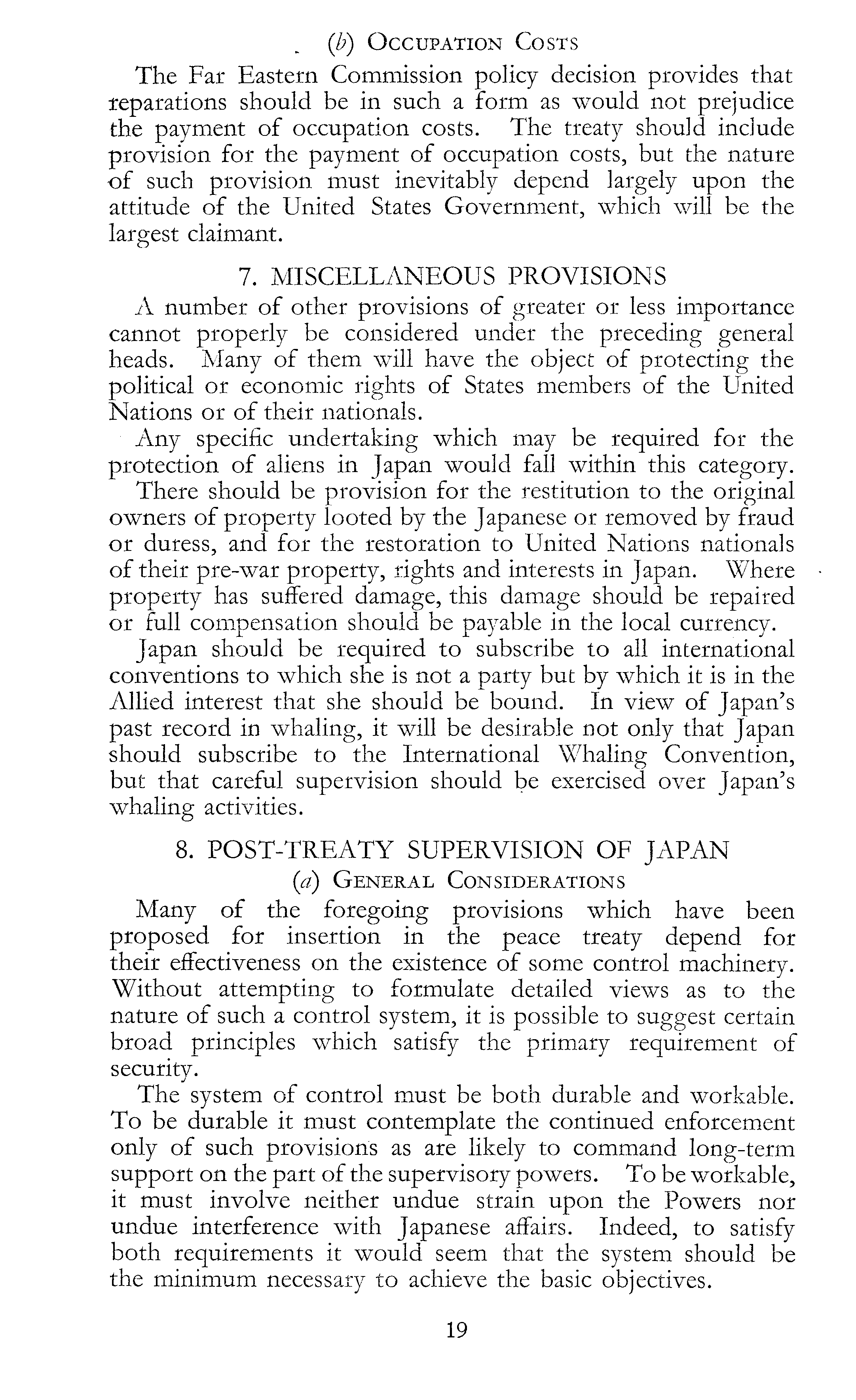 (b) Occupation Costs The Far Eastern Commission policy decision provides that reparations should be in such a form as would not prejudice the payment of occupation costs. The treaty should include provision for the payment of occupation costs, but the nature of such provision must inevitably depend largely upon the attitude of the United States Government, which will be the largest claimant. 7. MISCELLANEOUS PROVISIONS A number of other provisions of greater or less importance cannot properly be considered under the preceding general heads. Many of them will have the object of protecting the political or economic rights of States members of the United Nations or of their nationals. Any specific undertaking which may be required for the protection of aliens in Japan would fall within this category. There should be provision for the restitution to the original owners of property looted by the Japanese or removed by fraud or duress, and for the restoration to United Nations nationals of their pre-war property, rights and interests in Japan. Where property has suffered damage, this damage should be repaired or full compensation should be payable in the local currency. Japan should be required to subscribe to all international conventions to which she is not a party but by which it is in the Allied interest that she should be bound. In view of Japan's past record in whaling, it will be desirable not only that Japan should subscribe to the International Whaling Convention, but that careful supervision should be exercised over Japan's whaling activities. 8. POST-TREATY SUPERVISION OF JAPAN (a) General Considerations Many of the foregoing provisions which have been proposed for insertion in the peace treaty depend for their effectiveness on the existence of some control machinery. Without attempting to formulate detailed views as to the nature of such a control system, it is possible to suggest certain broad principles which satisfy the primary requirement of security. The system of control must be both durable and workable. To be durable it must contemplate the continued enforcement only of such provisions as are likely to command long-term support on the part of the supervisory powers. To be workable, it must involve neither undue strain upon the Powers nor undue interference with Japanese affairs. Indeed, to satisfy both requirements it would seem that the system should be the minimum necessary to achieve the basic objectives.