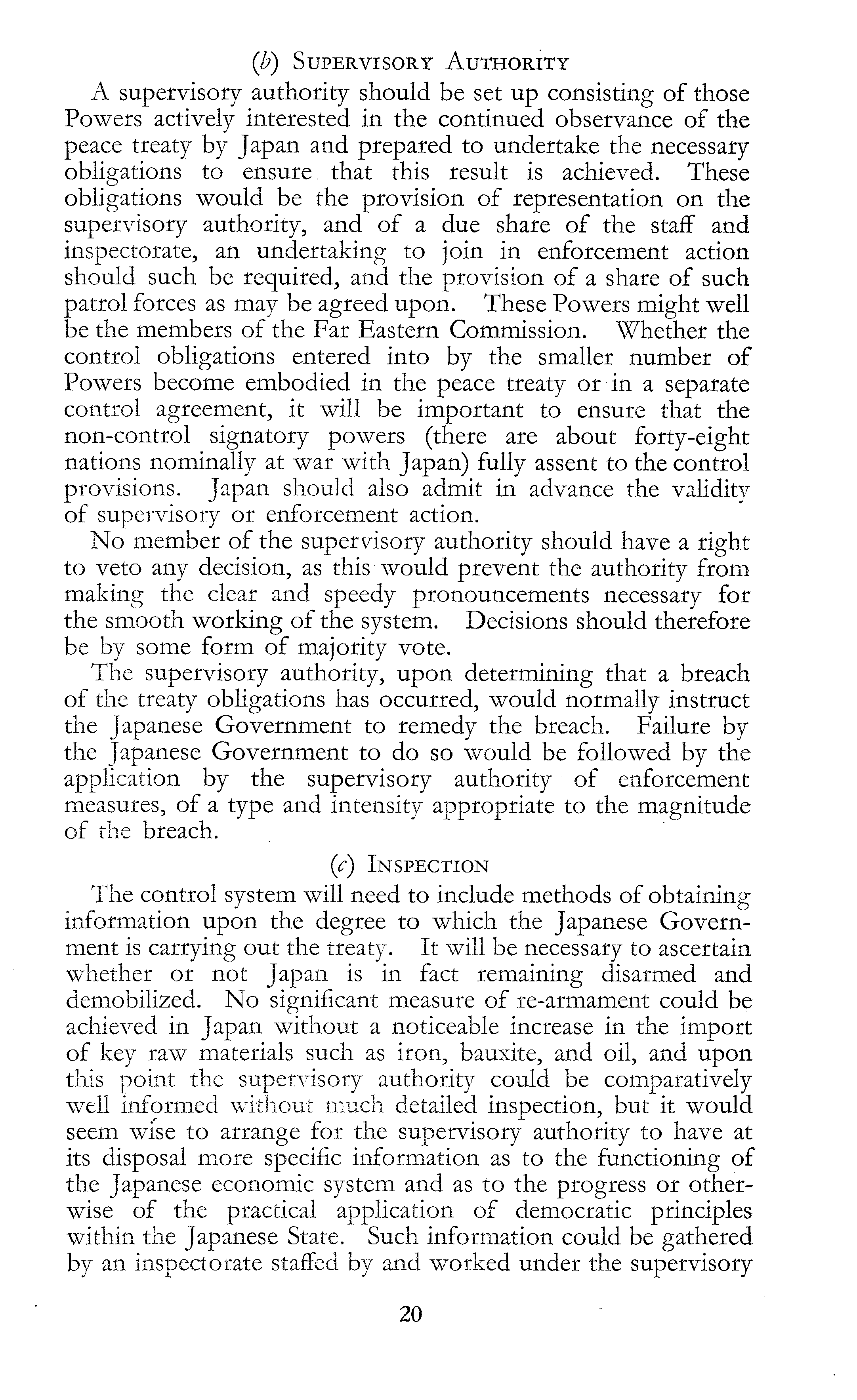 (b) Supervisory Authority A supervisory authority should be set up consisting of those Powers actively interested in the continued observance of the peace treaty by Japan and prepared to undertake the necessary obligations to ensure that this result is achieved. These obligations would be the provision of representation on the supervisory authority, and of a due share of the staff and inspectorate, an undertaking to join in enforcement action should such be required, and the provision of a share of such patrol forces as may be agreed upon. These Powers might well be the members of the Far Eastern Commission. Whether the control obligations entered into by the smaller number of Powers become embodied in the peace treaty or in a separate control agreement, it will be important to ensure that the non-control signatory powers (there are about forty-eight nations nominally at war with Japan) fully assent to the control provisions. Japan should also admit in advance the validity of supervisory or enforcement action. No member of the supervisory authority should have a right to veto any decision, as this would prevent the authority from making the clear and speedy pronouncements necessary for the smooth working of the system. Decisions should therefore be by some form of majority vote. The supervisory authority, upon determining that a breach of the treaty obligations has occurred, would normally instruct the Japanese Government to remedy the breach. Failure by the Japanese Government to do so would be followed by the application by the supervisory authority of enforcement measures, of a type and intensity appropriate to the magnitude of the breach. (/) Inspection The control system will need to include methods of obtaining information upon the degree to which the Japanese Government is carrying out the treaty. It will be necessary to ascertain whether or not Japan is in fact remaining disarmed and demobilized. No significant measure of re-armament could be achieved in Japan without a noticeable increase in the import of key raw materials such as iron, bauxite, and oil, and upon this point the supervisory authority could be comparatively well informed without much detailed inspection, but it would seem wise to arrange for the supervisory authority to have at its disposal more specific information as to the functioning of the Japanese economic system and as to the progress or otherwise of the practical application of democratic principles within the Japanese State. Such information could be gathered by an inspectorate staffed by and worked under the supervisory