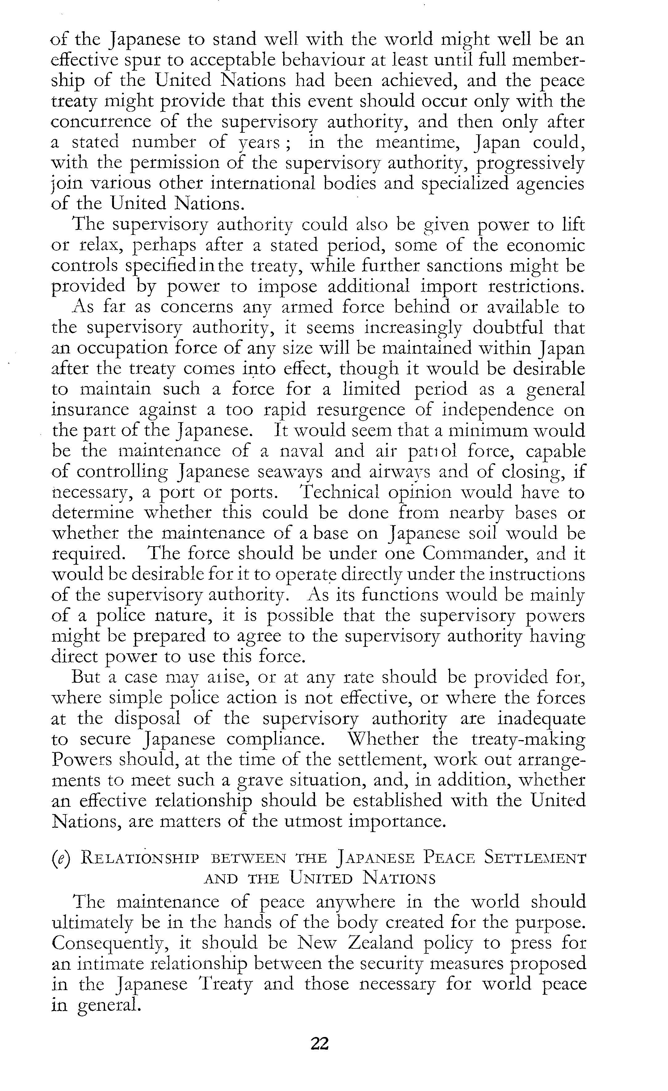 of the Japanese to stand well with the world might well be an effective spur to acceptable behaviour at least until full membership of the United Nations had been achieved, and the peace treaty might provide that this event should occur only with the concurrence of the supervisory authority, and then only after a stated number of years ; in the meantime, Japan could, with the permission of the supervisory authority, progressively join various other international bodies and specialized agencies of the United Nations. The supervisory authority could also be given power to lift or relax, perhaps after a stated period, some of the economic controls specified in the treaty, while further sanctions might be provided by power to impose additional import restrictions. As far as concerns any armed force behind or available to the supervisory authority, it seems increasingly doubtful that an occupation force of any size will be maintained within Japan after the treaty comes into effect, though it would be desirable to maintain such a force for a limited period as a general insurance against a too rapid resurgence of independence on the part of the Japanese. It would seem that a minimum would be the maintenance of a naval and air pattol force, capable of controlling Japanese seaways and airways and of closing, if necessary, a port or ports. Technical opinion would have to determine whether this could be done from nearby bases or whether the maintenance of abase on Japanese soil would be required. The force should be under one Commander, and it would be desirable for it to operate directly under the instructions of the supervisory authority. As its functions would be mainly of a police nature, it is possible that the supervisory powers might be prepared to agree to the supervisory authority having direct power to use this force. But a case may aiise, or at any rate should be provided for, where simple police action is not effective, or where the forces at the disposal of the supervisory authority are inadequate to secure Japanese compliance. Whether the treaty-making Powers should, at the time of the settlement, work out arrangements to meet such a grave situation, and, in addition, whether an effective relationship should be established with the United Nations, are matters of the utmost importance. (e) Relationship between the Japanese Peace Settlement and the United Nations The maintenance of peace anywhere in the world should ultimately be in the hands of the body created for the purpose. Consequently, it should be New Zealand policy to press for an intimate relationship between the security measures proposed in the Japanese Treaty and those necessary for world peace in general.