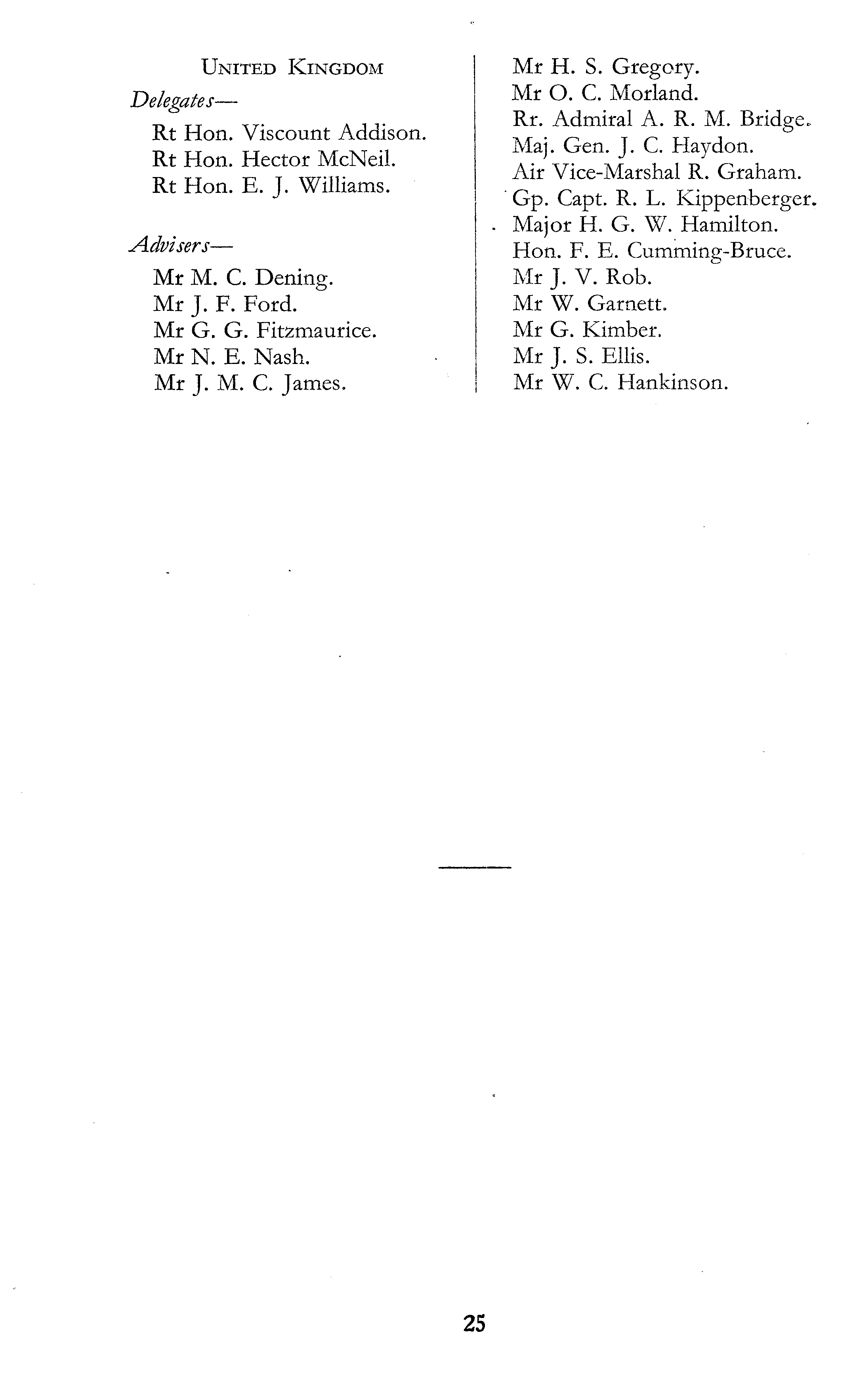 United Kingdom Delegates— Rt Hon. Viscount Addison. Rt Hon. Hector McNeil. Rt Hon. E. J. Williams. A.dvisers— Mr M. C. Dening. Mr J. F. Ford. Mr G. G. Fitzmaurice. Mr N. E. Nash. Mr J. M. C. James.