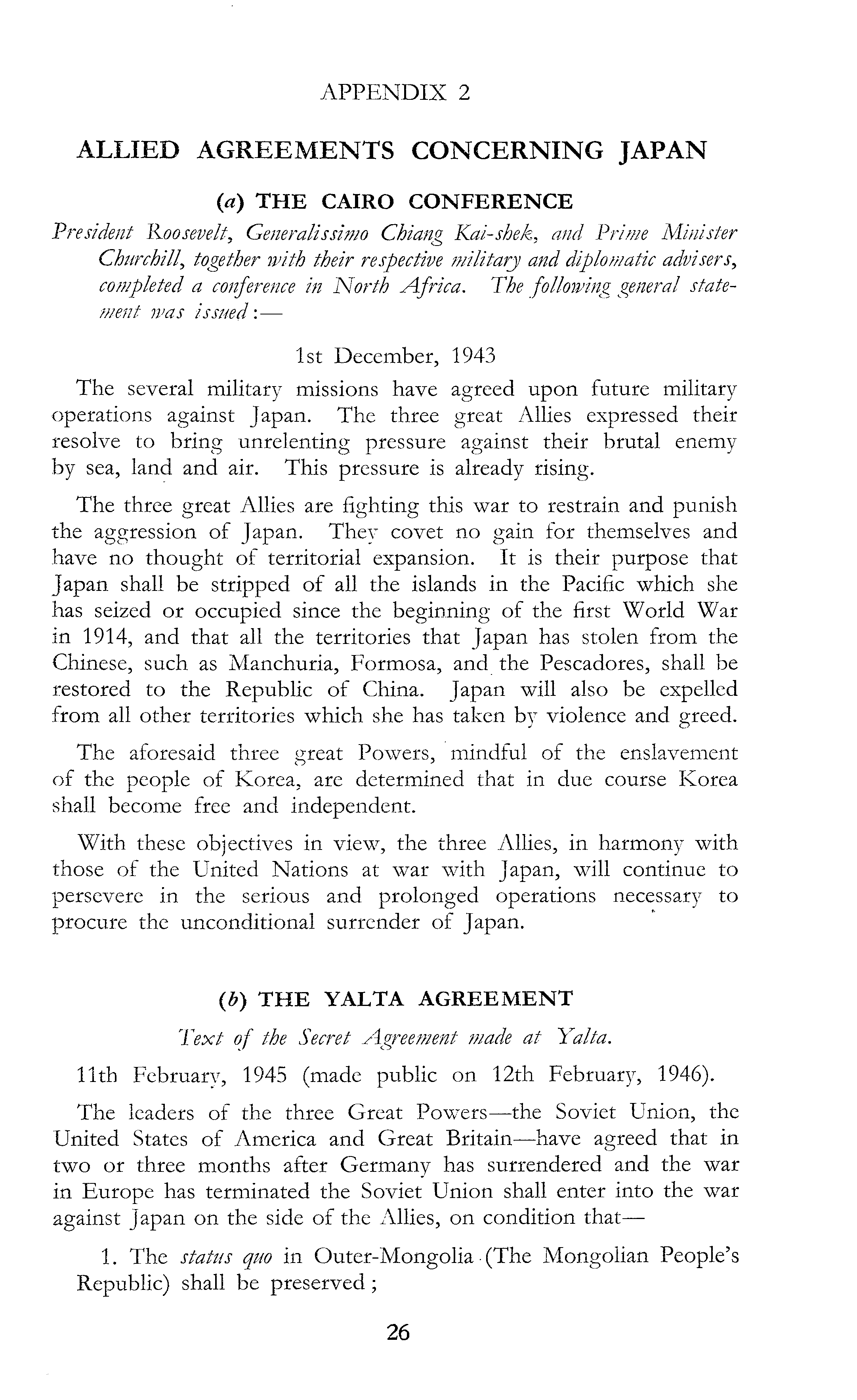 APPENDIX 2 ALLIED AGREEMENTS CONCERNING JAPAN (a) THE CAIRO CONFERENCE President Roosevelt, Generalissimo Chiang Kai-shek, and Prime Minister Churchill, together with their respective military and diplomatic advisers, completed a conference in North Africa. The following general statement was issued Ist December, 1943 The several military missions have agreed upon future military operations against Japan. The three great Allies expressed their resolve to bring unrelenting pressure against their brutal enemy by sea, land and air. This pressure is already rising. The three great Allies are fighting this war to restrain and punish the aggression of Japan. They covet no gain for themselves and have no thought of territorial expansion. It is their purpose that Japan shall be stripped of all the islands in the Pacific which she has seized or occupied since the beginning of the first World War in 1914, and that all the territories that Japan has stolen from the Chinese, such as Manchuria, Formosa, and the Pescadores, shall be restored to the Republic of China. Japan will also be expelled from all other ter-ritories which she has taken by violence and greed. The aforesaid three great Powers, mindful of the enslavement of the people of Korea, are determined that in due course Korea shall become free and independent. With these objectives in view, the three Allies, in harmony with those of the United Nations at war with Japan, will continue to persevere in the serious and prolonged operations necessary to procure the unconditional surrender of Japan. (b) THE YALTA AGREEMENT Text of the Secret Agreement made at Yalta. 11th February, 1945 (made public on 12th February, 1946). The leaders of the three Great Powers —the Soviet Union, the United States of America and Great Britain —have agreed that in two or three months after Germany has surrendered and the war in Europe has terminated the Soviet Union shall enter into the war against Japan on the side of the Allies, on condition that—1. The status quo in Outer-Mongolia. (The Mongolian People's Republic) shall be preserved;