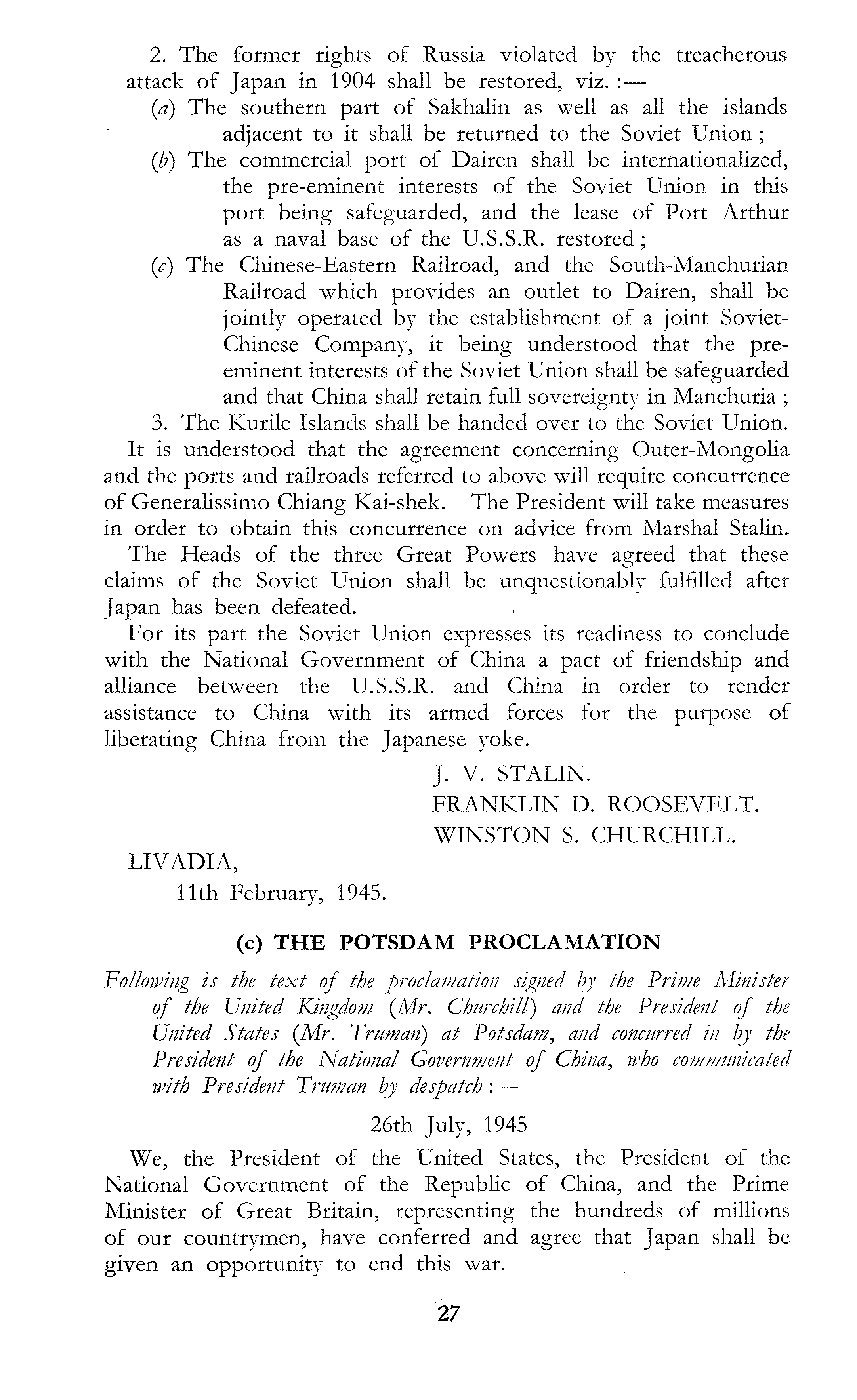 2. The former rights of Russia violated by the treacherous attack of Japan in 1904 shall be restored, viz.:— (a) The southern part of Sakhalin as well as all the islands adjacent to it shall be returned to the Soviet Union; (b) The commercial port of Dairen shall be internationalized, the pre-eminent interests of the Soviet Union in this port being safeguarded, and the lease of Port Arthur as a naval base of the U.S.S.R. restored; (V) The Chinese-Eastern Railroad, and the South-Manchurian Railroad which provides an outlet to Dairen, shall be jointly operated by the establishment of a joint SovietChinese Company, it being understood that the preeminent interests of the Soviet Union shall be safeguarded and that China shall retain full sovereignty in Manchuria ; 3. The Kurile Islands shall be handed over to the Soviet Union. It is understood that the agreement concerning Outer-Mongolia and the ports and railroads referred to above will require concurrence of Generalissimo Chiang Kai-shek. The President will take measures in order to obtain this concurrence on advice from Marshal Stalin. The Heads of the three Great Powers have agreed that these claims of the Soviet Union shall be unquestionably fulfilled after Japan has been defeated. For its part the Soviet Union expresses its readiness to conclude with the National Government of China a pact of friendship and alliance between the U.S.S.R. and China in order to render assistance to China with its armed forces for the purpose of liberating China from the Japanese yoke. J. V. STALIN. FRANKLIN D. ROOSEVELT. WINSTON S. CHURCHILL. LIVADIA, 11th February, 1945. (c) THE POTSDAM PROCLAMATION Following is the text of the proclamation signed by the Prime Minister of the United Kingdom (Mr. Churchill) and the President of the United States (Mr. Truman) at Potsdam, and concurred in by the President of the 'National Government of China, who communicated with President Truman by despatch : 26th July, 1945 We, the President of the United States, the President of the National Government of the Republic of China, and the Prime Minister of Great Britain, representing the hundreds of millions of our countrymen, have conferred and agree that Japan shall be given an opportunity to end this war.