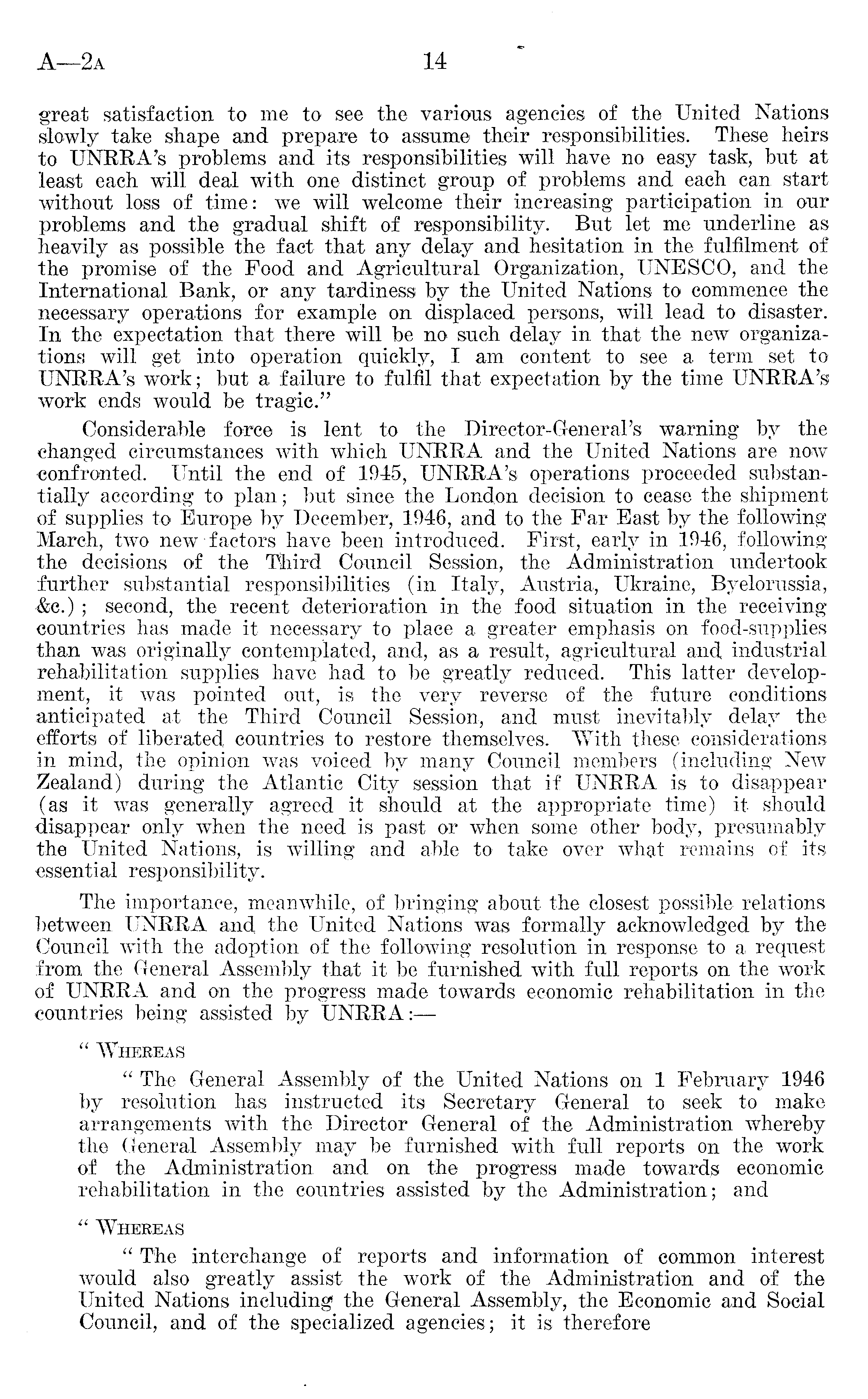 great satisfaction to me to see the various agencies of the United Nations slowly take shape and prepare to assume their responsibilities. These heirs to UNRRA's problems and its responsibilities will have no easy task, but at least each will deal with one distinct group of problems and each can start without loss of time: we will welcome their increasing participation in our problems and the gradual shift of responsibility. But let me underline as heavily as possible the fact that any delay and hesitation in the fulfilment of the promise of the Food and Agricultural Organization, UNESCO, and the International Bank, or any tardiness by the United Nations to commence the necessary operations for example on displaced persons, will lead to disaster. In the expectation that there will be no such delay in that the new organizations will get into operation quickly, I am content to see a term set to UNRRA's work; but a failure to fulfil that expectation by the time UNRRA's work ends would be tragic." Considerable force is lent to the Director-General's warning by the changed circumstances with which UNRRA and the United Nations are .now confronted. Until the end of 1945, UNRRA's operations proceeded substantially according to plan; but since the London decision to cease the shipment of supplies to Europe by December, 1946, and to the Far East by the following March, two new factors have been introduced, First, early in 1946, following the decisions of the Third Council Session, the Administration undertook further substantial responsibilities (in Italy, Austria, Ukraine, Byelorussia, &c.) ; second, the recent deterioration in the food situation in the receiving countries has made it necessary to place a greater emphasis on food-supplies than was originally contemplated, and, as a result, agricultural and industrial rehabilitation supplies have had to be greatly reduced. This latter development, it was pointed out, is the very reverse of the future conditions anticipated at the Third Council Session, and must inevitably delay the efforts of liberated countries to restore themselves, With these considerations in mind, the opinion was voiced by many Council members (including New Zealand) during the Atlantic City session that if UNRRA is to disappear (as it was generally agreed it should at the appropriate time) it should disappear only when the need is past or when some other body, presumably the United Nations, is willing and able to take over what remains of its essential responsibility. The importance, meanwhile, of bringing about the closest possible relations between UNRRA and the United Nations was formally acknowledged by the Council with the adoption of the following resolution in response to a request from the General Assembly that it be furnished with full reports on the work of UNRRA and on the progress made towards economic rehabilitation in the countries being assisted by UNRRA:— " Whereas " The General Assembly of the United Nations on 1 February 1946 by resolution has instructed its Secretary General to seek to make arrangements with the Director General of the Administration whereby the General Assembly may be furnished with full reports on the work of the Administration and on the progress made towards economic rehabilitation in the countries assisted by the Administration; and ut Whereas " The interchange of reports and information of common interest would also greatly assist the work of the Administration and of the United Nations including the General Assembly, the Economic and Social Council, and of the specialized agencies; it is therefore