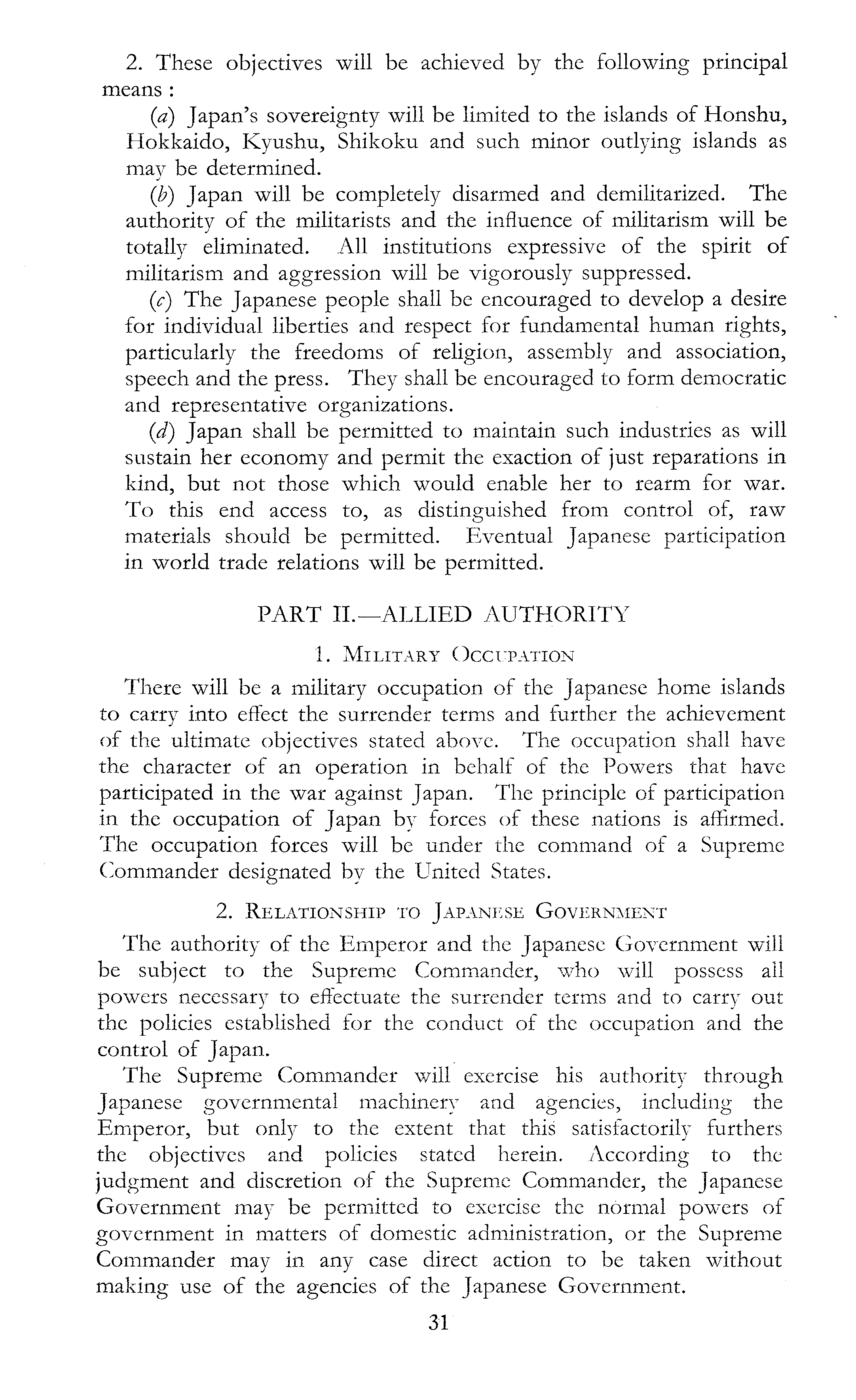 2. These objectives will be achieved by the following principal means : (a) Japan's sovereignty will be limited to the islands of Honshu, Hokkaido, Kyushu, Shikoku and such minor outlying islands as may be determined. (b) Japan will be completely disarmed and demilitarized. The authority of the militarists and the influence of militarism will be totally eliminated. All institutions expressive of the spirit of militarism and aggression will be vigorously suppressed. (c) The Japanese people shall be encouraged to develop a desire for individual liberties and respect for fundamental human rights, particularly the freedoms of religion, assembly and association, speech and the press. They shall be encouraged to form democratic and representative organizations. (d) Japan shall be permitted to maintain such industries as will sustain her economy and permit the exaction of just reparations in kind, but not those which would enable her to rearm for war. To this end access to, as distinguished from control of, raw materials should be permitted. Eventual Japanese participation in world trade relations will be permitted. PART IL—ALLIED AUTHORITY 1. Military Occupation There will be a military occupation of the Japanese home islands to carry into effect the surrender terms and further the achievement of the ultimate objectives stated above. The occupation shall have the character of an operation in behalf of the Powers that have participated in the war against Japan. The principle of participation in the occupation of Japan by forces of these nations is affirmed. The -occupation forces will be under the command of a Supreme Commander designated by the United States. 2. Relationship to Japanese Government The authority of the Emperor and the Japanese Government will be subject to the Supreme Commander, who will possess ail powers necessary to effectuate the surrender terms and to carry out the policies established for the conduct of the occupation and the control of Japan. The Supreme Commander will exercise his authority through Japanese governmental machinery and agencies, including the Emperor, but only to the extent that this satisfactorily furthers the objectives and policies stated herein. According to the judgment and discretion of the Supreme Commander, the Japanese Government may be permitted to exercise the normal powers of government in matters of domestic administration, or the Supreme Commander may in any case direct action to be taken without making use of the agencies of the Japanese Government.