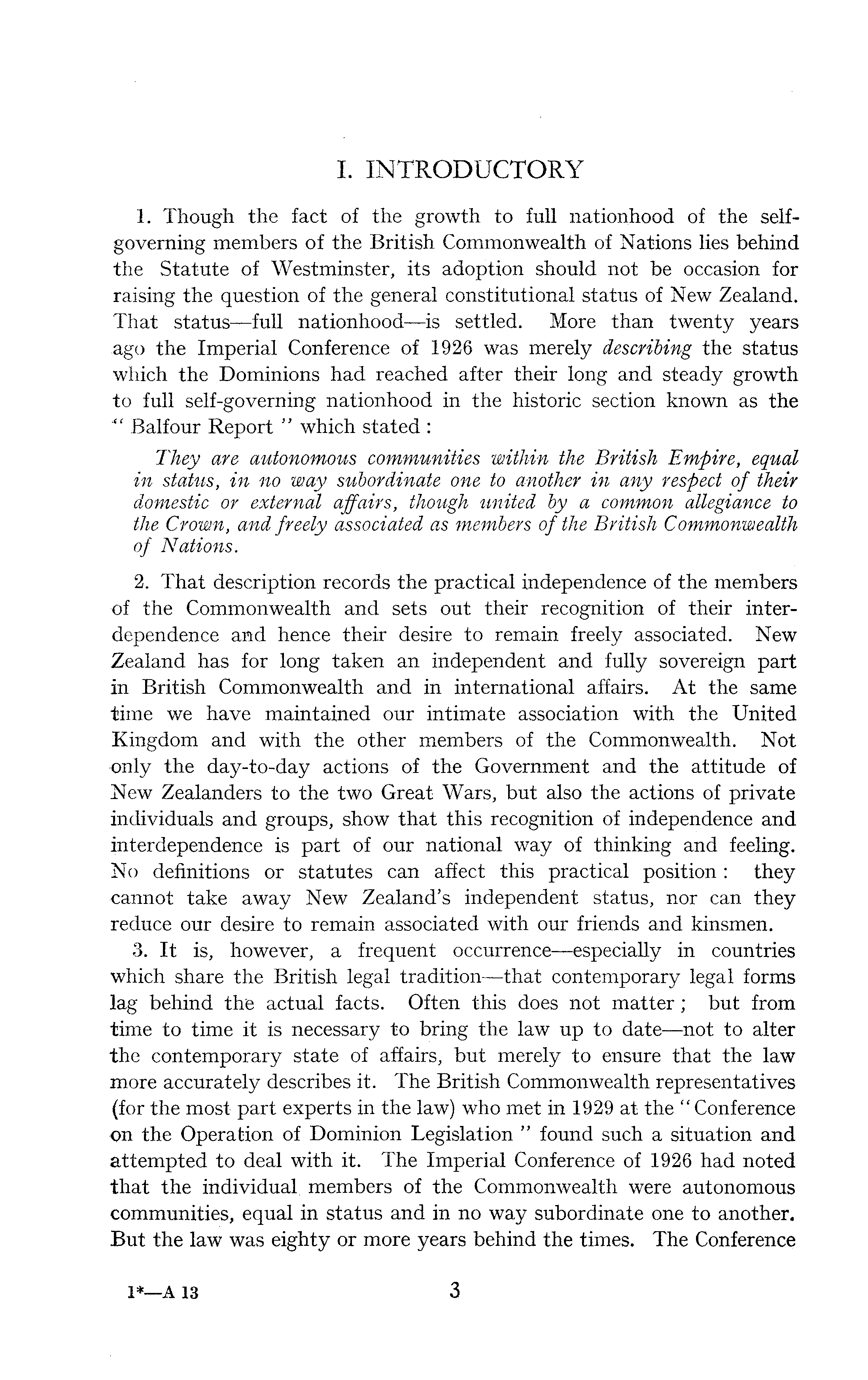 I. INTRODUCTORY 1. Though the fact of the growth to full nationhood of the selfgoverning members of the British Commonwealth of Nations lies behind the Statute of Westminster, its adoption should not be occasion for raising the question of the general constitutional status of New Zealand. That status —full nationhood —is settled. More than twenty years ago the Imperial Conference of 1926 was merely describing the status which the Dominions had reached after their long and steady growth to full self-governing nationhood in the historic section known as the Balfour Report " which stated : They are autonomous communities within the British Empire, equal in status, in no way subordinate one to another in any respect of their domestic or external affairs, though united by a common allegiance to the Crown, and freely associated as members of the British Commonwealth of Nations. 2. That description records the practical independence of the members ■of the Commonwealth and sets out their recognition of their interdependence and hence their desire to remain freely associated. New Zealand has for long taken an independent and fully sovereign part in British Commonwealth and in international affairs. At the same time we have maintained our intimate association with the United Kingdom and with the other members of the Commonwealth. Not only the day-to-day actions of the Government and the attitude of New Zealanders to the two Great Wars, but also the actions of private individuals and groups, show that this recognition of independence and interdependence is part of our national way of thinking and feeling. No definitions or statutes can affect this practical position: they cannot take away New Zealand's independent status, nor can they reduce our desire to remain associated with our friends and kinsmen. 3. It is, however, a frequent occurrence—especially in countries which share the British legal tradition —that contemporary legal forms lag behind the actual facts. Often this does not matter; but from time to time it is necessary to bring the law up to date —not to alter the contemporary state of affairs, but merely to ensure that the law more accurately describes it. The British Commonwealth representatives (for the most part experts in the law) who met in 1929 at the " Conference on the Operation of Dominion Legislation " found such a situation and attempted to deal with it. The Imperial Conference of 1926 had noted that the individual members of the Commonwealth were autonomous communities, equal in status and in no way subordinate one to another. But the law was eighty or more years behind the times. The Conference