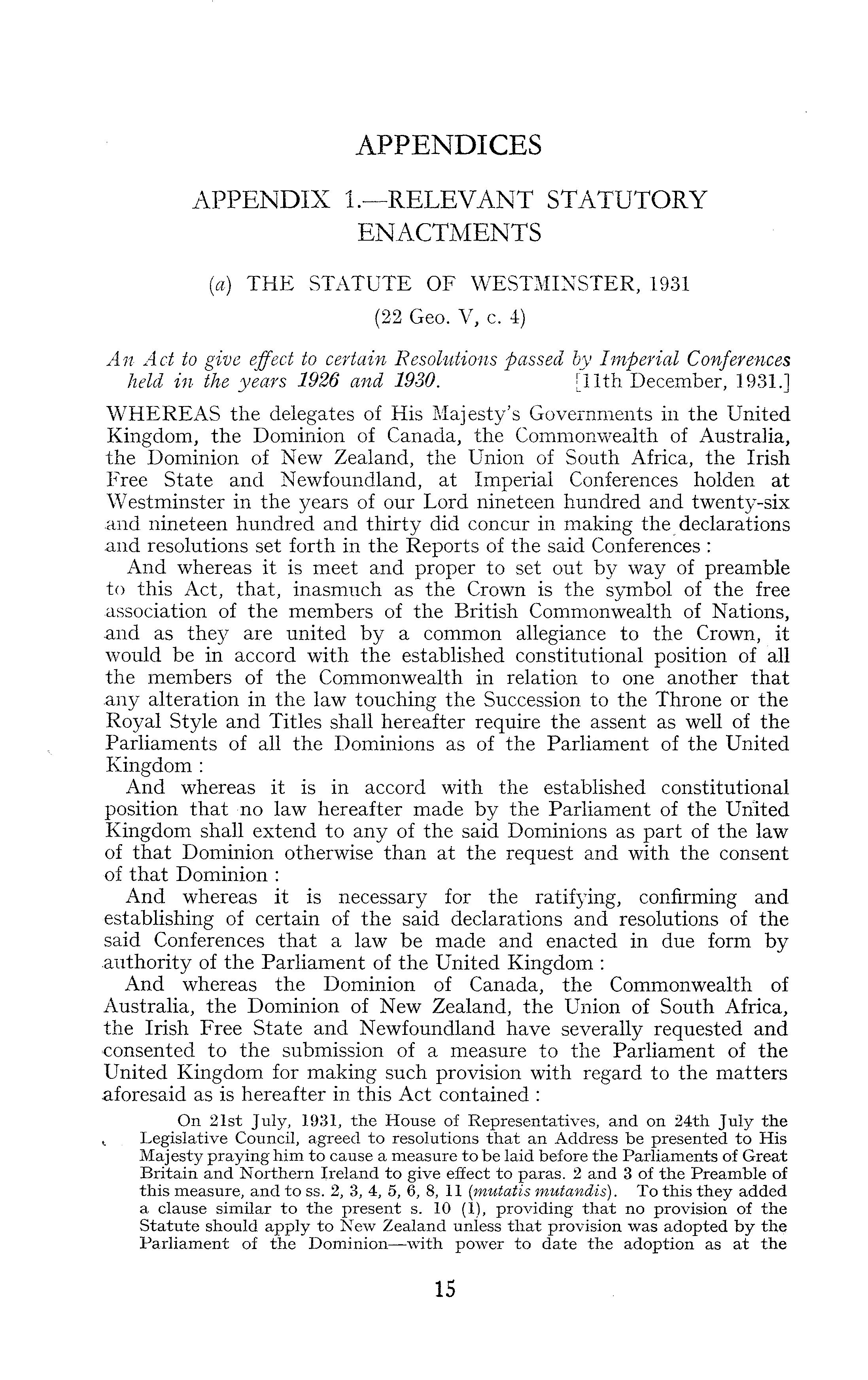 APPENDICES APPENDIX I.—RELEVANT STATUTORY ENACTMENTS (a) THE STATUTE OF WESTMINSTER, 1931 (22 Geo. V, c. 4) An Act to give effect to certain Resolutions passed by Imperial Conferences held in the years 1926 and 1930. [llth December, 1931.] WHEREAS the delegates of His Majesty's Governments in the United Kingdom, the Dominion of Canada, the Commonwealth of Australia, the Dominion of New Zealand, the Union of South Africa, the Irish Free State and Newfoundland, at Imperial Conferences holden at Westminster in the years of our Lord nineteen hundred and twenty-six and nineteen hundred and thirty did concur in making the declarations and resolutions set forth in the Reports of the said Conferences : And whereas it is meet and proper to set out by way of preamble to this Act, that, inasmuch as the Crown is the symbol of the free association of the members of the British Commonwealth of Nations, and as they are united by a common allegiance to the Crown, it would be in accord with the established constitutional position of all the members of the Commonwealth in relation to one another that any alteration in the law touching the Succession to the Throne or the Royal Style and Titles shall hereafter require the assent as well of the Parliaments of all the Dominions as of the Parliament of the United Kingdom : And whereas it is in accord with the established constitutional position that no law hereafter made by the Parliament of the United Kingdom shall extend to any of the said Dominions as part of the law of that Dominion otherwise than at the request and with the consent of that Dominion : And whereas it is necessary for the ratifying, confirming and establishing of certain of the said declarations and resolutions of the said Conferences that a law be made and enacted in due form by authority of the Parliament of the United Kingdom : And whereas the Dominion of Canada, the Commonwealth of Australia, the Dominion of New Zealand, the Union of South Africa, the Irish Free State and Newfoundland have severally requested and consented to the submission of a measure to the Parliament of the United Kingdom for making such provision with regard to the matters aforesaid as is hereafter in this Act contained : On 21st July, 1931, the House of Representatives, and on 24th. July the t Legislative Council, agreed to resolutions that an Address be presented to His Majesty praying him to cause a measure to be laid before the Parliaments of Great Britain and Northern Ireland to give effect to paras. 2 and 3 of the Preamble of this measure, and to ss. 2, 3, 4, 5, 6, 8, 11 (mutatis mutandis). To this they added a clause similar to the present s. 10 (1), providing that no provision of the Statute should apply to New Zealand unless that provision was adopted by the Parliament of the Dominion—with power to date the adoption as at the