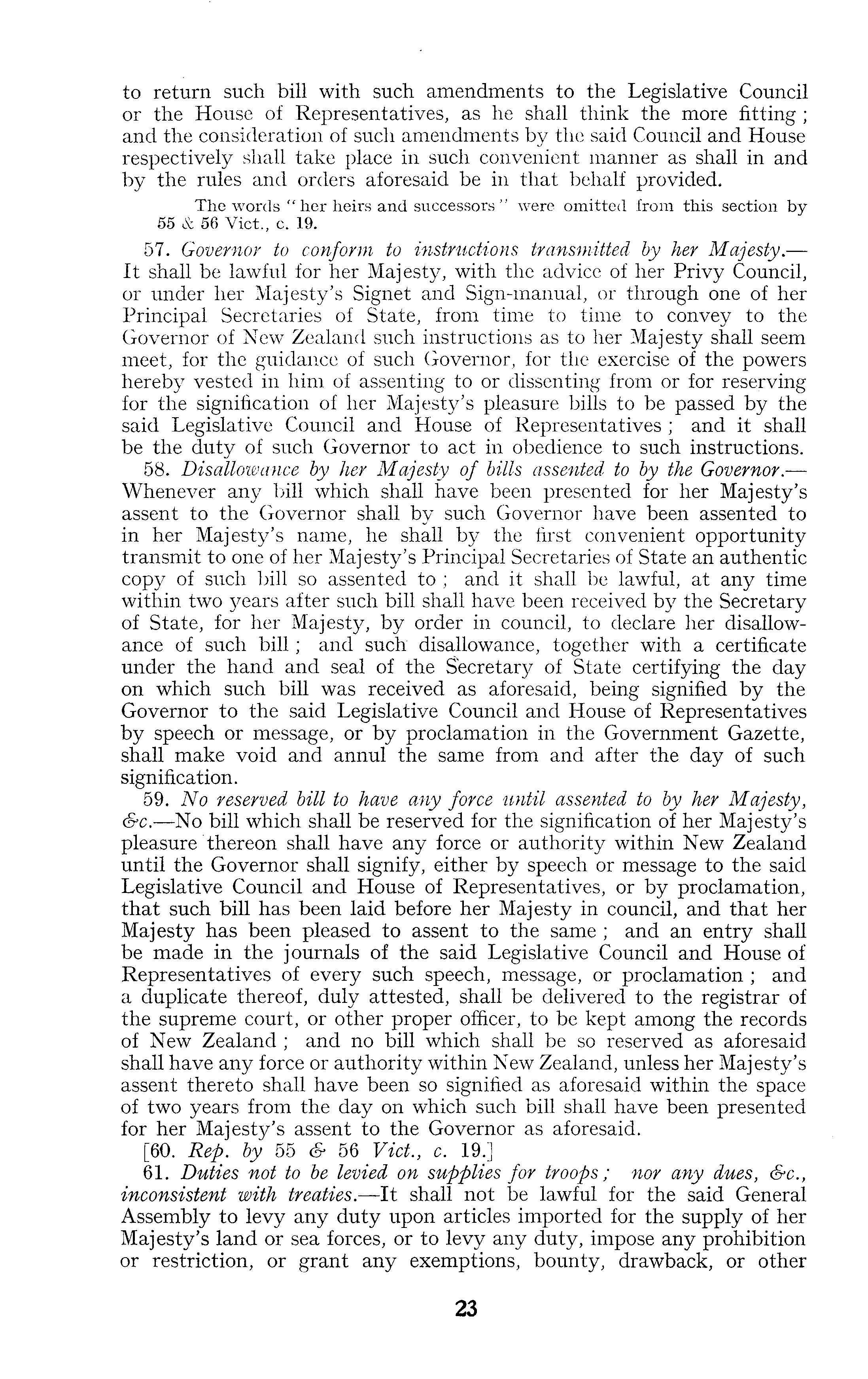 to return such bill with such amendments to the Legislative Council or the House of Representatives, as he shall think the more fitting; and the consideration of such amendments by the said Council and House respectively shall take place in such convenient manner as shall in and by the rules and orders aforesaid be in that behalf provided. The words "her heirs and successors" were omitted from this section by 55 & 56 Vict., c. 19. 57. Governor to conform to instructions transmitted by her Majesty.— It shall be lawful for her Majesty, with the advice of her Privy Council, or under her Majesty's Signet and Sign-manual, or through one of her Principal Secretaries of State, from time to time, to convey to the Governor of New Zealand such instructions as to her Majesty shall seem meet, for the guidance of such Governor, for the exercise of the powers hereby vested in him of assenting to or dissenting from or for reserving for the signification of her Majesty's pleasure bills to be passed by the said Legislative Council and House of Representatives ; and it shall be the duty of such Governor to act in obedience to such instructions. 58. Disallowance by her Majesty of bills assented to by the Governor.— Whenever any bill which shall have been presented for her Majesty's assent to the Governor shall by such Governor have been assented to in her Majesty's name, he shall by the first convenient opportunity transmit to one of her Majesty's Principal Secretaries of State an authentic copy of such bill so assented to ; and it shall be lawful, at any time within two years after such bill shall have been received by the Secretary of State, for her Majesty, by order in council, to declare her disallowance of such bill; and such disallowance, together with a certificate under the hand and seal of the Secretary of State certifying the day on which such bill was received as aforesaid, being signified by the Governor to the said Legislative Council and House of Representatives by speech or message, or by proclamation in the Government Gazette, shall make void and annul the same from and after the day of such signification. 59. No reserved bill to have any force until assented to by her Majesty, &c. —No bill which shall be reserved for the signification of her Majesty's pleasure thereon shall have any force or authority within New Zealand until the Governor shall signify, either by speech or message to the said Legislative Council and House of Representatives, or by proclamation, that such bill has been laid before her Majesty in council, and that her Majesty has been pleased to assent to the same ; and an entry shall be made in the journals of the said Legislative Council and House of Representatives of every such speech, message, or proclamation ; and a duplicate thereof, duly attested, shall be delivered to the registrar of the supreme court, or other proper officer, to be kept among the records of New Zealand ; and no bill which shall be so reserved as aforesaid shall have any force or authority within New Zealand, unless her Majesty's assent thereto shall have been so signified as aforesaid within the space of two years from the day on which such bill shall have been presented for her Majesty's assent to the Governor as aforesaid. [6O. Rep. by 55 & 56 Vict., c. 19.] 61. Duties not to be levied on supplies for troops; nor any dues, &c., inconsistent with treaties. —It shall not be lawful for the said General Assembly to levy any duty upon articles imported for the supply of her Majesty's land or sea forces, or to levy any duty, impose any prohibition or restriction, or grant any exemptions, bounty, drawback, or other