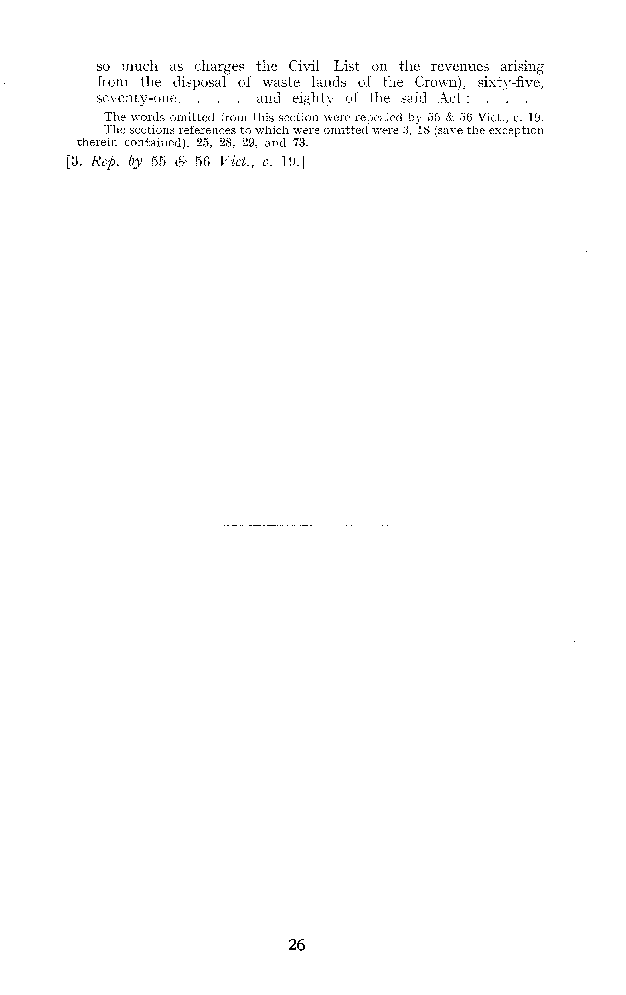 so much as charges the Civil List on the revenues arising from the disposal of waste lands of the Crown), sixty-five, seventy-one, . . . and eighty of the said Act: . . . The words omitted from this section were repealed by 55 & 56 Vict., c. 19. The sections references to which were omitted were 3, 18 (save the exception therein contained), 25, 28, 29, and 73. [3. Rep. by 55 <§■ 56 Vict., c. 19.]