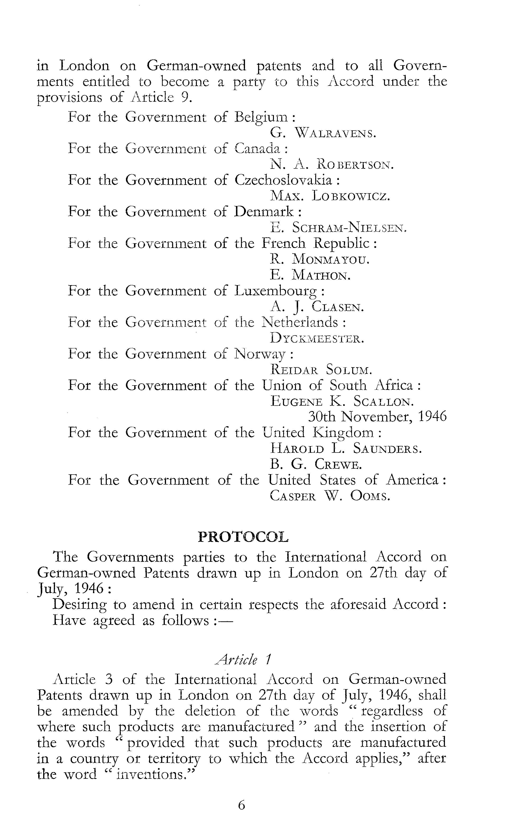 in London on German-owned patents and to all Governments entitled to become a party to this Accord under the provisions of Article 9. For the Government of Belgium: G. Walravens. For the Government of Canada: N. A. Robertson. For the Government of Czechoslovakia: Max. Lobkowicz. For the Government of Denmark: E. Schram-Nielsen. For the Government of the French Republic: R. Monmayou. E. Mathon. For the Government of Luxembourg: A. J. Clasen. For the Government of the Netherlands : Dyckmeester. For the Government of Norway: Reidar Solum. For the Government of the Union of South Africa: Eugene K. Scallon. 30th November, 1946 For the Government of the United Kingdom: Harold L. Saunders. B. G. Crewe. For the Government of the United States of America: Casper W. Ooms. PROTOCOL The Governments parties to the International Accord on German-owned Patents drawn up in London on 27th day of July, 1946 : Desiring to amend in certain respects the aforesaid Accord: Have agreed as follows : Article 1 Article 3 of the International Accord on German-owned Patents drawn up in London on 27th day of July, 1946, shall be amended by the deletion of the words " regardless of where such products are manufactured " and the insertion of the words " provided that such products are manufactured in a country or territory to which the Accord applies," after the word " inventions."