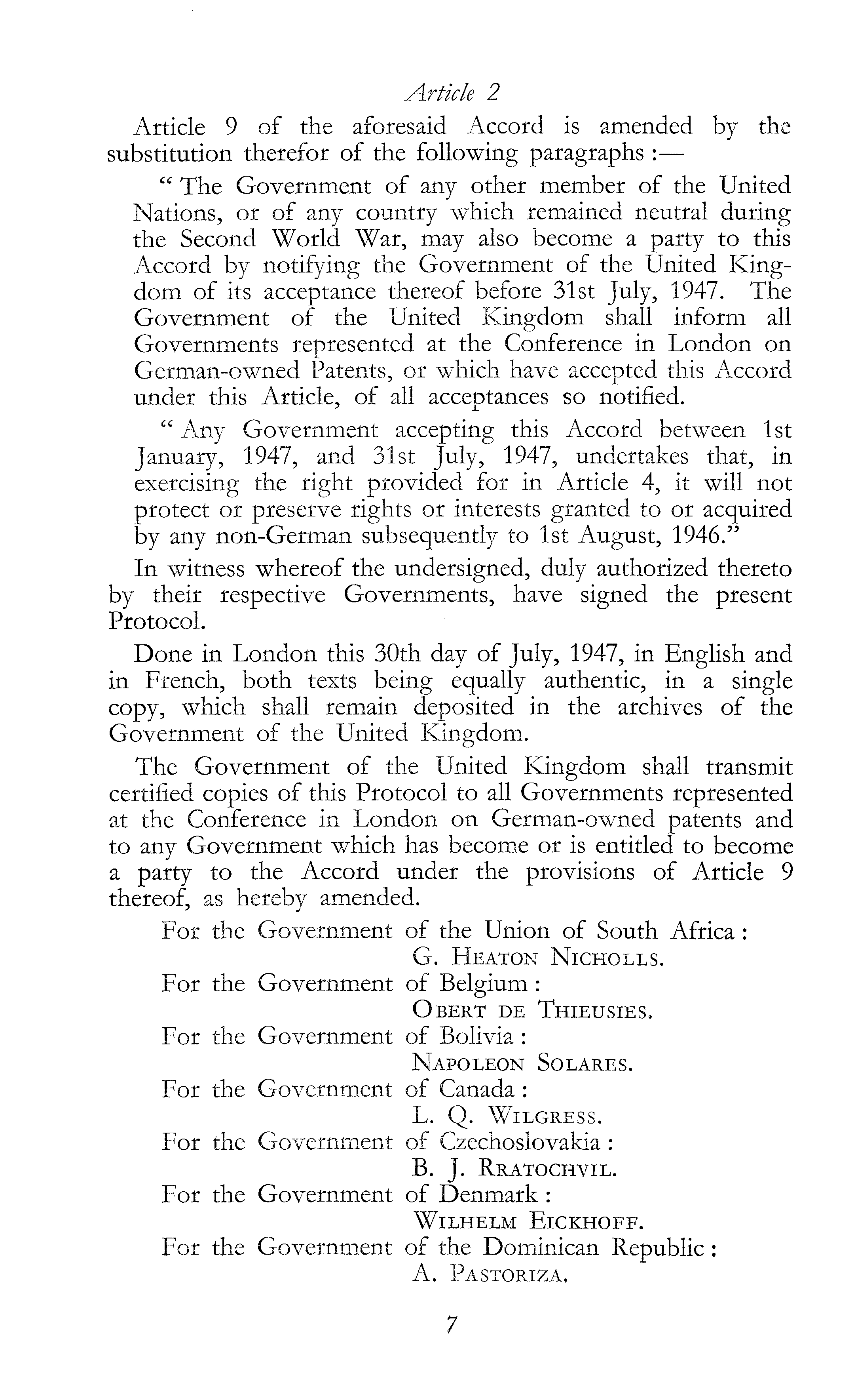 Article 2 Article 9 of the aforesaid Accord is amended by the substitution therefor of the following paragraphs : " The Government of any other member of the United Nations, or of any country which remained neutral during the Second World War, may also become a party to this Accord by notifying the Government of the United Kingdom of its acceptance thereof before 31st July, 1947. The Government of the United Kingdom shall inform all Governments represented at the Conference in London on German-owned Patents, or which have accepted this Accord under this Article, of all acceptances so notified. " Any Government accepting this Accord between Ist January, 1947, and 31st July, 1947, undertakes that, in exercising the right provided for in Article 4, it will not protect or preserve rights or interests granted to or acquired by any non-German subsequently to Ist August, 1946." In witness whereof the undersigned, duly authorized thereto by their respective Governments, have signed the present Protocol. Done in London this 30th day of July, 1947, in English and in French, both texts being equally authentic, in a single copy, which shall remain deposited in the archives of the Government of the United Kingdom. The Government of the United Kingdom shall transmit certified copies of this Protocol to all Governments represented at the Conference in London on German-owned patents and to any Government which has become or is entitled to become a party to the Accord under the provisions of Article 9 thereof, as hereby amended. For the Government of the Union of South Africa: G. Heaton Nicholls. For the Government of Belgium: Obert de Thieusies. For the Government of Bolivia: Napoleon Solares. For the Government of Canada : L. Q. WILGRESS. For the Government of Czechoslovakia: B. J. Rratochvil. For the Government of Denmark: WILHELM EICKHOFF. For the Government of the Dominican Republic: A. Pastoriza,