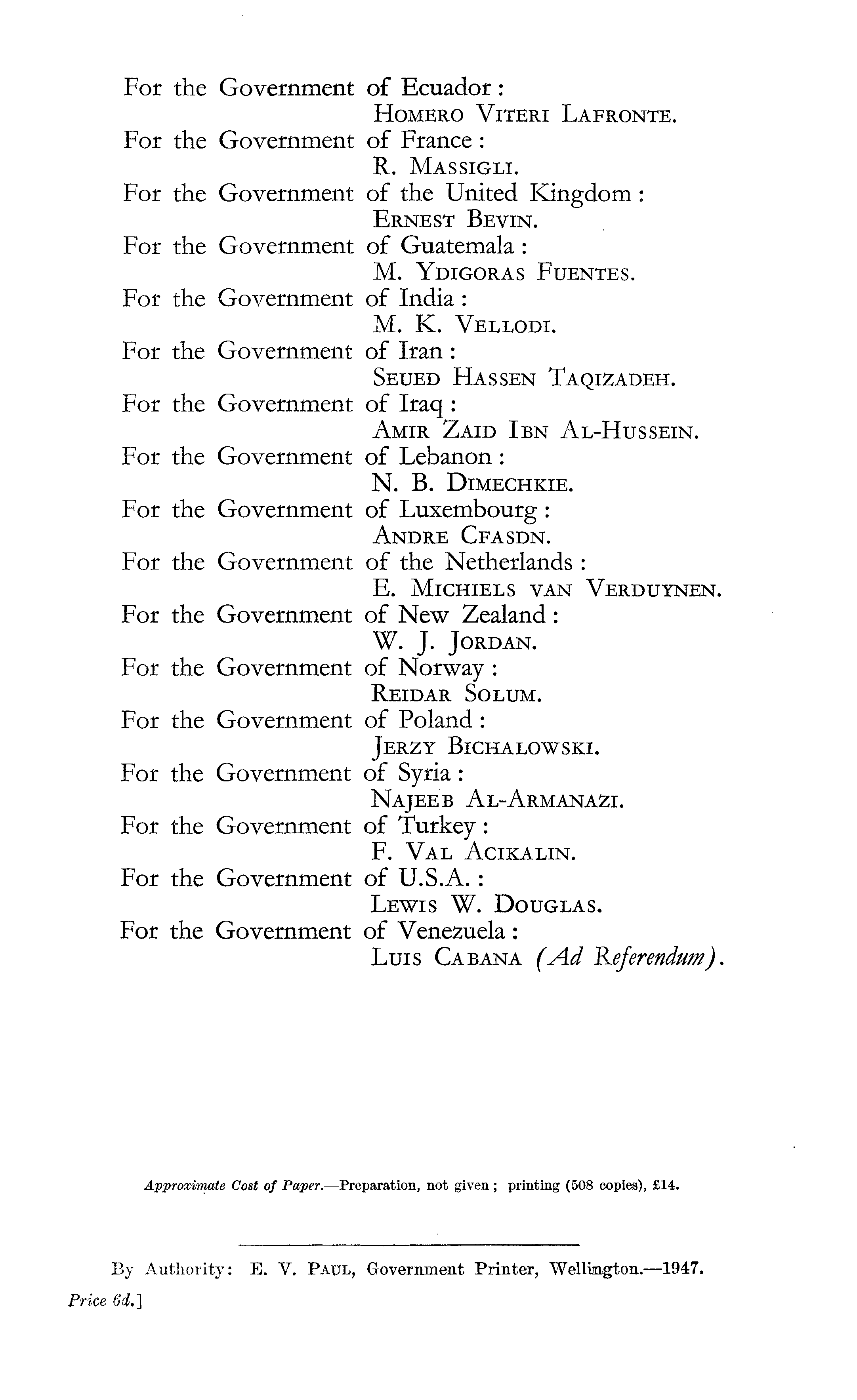 For the Government of Ecuador: Homero Viteri Lafronte. For the Government of France: R. Massigli. For the Government of the United Kingdom: Ernest Bevin. For the Government of Guatemala: M. Ydigoras Fuentes. For the Government of India : M. K. Vellodi. For the Government of Iran: Seued Has sen Taqizadeh. For the Government of Iraq: Amir Zaid Ibn Al-Hussein. For the Government of Lebanon: N. B. Dimechkie. For the Government of Luxembourg: Andre Cfasdn. For the Government of the Netherlands : E. Michiels van Verduynen For the Government of New Zealand: W. J. Jordan. For the Government of Norway : Reidar Solum. For the Government of Poland: Jerzy Bichalowski. For the Government of Syria: Najeeb Al-Armanazi. For the Government of Turkey: F. Val Acikalin. For the Government of U.S.A. : Lewis W. Douglas. For the Government of Venezuela: Luis Cabana (Ad Referendum)