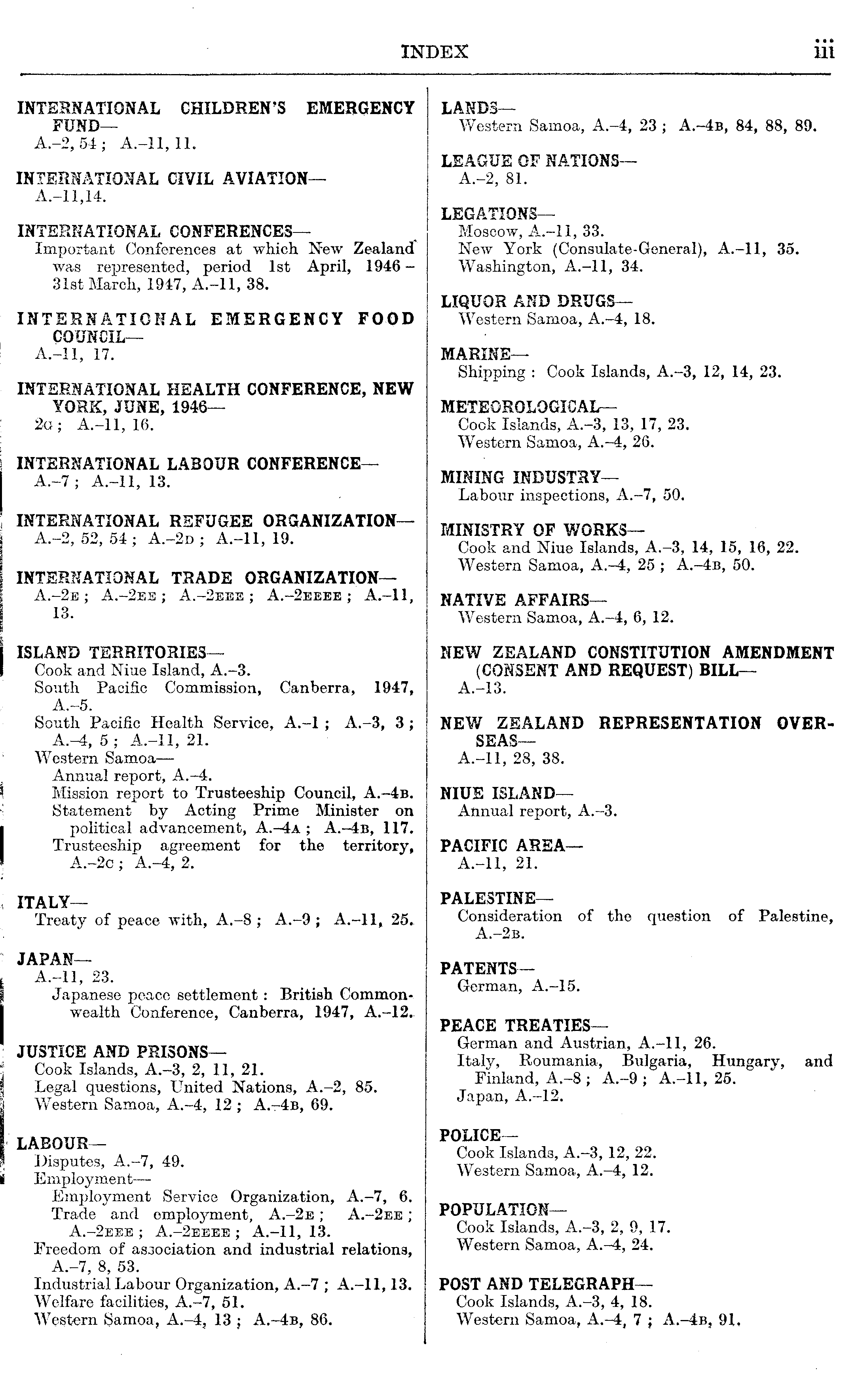 LANDS— Western Samoa, A.-4, 23 ; A.-48, 84, 88, 89. LEAGUE OF NATIONS— A.-2, 81. legationsMoscow, A.-i 1,33. New York (Consulate-General), A.-11, 35. Washington, A.-11, 34. LIQUOR AND DRUGS— Western Samoa, A.-4, 18. MARINE— Shipping : Cook Islands, A.-3, 12, 14, 23. METEOROLOGICAL— Cook Islands, A.-3, 13, 17, 23. Western Samoa, A.-4, 26. MINING INDUSTRY— Labour inspections, A.-7, 50. MINISTRY OF WORKS— Cook and Niue Islands, A.-3, 14, 15, 16, 22. Western Samoa, A.-4, 25 ; A.-4b, 50. NATIVE AFFAIRS— Western Samoa, A.-4, 6, 12. NEW ZEALAND CONSTITUTION AMENDMENT (CONSENT AND REQUEST) BILL— A.-13. NEW ZEALAND REPRESENTATION OVERSEAS— A.-11, 28, 38. NIUE ISLAND— Annual report, A.-3. PACIFIC AREA— A.-11, 21. PALESTINE— Consideration of the question of Palestine, A.-28. PATENTS— German, A.-15. PEACE TREATIES— German and Austrian, A.-11, 26. Italy, Roumania, Bulgaria, Hungary, and Finland, A.-8 ; A.-9 ; A.-11, 25. Japan, A.-12. POLICE— Cook Islands, A.-3, 12, 22. Western Samoa, A.-4, 12. POPULATION— Cook Islands, A.-3, 2, 9, 17. Western Samoa, A.-4, 24. POST AND TELEGRAPH— Cook Islands, A.-3, 4, 18. Western Samoa, A.-4, 7 ; A.-4b, 91,