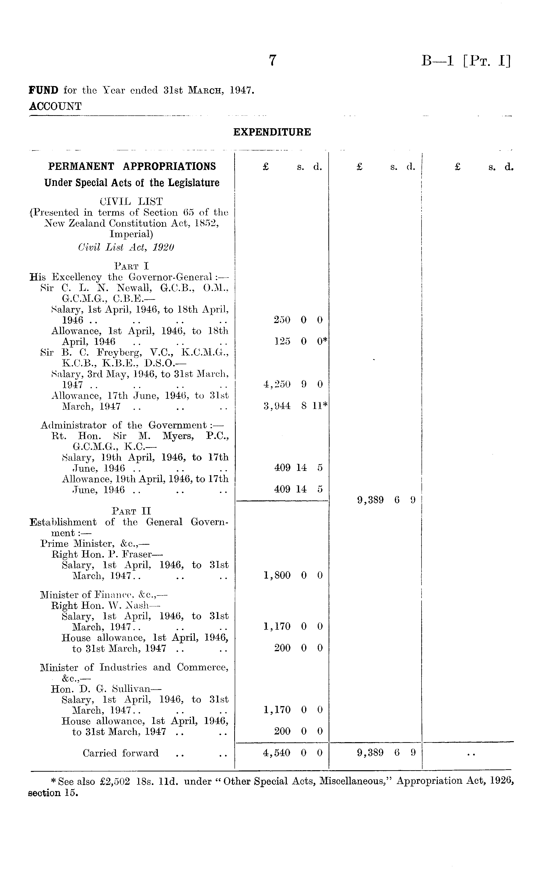 EXPENDITURE PERMANENT APPROPRIATIONS £ s. d. r d m £ a. d. Under Special Acts of the Legislature CIVIL LIST {Presented in terms of Section 65 of the New Zealand Constitution Act, 1852, Imperial) Civil List Act, 1920 Part I His Excellency the Governor-General:— Sir C. L. N. Newall, G.C.B., O.M., G.C.M.G., C.B.E. — Salary, 1st April, 1946, to 18th April, 1946 .. 250 0 0 Allowance, 1st April, 1946, to 18th April, 1946 .. 125 0 0* Sir B. C. Freyberg, V.C., K.C.M.G., K.C.B., K.B.E., D.S.O. — Salary, 3rd May, 1946, to 31st March, 1947 .. 4,250 9 0 Allowance, 17th June, 1946, to 31st March, 1947 .. 3,944 8 11* Administrator of the Government:— Rt. Hon. Sir M. Myers, P.C., G.C.M.G., K.C. — Salary, 19th April, 1946, to 17th " June, 1946 409 14 5 Allowance, 19th April, 1946, to 17th June, 1946 .. 409 14 5 9,389 6 9 Pakt II Establishment of the General Government :— Prime Minister, &c., — Right Hon. P. Fraser— Salary, 1st April, 1946, to 31st March, 1947 1,800 0 0 Minister of Finance, &c., — Right Hon. W. Nash — 1 Salary, 1st April, 1946, to 31st March, 1947 1,170 0 0 House allowance, 1st April, 1946, to 31st March, 1947 200 0 0 Minister of Industries and Commerce, &c., — Hon. D. G. Sullivan— Salary, 1st April, 1946, to 31st March, 1947 1,170 0 0 House allowance, 1st April, 1946, to 31st March, 1947 200 0 0 Carried forward 4,540 0 0 9,389 6 9 ••