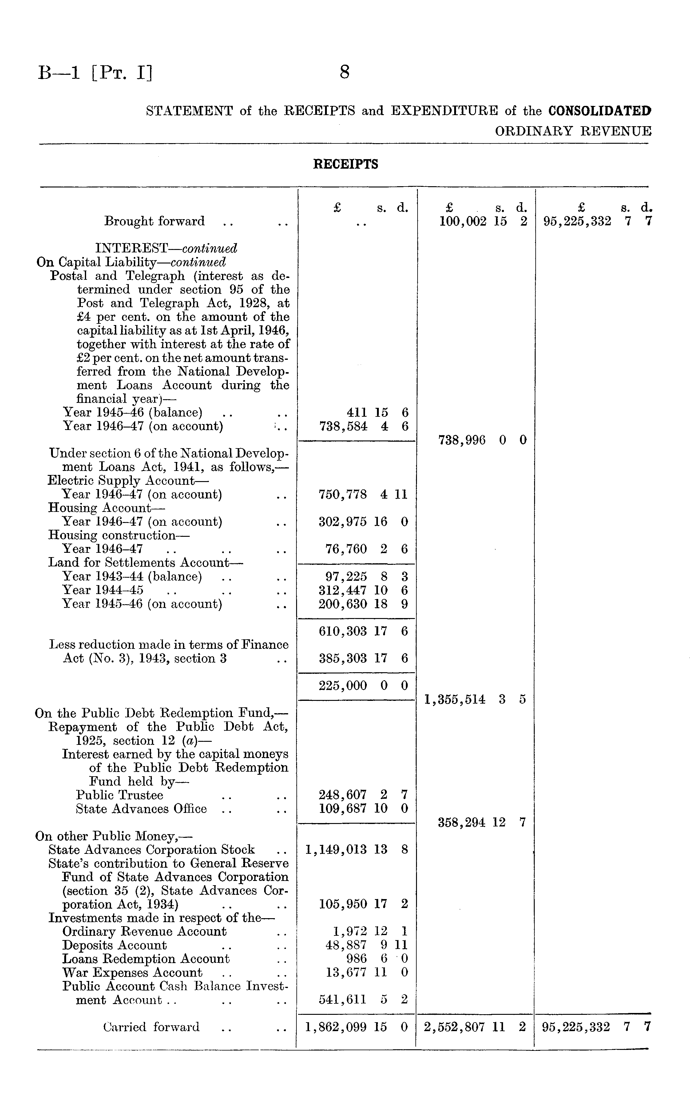 RECEIPTS £ s. d. £ s. d. £ s. d. Brought forward 100,002 15 2 95,225,332 7 7 INTEREST—continued On Capital Liability—continued Postal and Telegraph (interest as determined under section 95 of the Post and Telegraph Act, 1928, at £4 per cent, on the amount of the capital liability as at 1st April, 1946, together with interest at the rate of £2 per cent, on the net amount transferred from the National Development Loans Account during the financial year)— Year 1945-46 (balance) 411 15 6 Year 1946-47 (on account) . 738,584 4 6 70Q QQft ft ft I OO 5 W\J \J \J Under section 6 of the National Development Loans Act, 1941, as follows, — Electric Supply Account — Year 1946-47 (on account) 750,778 4 11 Housing Account— Year 1946-47 (on account) 302,975 16 0 Housing construction — Year 1946-47 .. 76,760 2 6 T.a.nrl for SpttlpTYipnfsi A fponnt. JLUX kJO U U1U111 Dllto xXl/uUUUU Year 1943-44 (balance) 97,225 8 3 Year 1944-45 312,447 10 6 Year 1945-46 (on account) 200,630 18 9 610,303 17 6 Less reduction made in terms of Finance Act (No. 3), 1943, section 3 385,303 17 6 225,000 0 0 1,355,514 3 5 On the Public Debt Redemption Fund, — Repayment of the Public Debt Act, 1925, section 12 (a) — Interest earned by the capital moneys of the Public Debt Redemption Fund held by— Public Trustee 248,607 2 7 State Advances Office 109,687 10 0 358,294 12 7 On other Public Money,— State Advances Corporation Stock 1,149,013 13 8 State's contribution to General Reserve Fund of State Advances Corporation (section 35 (2), State Advances Corporation Act, 1934) 105,950 17 2 Investments made in respect of the— Ordinary Revenue Account 1,972 12 1 Deposits Account 48,887 9 11 Loans Redemption Account 986 6 0 War Expenses Account 13,677 11 0 Public Account Cash Balance Investment Account 541,611 5 2 Carried forward 1,862,099 15 0 2,552,807 11 2 95,225,332 7 7