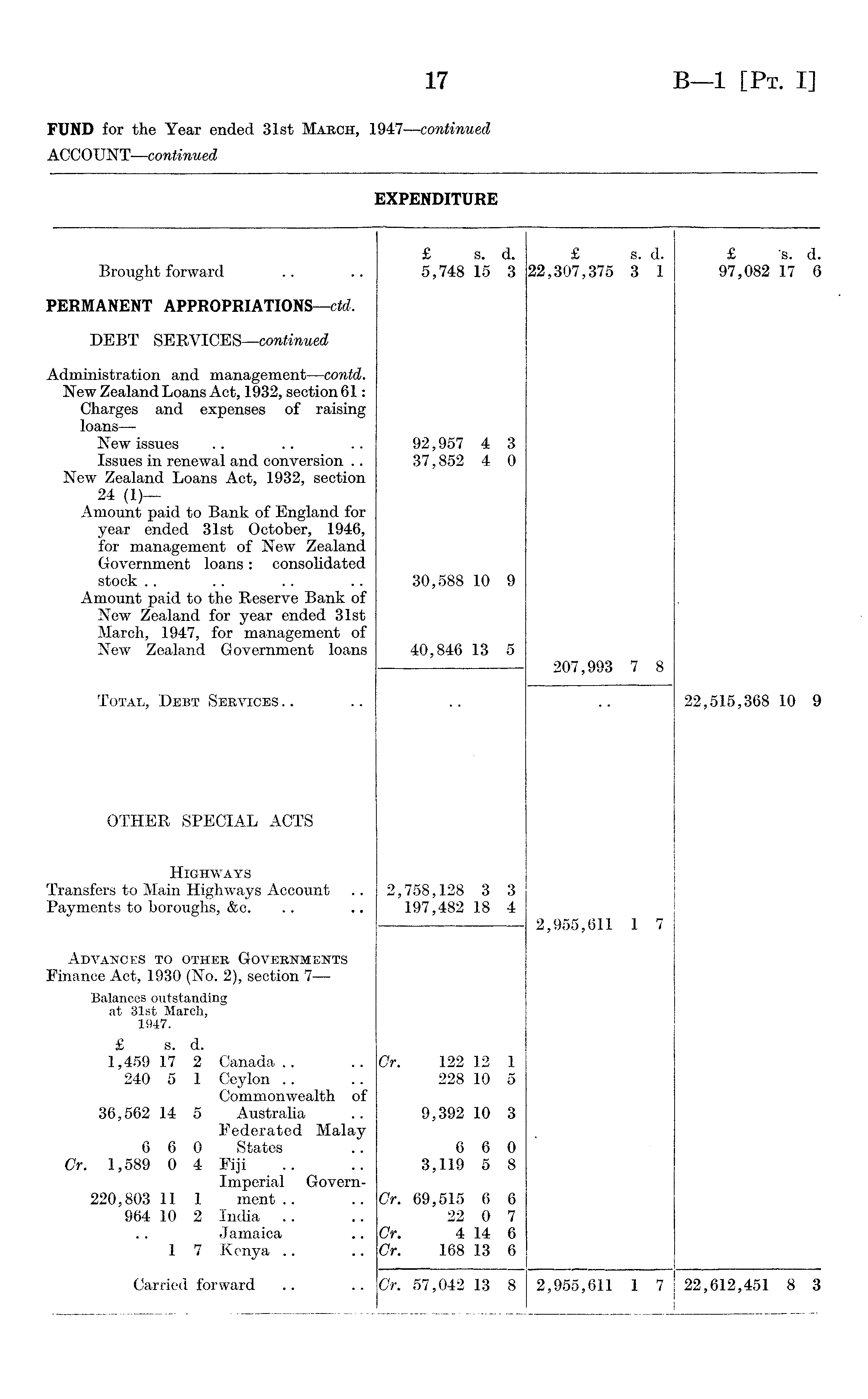EXPENDITURE £ s. d. £ s. d. £ "fe. d. Brought forward 5,748 15 3 22,307,375 3 1 97,082 17 6 PERMANENT APPROPRIATIONS —ctd. DEBT SERVICES—continued Administration and management —contd. New Zealand Loans Act, 1932, section 61: Charges and expenses of raising loans— New issues 92,957 4 3 Issues in renewal and conversion .. 37,852 4 0 New Zealand Loans Act, 1932, section 24 (1)Amount paid to Bank of England for year ended 31st October, 1946, for management of New Zealand Government loans: consolidated stock 30,588 10 9 Amount paid to the Reserve Bank of New Zealand for year ended 31st March, 1947, for management of New Zealand Government loans 40,846 13 5 907 QQ3 7 8 1 , WO i o Total, Debt Services 22,515,368 10 9 OTHER SPECIAL ACTS Highways Transfers to Main Highways Account 2,758,128 3 3 Payments to boroughs, &c. 197,482 18 4 2,955,611 1 7 - Advances to other Governments Finance Act, 1930 (No. 2), section 7— Balances outstanding at 31st March, 1947. £ s. d. 1,459 17 2 Canada.. Cr. 122 12 1 240 5 1 Ceylon 228 10 5 Commonwealth of 36,562 14 5 Australia 9,392 10 3 Federated Malay 6 6 0 States 6 6 0 Cr. 1,589 0 4 Fiji 3,119 5 8 Imperial Govern220,803 11 1 ment .. Cr. 69,515 6 6 964 10 2 India .. 22 0 7 Jamaica Cr. 4 14 6 1 7 Kenya Cr. 168 13 6 Carried forward Gr. 57,042 13 8 2,955,611 1 7 22,612,451 8 3