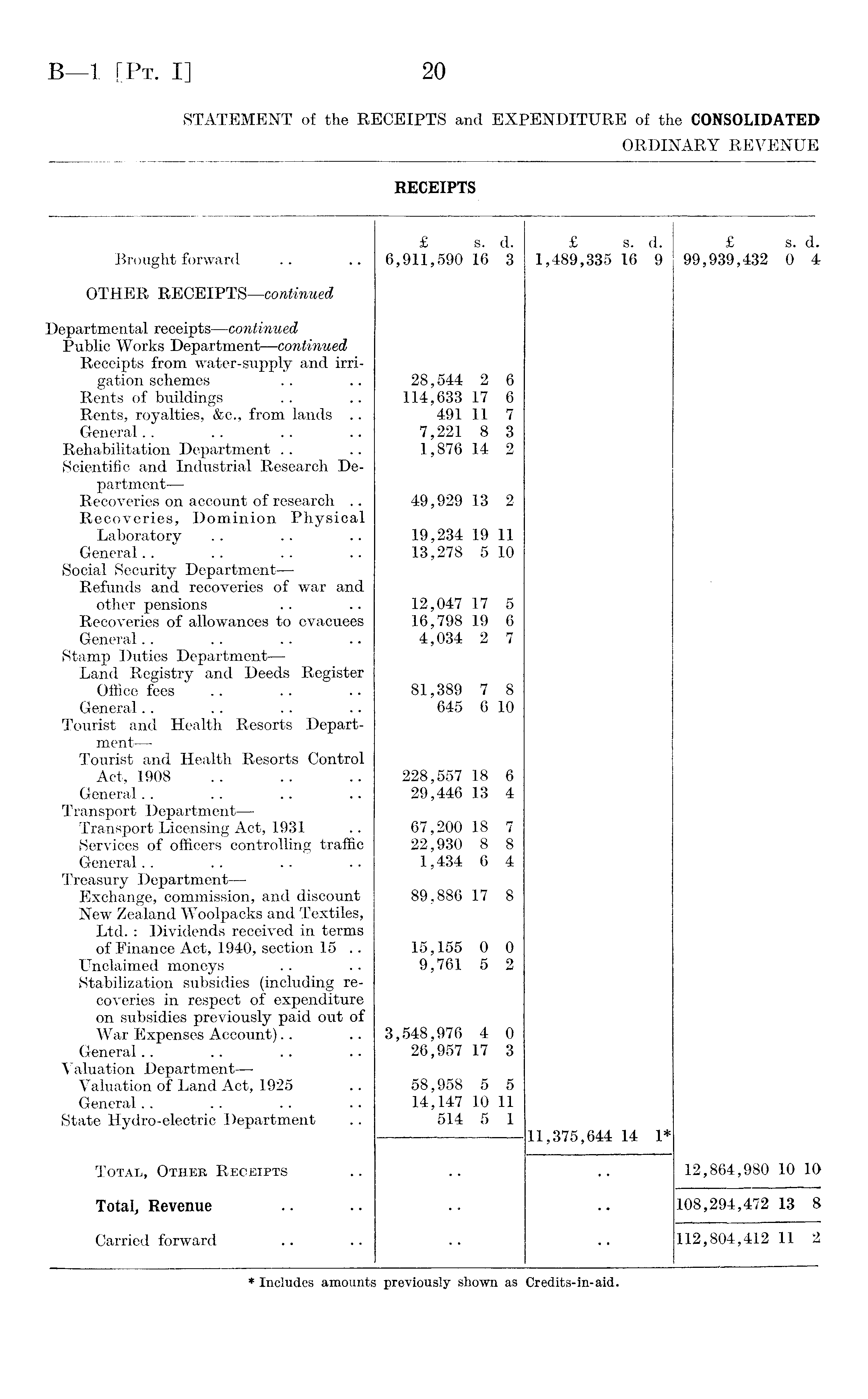 RECEIPTS £ s. d. £ s. d. £ s. d. Brought forward 6,911,590 16 3 1,489,335 16 9 99,939,432 0 4 OTHER RECEIPTS—continued Departmental receipts—continued Public Works Department—continued Receipts from water-supply and irrigation schemes 28,544 2 6 Rents of buildings 114,633 17 6 Rents, royalties, &c., from lands .. 491 11 7 General 7,221 8 3 Rehabilitation Department 1,876 14 2 Scientific and Industrial Research partment—Recoveries on account of research .. 49,929 13 2 Recoveries, Dominion Physical Laboratory 19,234 19 11 General 13,278 5 10 Social Security Department— Refunds and recoveries of war and other pensions 12,047 17 5 Recoveries of allowances to evacuees 16,798 19 6 General 4,034 2 7 Stamp Duties Department— Land Registry and Deeds Register Office fees 81,389 7 8 General 645 6 10 Tourist and Health Resorts Department— Tourist and Health Resorts Control Act, 1908 228,557 18 6 General 29,446 13 4 Transport Department— Transport Licensing Act, 1931 67,200 18 7 Services of officers controlling traffic 22,930 8 8 General 1,434 6 4 Treasury Department— Exchange, commission, and discount 89,886 17 8 New Zealand Woolpacks and Textiles, Ltd. : Dividends received in terms of Finance Act, 1940, section 15 .. 15,155 0 0 Unclaimed moneys 9,761 5 2 Stabilization subsidies (including recoveries in respect of expenditure on subsidies previously paid out of War Expenses Account) 3,548,976 4 0 General 26,957 17 3 Valuation Department— Valuation of Land Act, 1925 58,958 5 5 General 14,147 10 11 State Hydro-electric Department 514 5 1 11 fi44- 14- 1* XX UTt IT X Total, Other Receipts 12,864,980 10 10 Total, Revenue • • 108,294,472 13 8 Carried forward 112,804,412 11 2 * Includes amounts previously shown as Cr edits-in-aid.