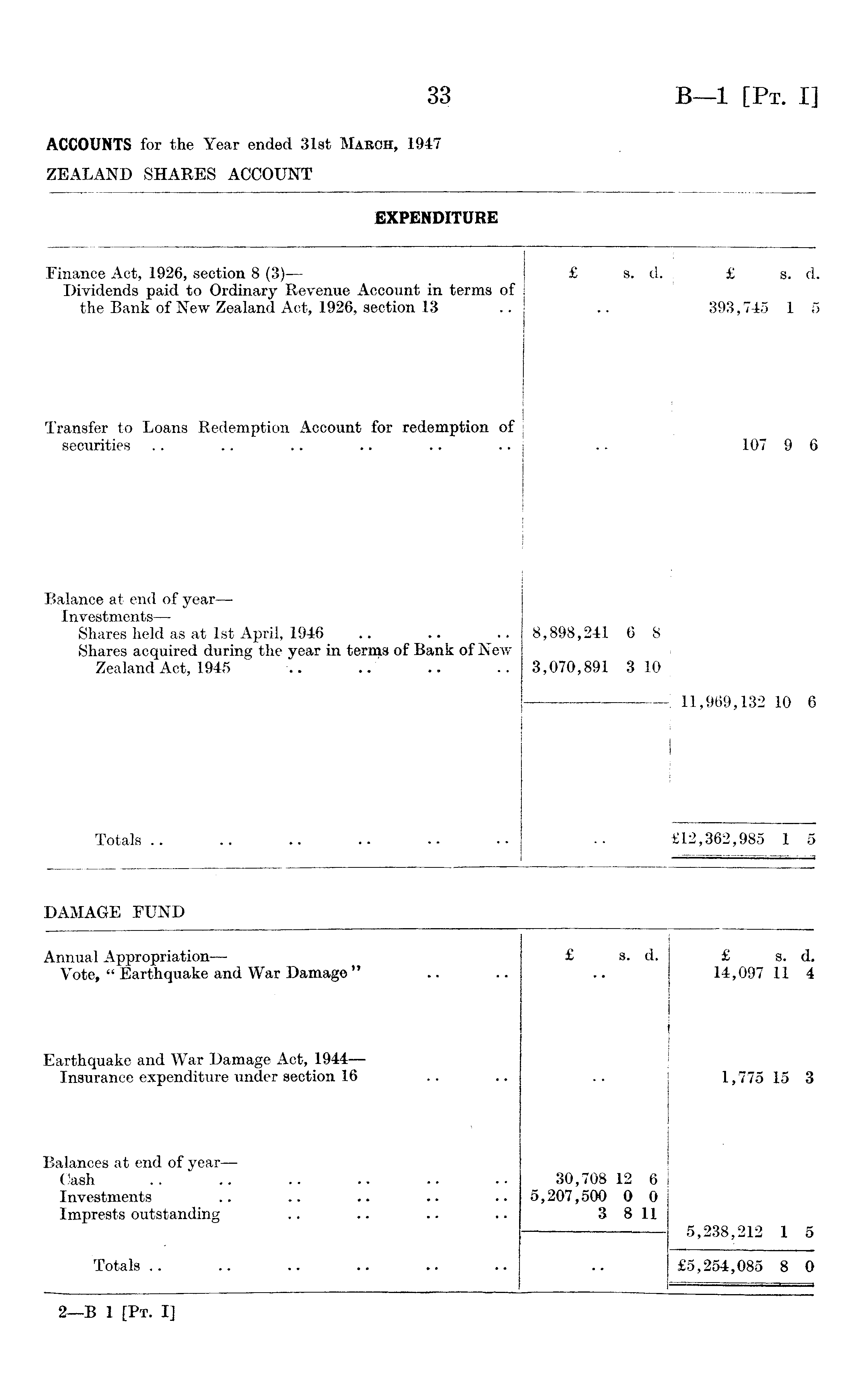 ZEALAND SHARES ACCOUNT EXPENDITURE Finance Act, 1926, section 8 (3) — Dividends paid to Ordinary Revenue Account in terms of the Bank of New Zealand Act, 1926, section 13 £ s. d. £ s. 393,745 1 d. 5 Transfer to Loans Redemption Account for redemption of securities 107 9 t r 6 Balance at end of year— Investments — Shares held as at 1st April, 1946 Shares acquired during the year in terms of Bank of New Zealand Act, 1945 1 8,898,241 3,070,891 6 3 8 10 | 11,969,132 10 A o Totals £12,362,985 1 5 DAMAGE FUND Annual Appropriation — Vote, " Earthquake and War Damage " £ s. d. £ s. 14,097 11 d. 4 Earthquake and War Damage Act, 1944 — Insurance expenditure under section 16 1,775 15 3 Balances at end of year— Cash Investments Imprests outstanding 30,708 12 6 5,207,500 0 0 3 8 11 5,238,212 1 5 Totals £5,254,085 8 0