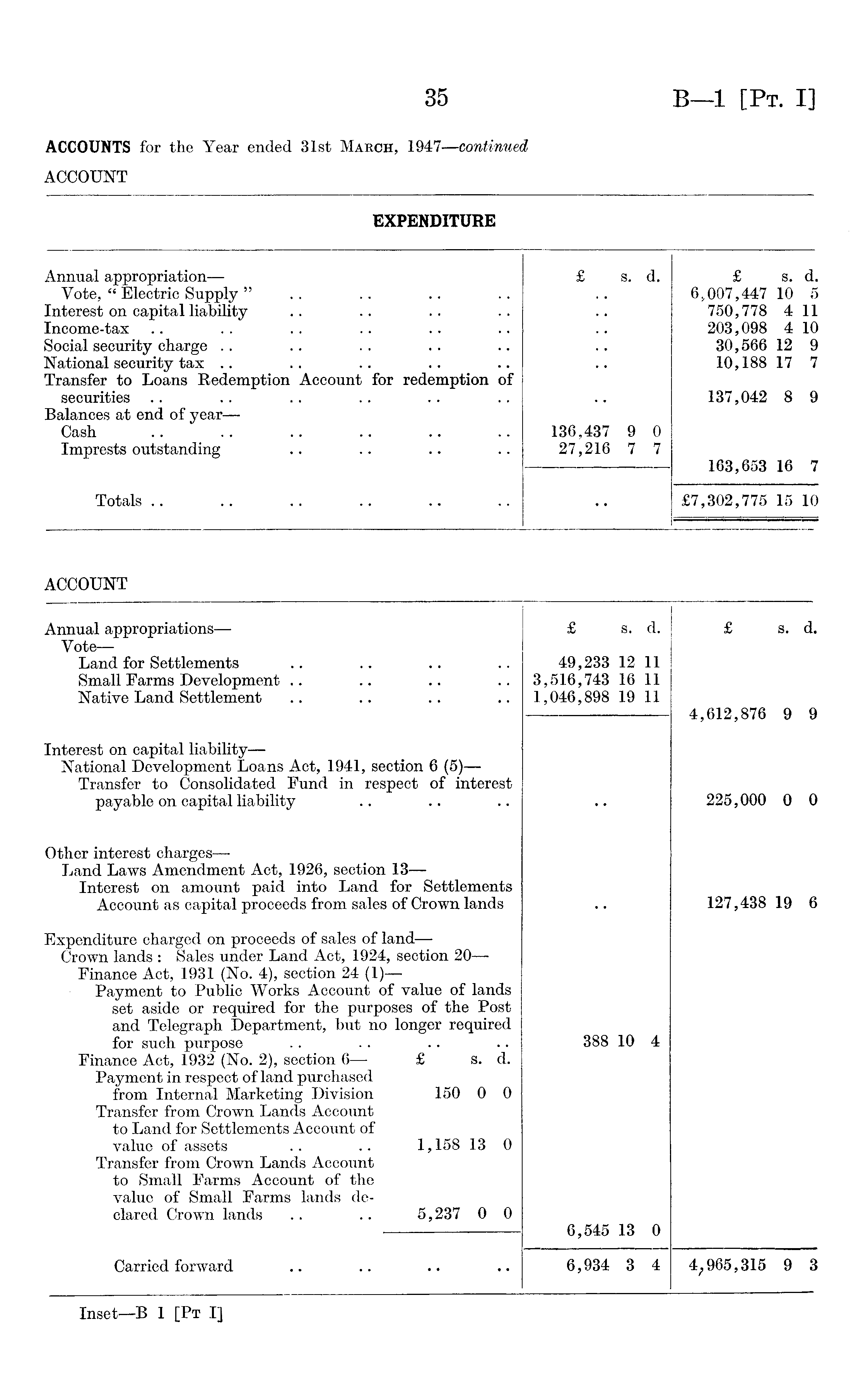 ACCOUNT EXPENDITURE Annual appropriation— Vote, " Electric Supply " Interest on capital liability .. Income-tax Social security charge National security tax Transfer to Loans Redemption Account for redemption of securities Balances at end of year— Cash Imprests outstanding Totals £ s. d. 136,437 9 0 27,216 7 7 £ s. d. 6,007,447 10 5 750,778 4 11 203,098 4 10 30,566 12 9 10,188 17 7 137,042 8 9 163,653 16 7 £7,302,775 15 10 ACCOUNT Annual appropriations — Vote — Land for Settlements Small Farms Development Native Land Settlement Interest on capital liability— National Development Loans Act, 1941, section 6 (5) — Transfer to Consolidated Fund in respect of interest payable on capital liability Other interest charges— Land Laws Amendment Act, 1926, section 13— Interest on amount paid into Land for Settlements Account as capital proceeds from sales of Crown lands Expenditure charged on proceeds of sales of land — Crown lands : Sales under Land Act, 1924, section 20— Finance Act, 1931 (No. 4), section 24 (1) — Payment to Public Works Account of value of lands set aside or required for the purposes of the Post and Telegraph Department, but no longer required for such purpose Finance Act, 1932 (No. 2), section 6— £ s. d. Payment in respect of land purchased from Internal Marketing Division 150 0 0 Transfer from Crown Lands Account to Land for Settlements Account of value of assets .. .. 1,158 13 0 Transfer from Crown Lands Account to Small Farms Account of the value of Small Farms lands declared Crown lands .. .. 5,237 0 0 £ s. d. 49,233 12 11 3,516,743 16 11 1,046,898 19 11 £ s. d. 4,612,876 9 9 225,000 0 0 127,438 19 6 388 10 4 6,545 13 0 Carried forward 6,934 3 4 4,965,315 9 3