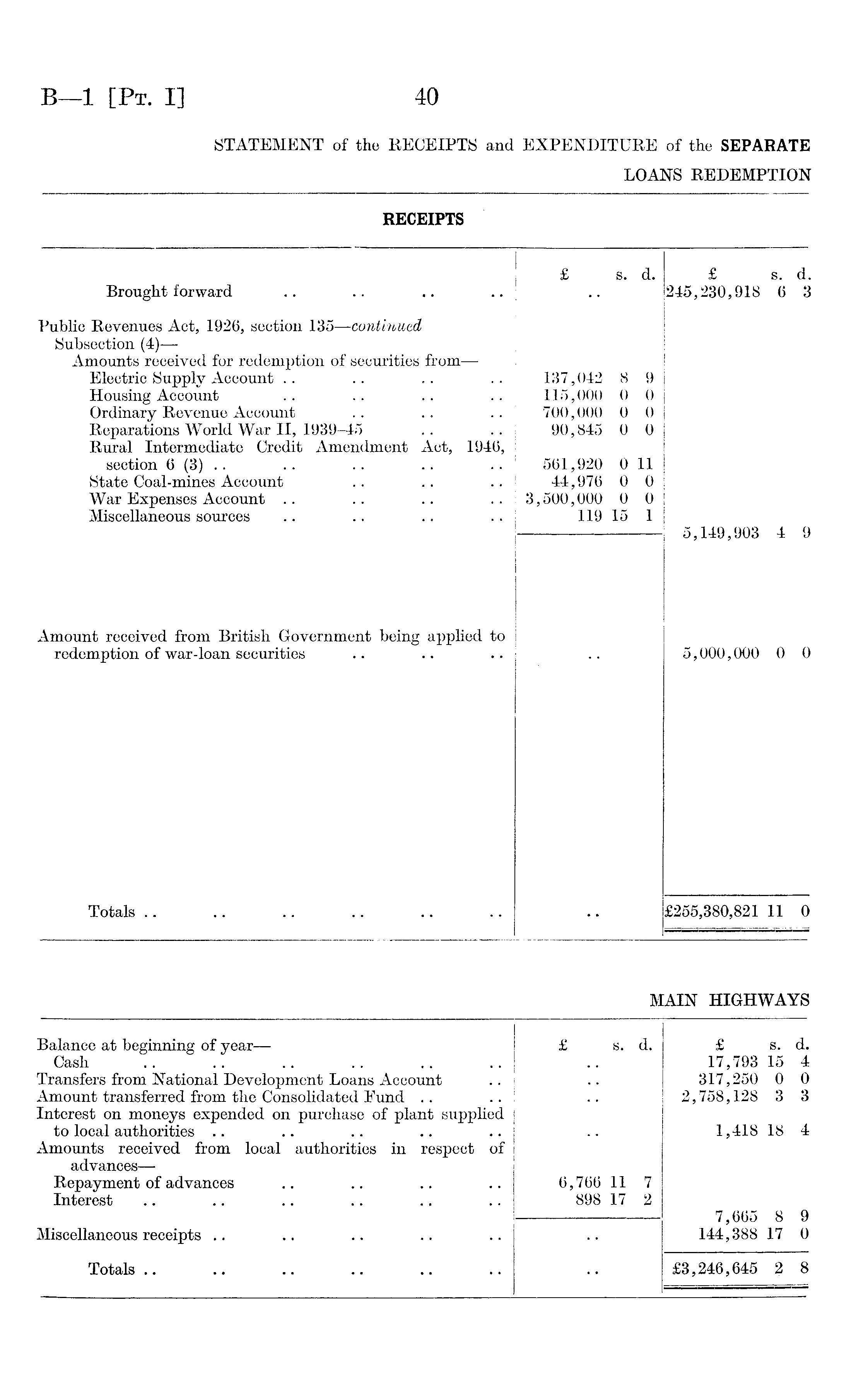 LOANS REDEMPTION RECEIPTS £ s. d. £ s. d. Brought forward 245,230,918 6 3 Public Revenues Act, 1926, section 135 —continued Subsection (4) — Amounts received for redemption of securities from—• Electric Supply Account .. .. .. ... 137,042 8 9 Housing Account 115,000 0 0 Ordinary Revenue Account 700,000 0 0 Reparations World War II, 1939-45 90,845 0 0 Rural Intermediate Credit Amendment Act, 1946, section 6 (3) . . N .. 561,920 0 11 State Coal-mines Account 44,976 0 0 War Expenses Account 3,500,000 0 0 Miscellaneous sources 119 15 1 5,149,903 4 9 Amount received from British Government being applied to redemption of war-loan securities 5,000,000 0 0 Totals £255,380,821 11 0 MAIN HIGHWAYS Balance at beginning of year— £ s. d. £ s. d. Cash 17,793 15 4 Transfers from National Development Loans Account 317,250 0 0 Amount transferred from the Consolidated Fund 2,758,128 3 3 Interest on moneys expended on purchase of plant supplied to local authorities 1,418 18 4 Amounts received from local authorities in respect of advancesRepayment of advances 6,766 11 7 Interest 898 17 2 7,665 8 9 Miscellaneous receipts 144,388 17 0 Totals £3,246,645 2 8