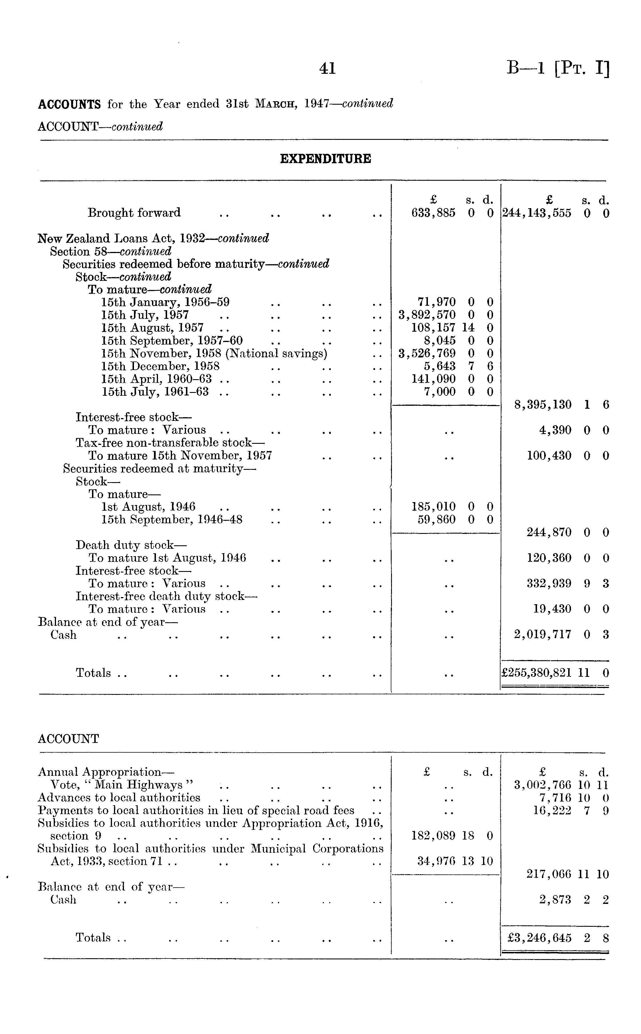 ACCOUNT—continued EXPENDITURE £ s. d. £ s. d. Brought forward 633,885 0 0 244,143,555 0 0 New Zealand Loans Act, 1932—continued Section 58—continued Securities redeemed before maturity—continued Stock —continued To mature—continued 15th January, 1956-59 71,970 0 0 15th July, 1957 3,892,570 0 0 15th August, 1957 108,157 14 0 15th September, 1957-60 8,045 0 0 15th November, 1958 (National savings)3,526,769 0 0 15th December, 1958 5,643 7 6 15th April, 1960-63 141,090 0 0 15th July, 1961-63 7,000 0 0 8 WC 130 1 R OjoyOjiou l o Interest-free stock — To mature: Various 4,390 0 0 Tax-free non-transferable stock— To mature 15th November, 1957 100,430 0 0 Securities redeemed at maturity— Stock — To mature — 1st August, 1946 185,010 0 0 15th September, 1946-48 59,860 0 0 94.4. 870 0 0 jOlU U \J Death duty stock — To mature 1st August, 1946 120,360 0 0 Interest-free stock — To mature: Various 332,939 9 3 Interest-free death duty stock— To mature: Various 19,430 0 0 Balance at end of year — Cash 2,019,717 0 3 Totals £255,380,821 11 0 ACCOUNT Annual Appropriation— £ s. d. £ s. d. Vote, " Main Highways " 3,002,766 10 11 Advances to local authorities 7,716 10 0 Payments to local authorities in lieu of special road fees 16,222 7 9 Subsidies to local authorities under Appropriation Act, 1916, section 9 182,089 18 0 Subsidies to local authorities under Municipal Corporations Act, 1933, section 71 .. 34,976 13 10 917 11 in 41 I,UOO 11 1U Balance at end of year— Cash 2,873 2 2 Totals £3,246,645 2 8